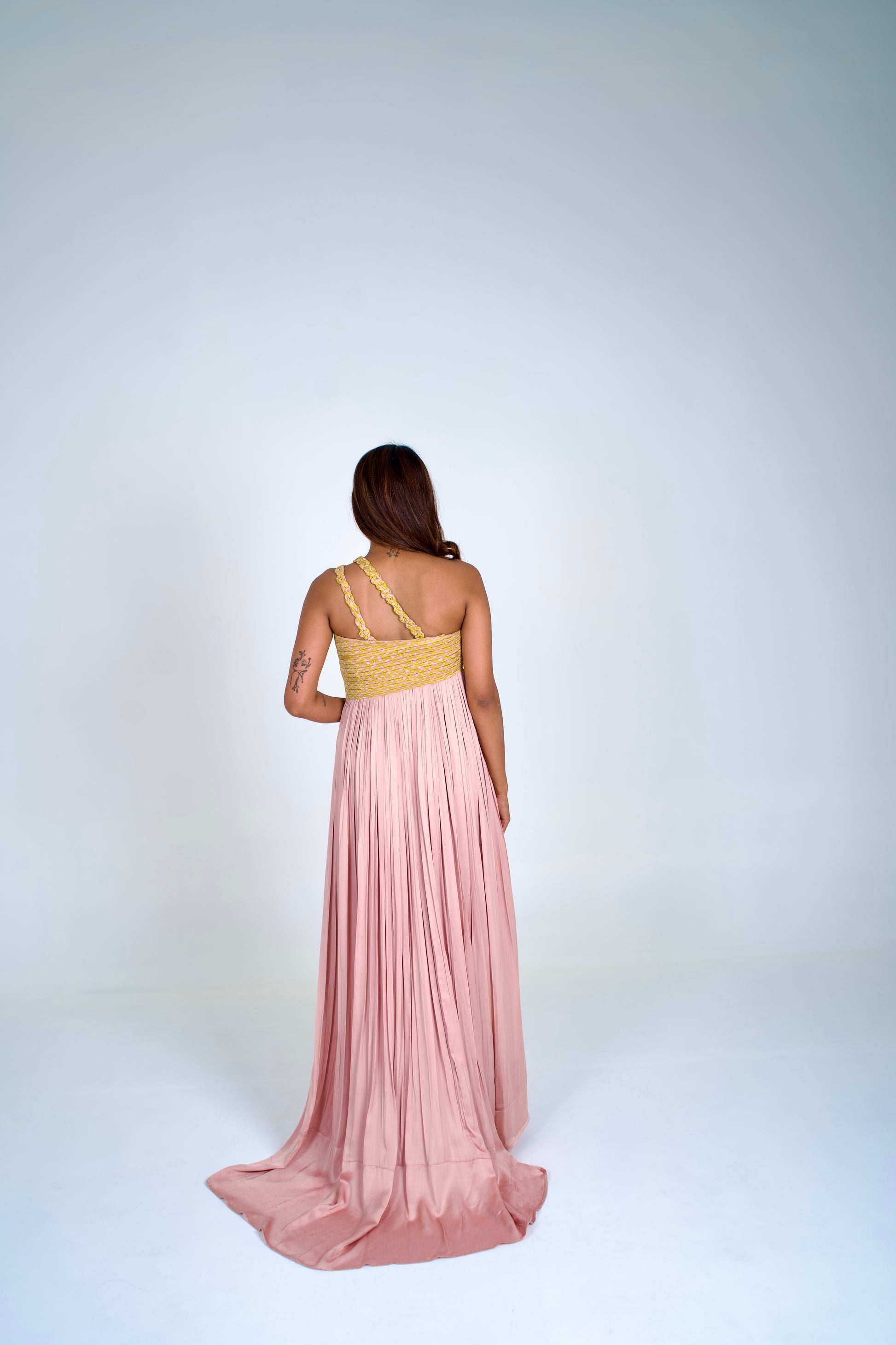 Pink-Yellow Braided Bustier Gather Gown; Bustier with braid detailings; Front- Full Length; Back- Longer than front; Braided sleeve string