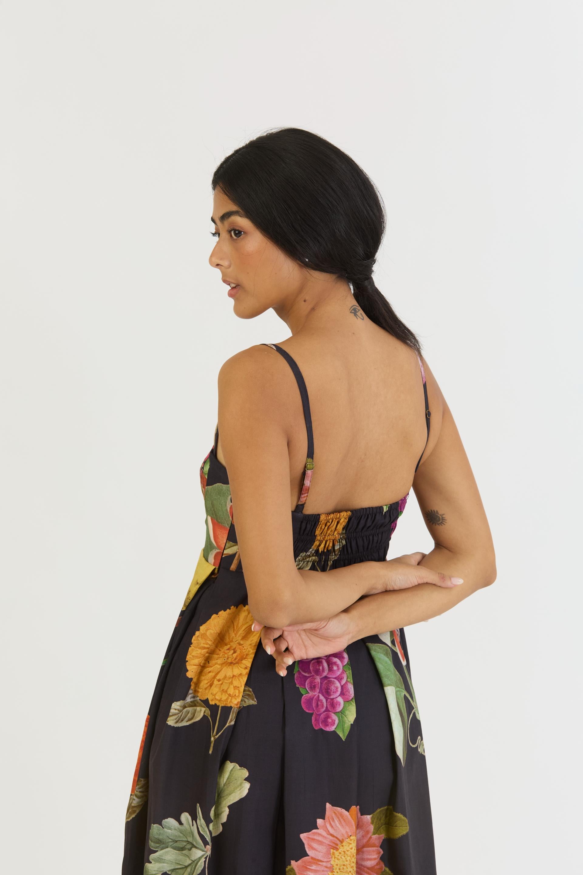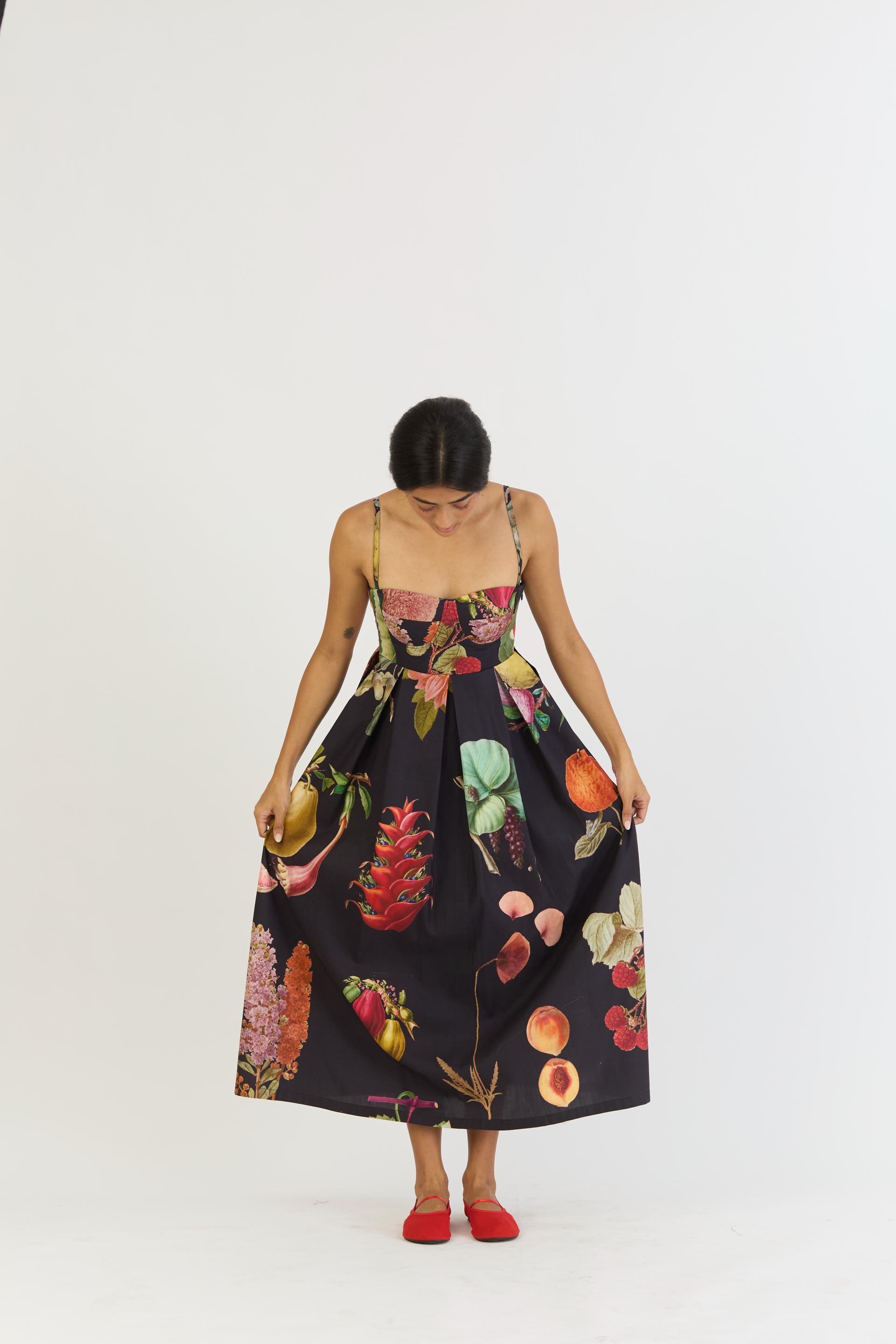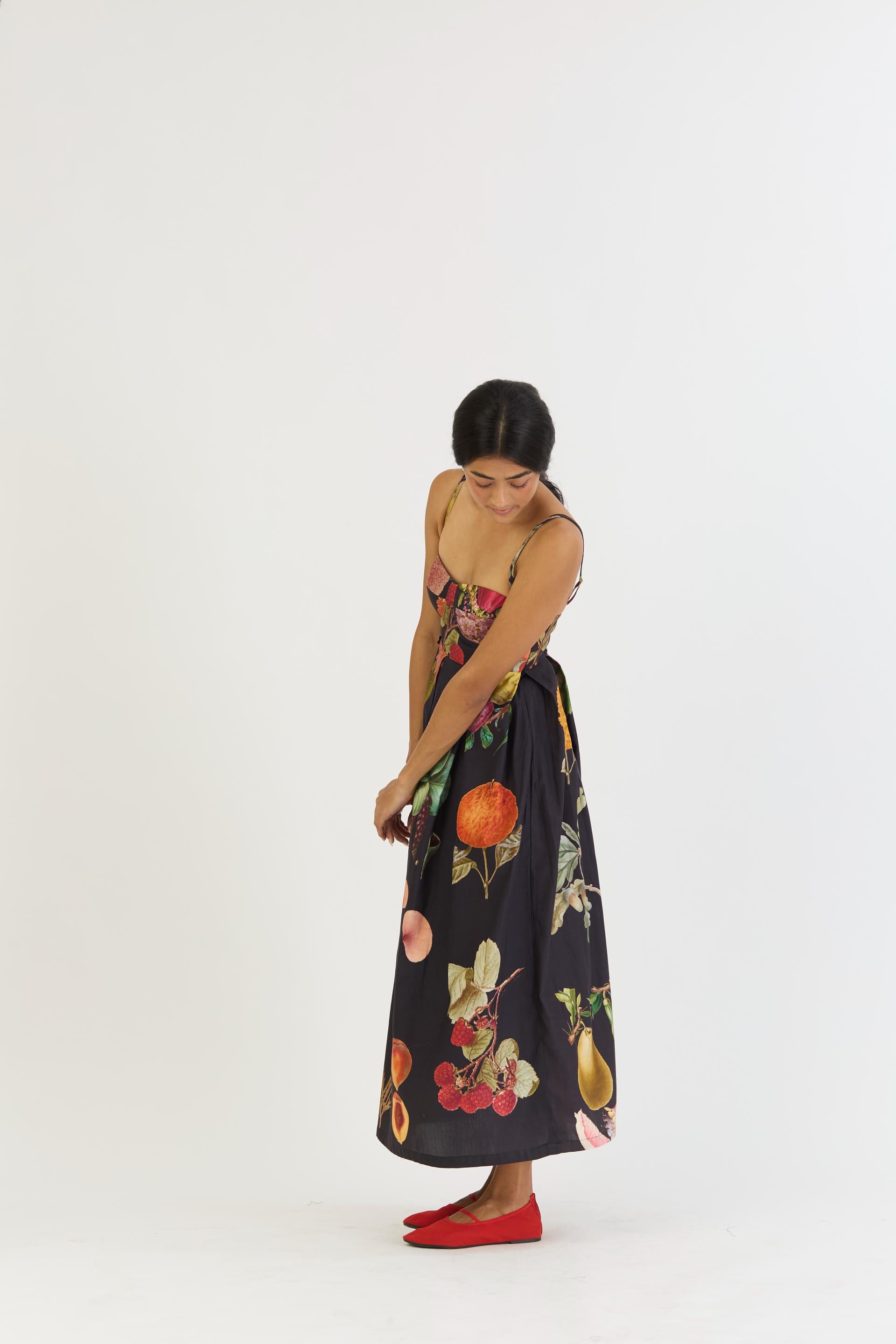 The enchanting Plum print, a breathtaking collection inspired by an old botanical tapestry. This exquisite design showcases watercolor florals, fruits, and leaves playfully dancing against a serene black background, evoking a touch of vintage charm.