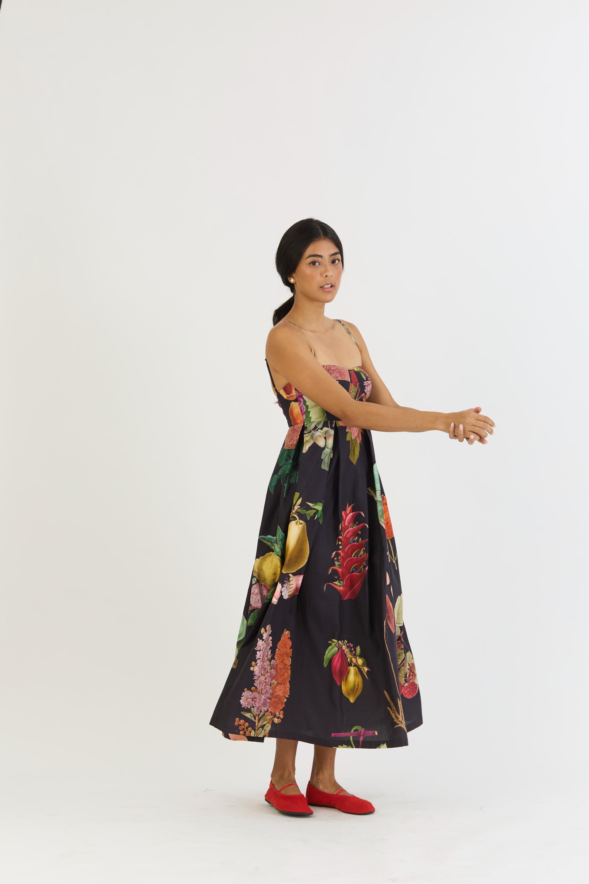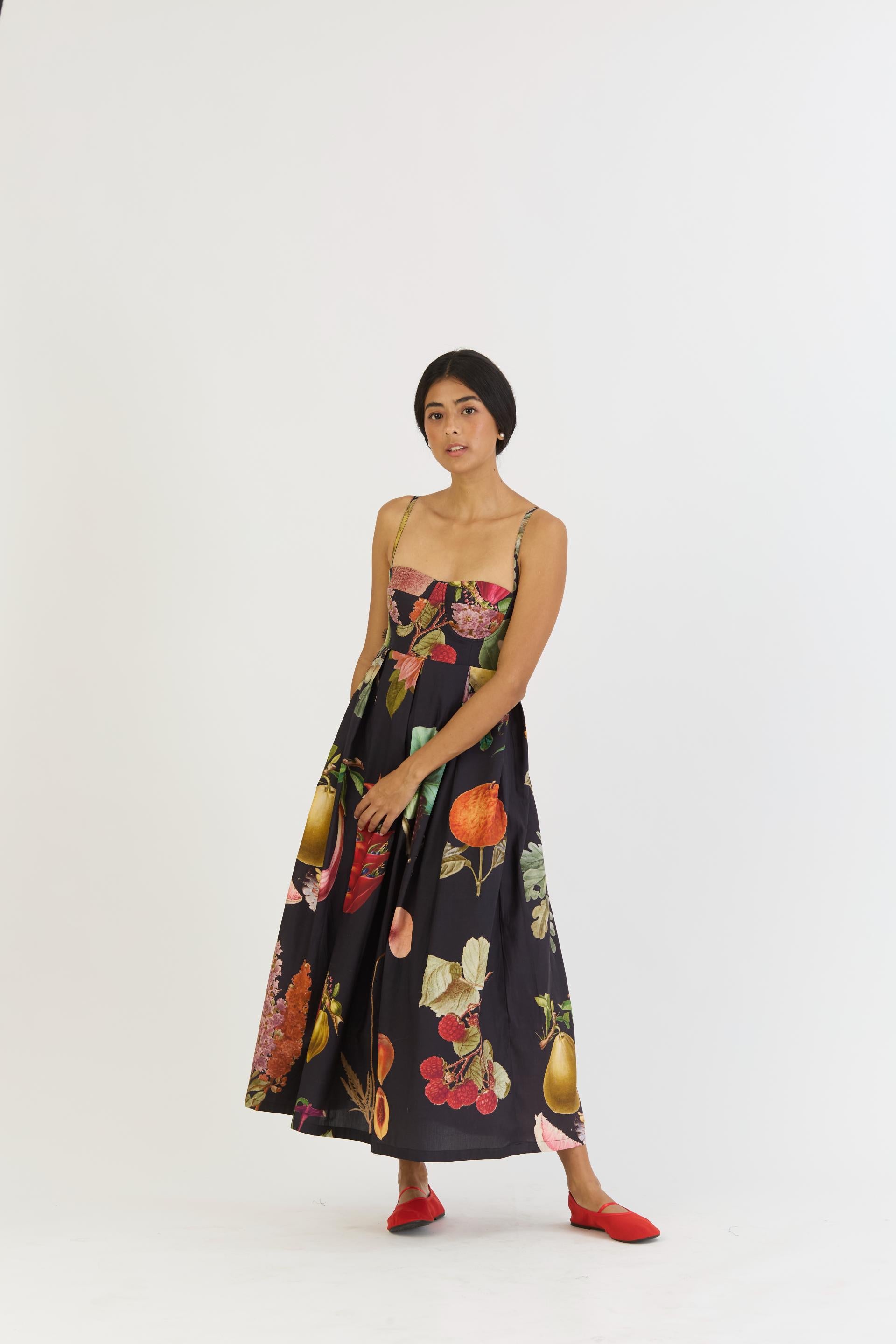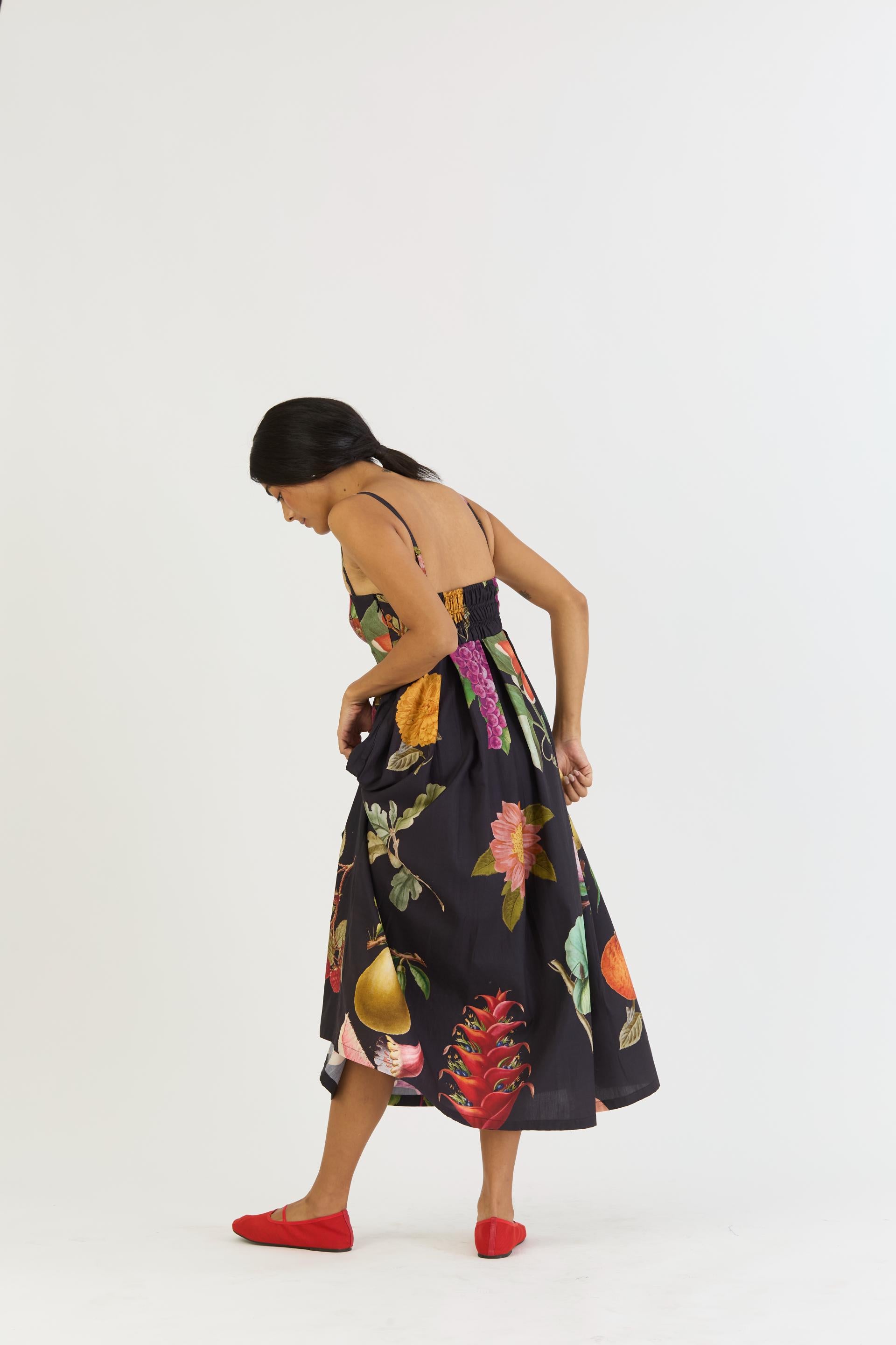 The enchanting Plum print, a breathtaking collection inspired by an old botanical tapestry. This exquisite design showcases watercolor florals, fruits, and leaves playfully dancing against a serene black background, evoking a touch of vintage charm.