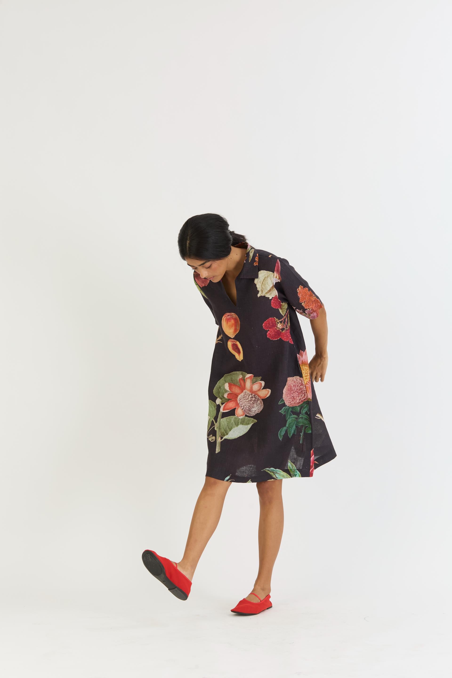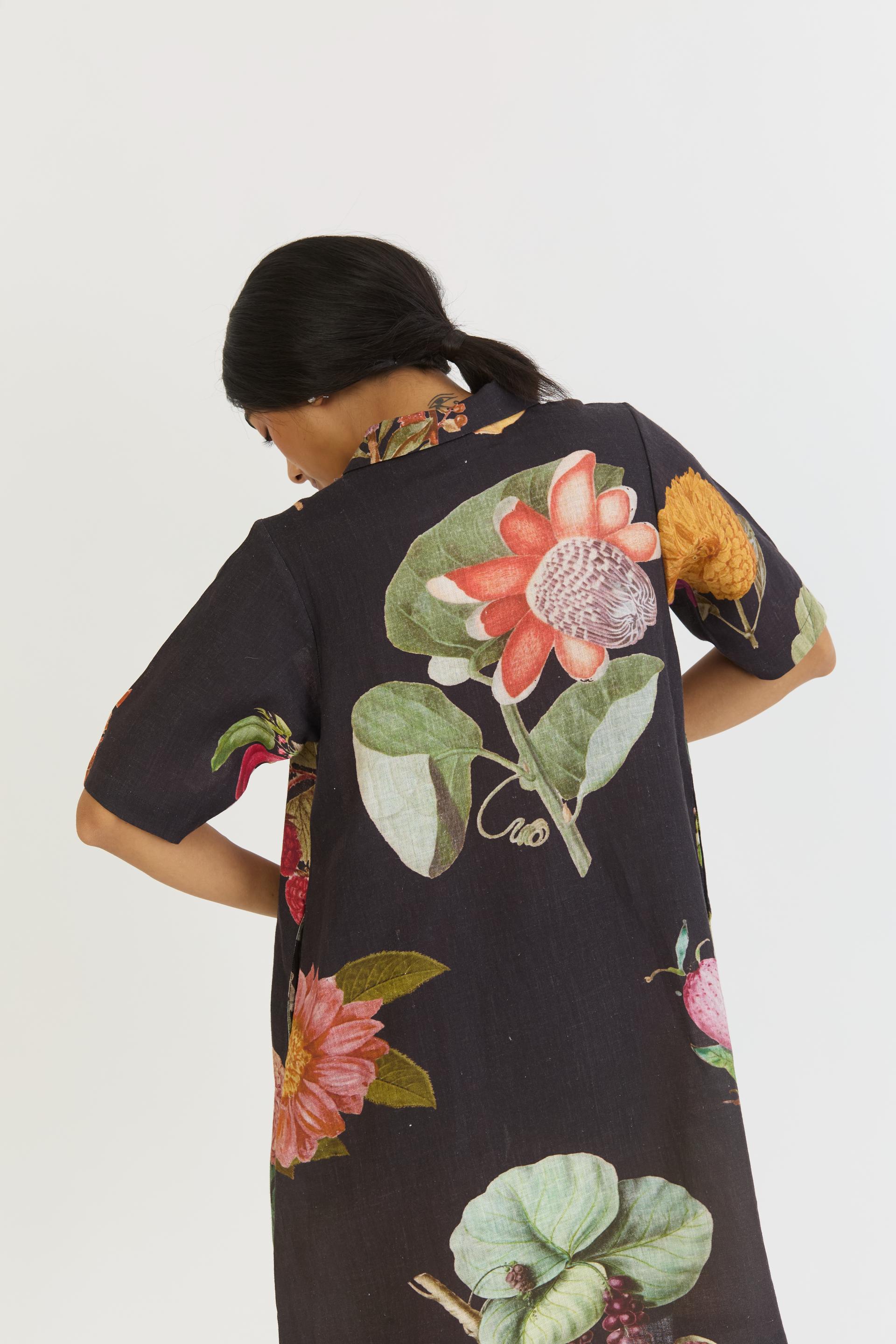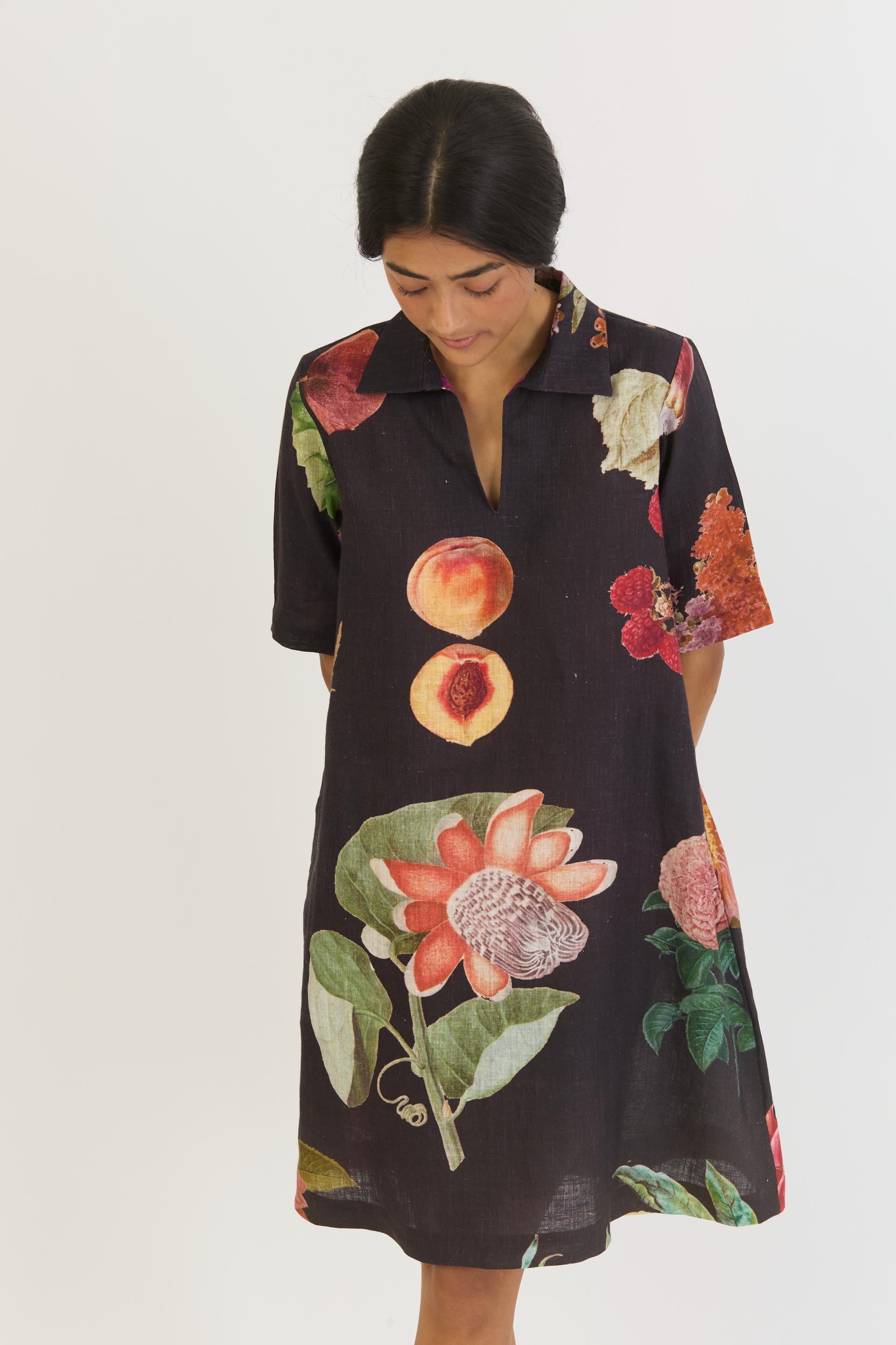 The enchanting Plum print, a breathtaking collection inspired by an old botanical tapestry. This exquisite design showcases watercolor florals, fruits, and leaves playfully dancing against a serene black background, evoking a touch of vintage charm.