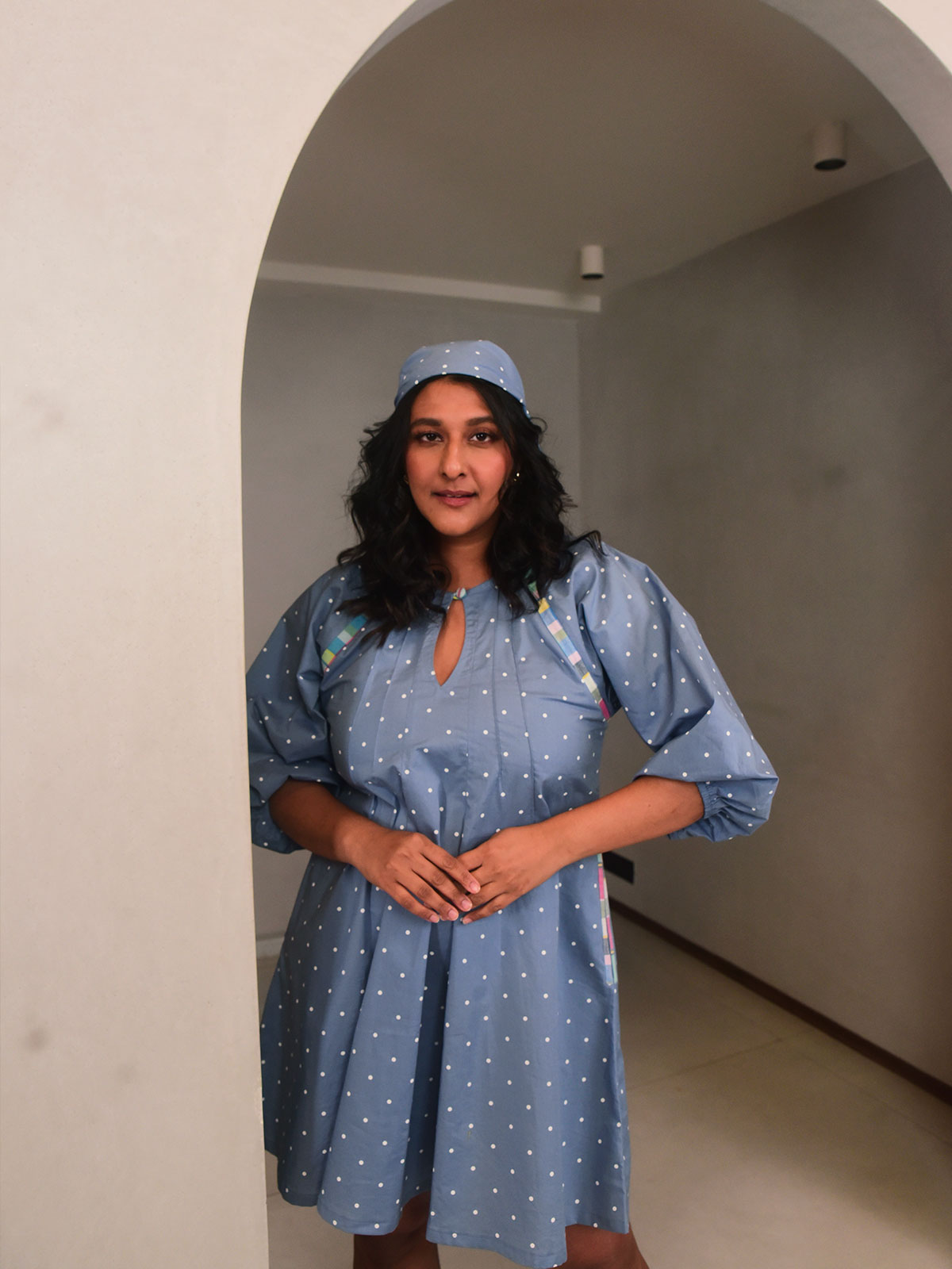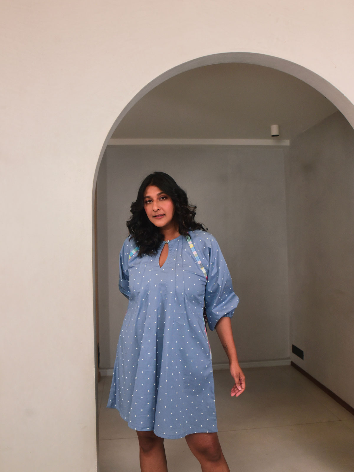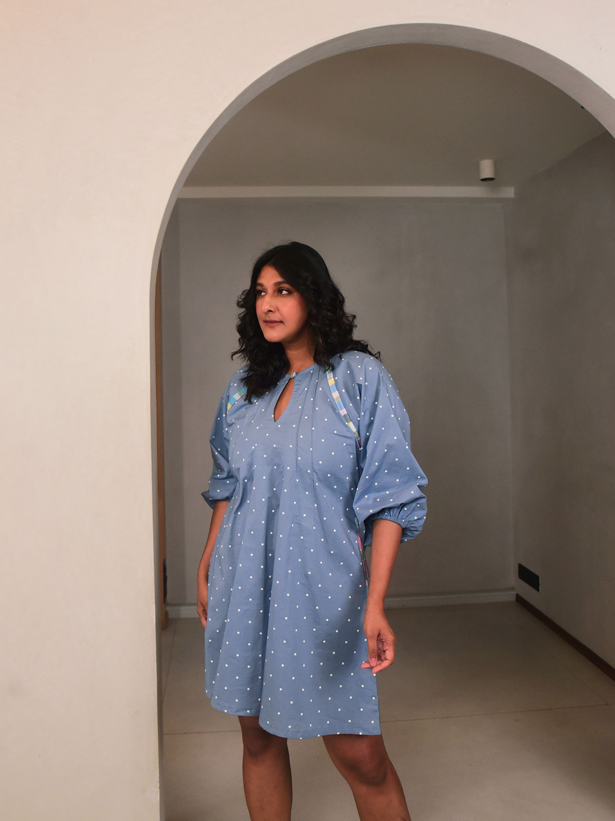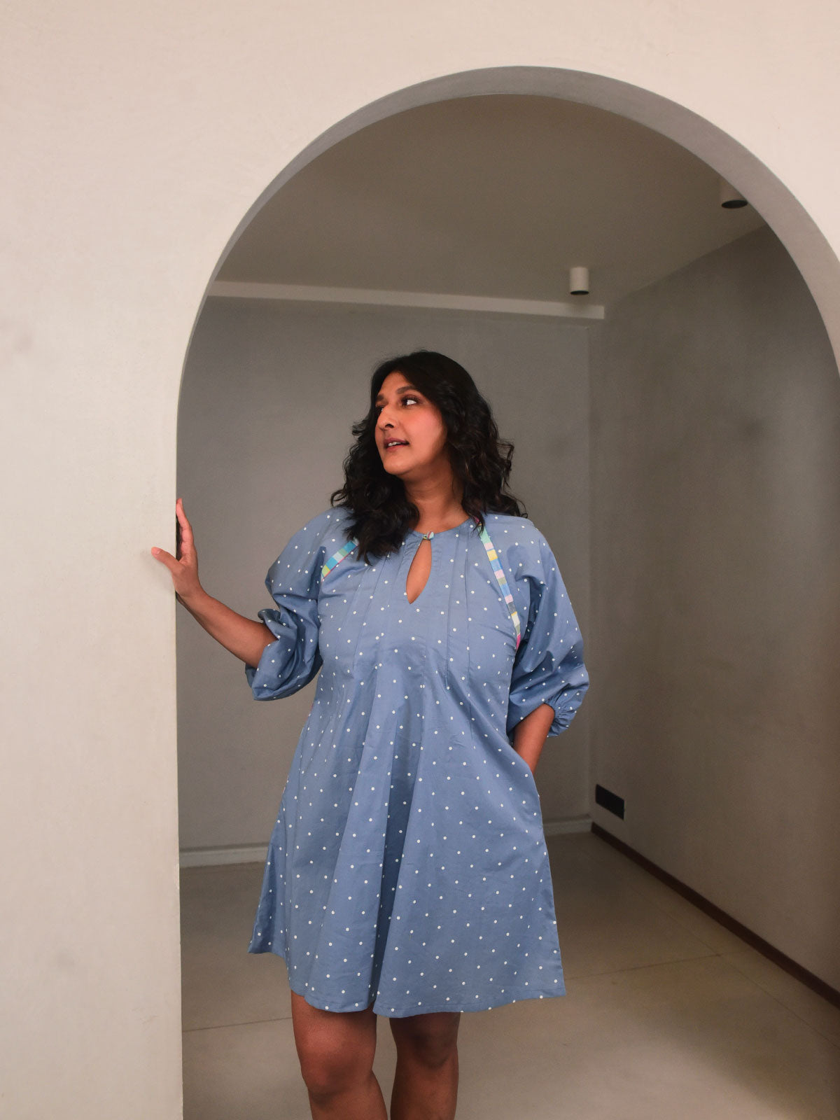 Cut in our exclusive blue polka printed cotton, this short dress brings a touch of charm with puff sleeves, front pintucks, and a delicate keyhole detail. With side pockets and a breezy silhouette, it's equal parts cute and functional. Perfect for lunch dates, summer strolls, or casual gathering's just add hoops and flats.