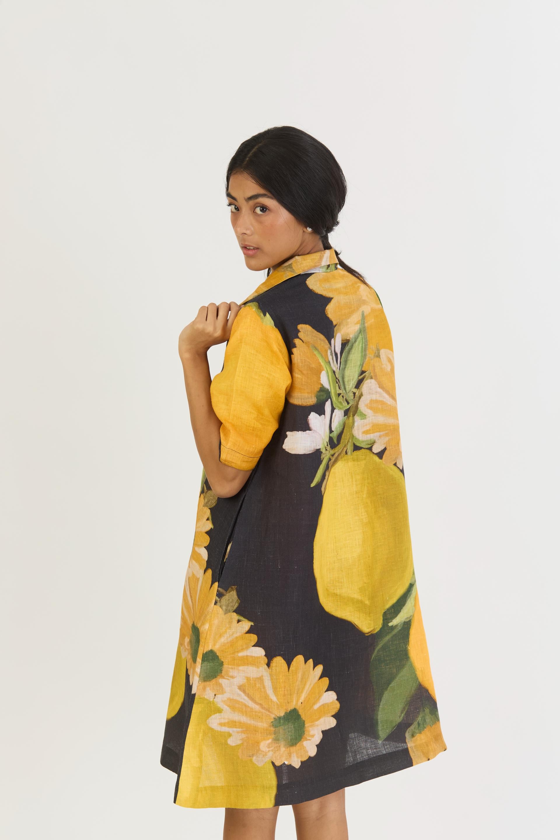 Bask in the radiance of nature with our LINEN dress, graced by oversized hand-drawn sunflower motifs on a black base. Embrace the sun's warmth and style in this stunning and comfortable piece.