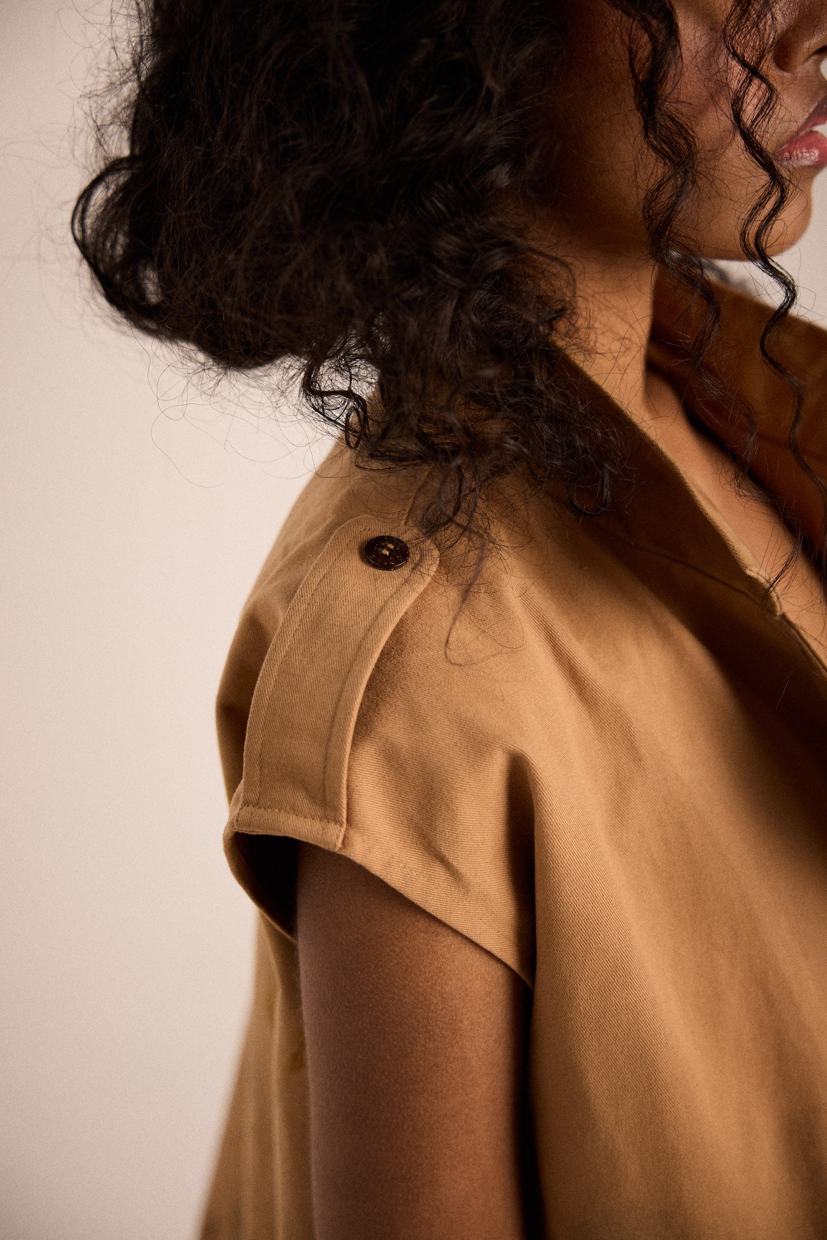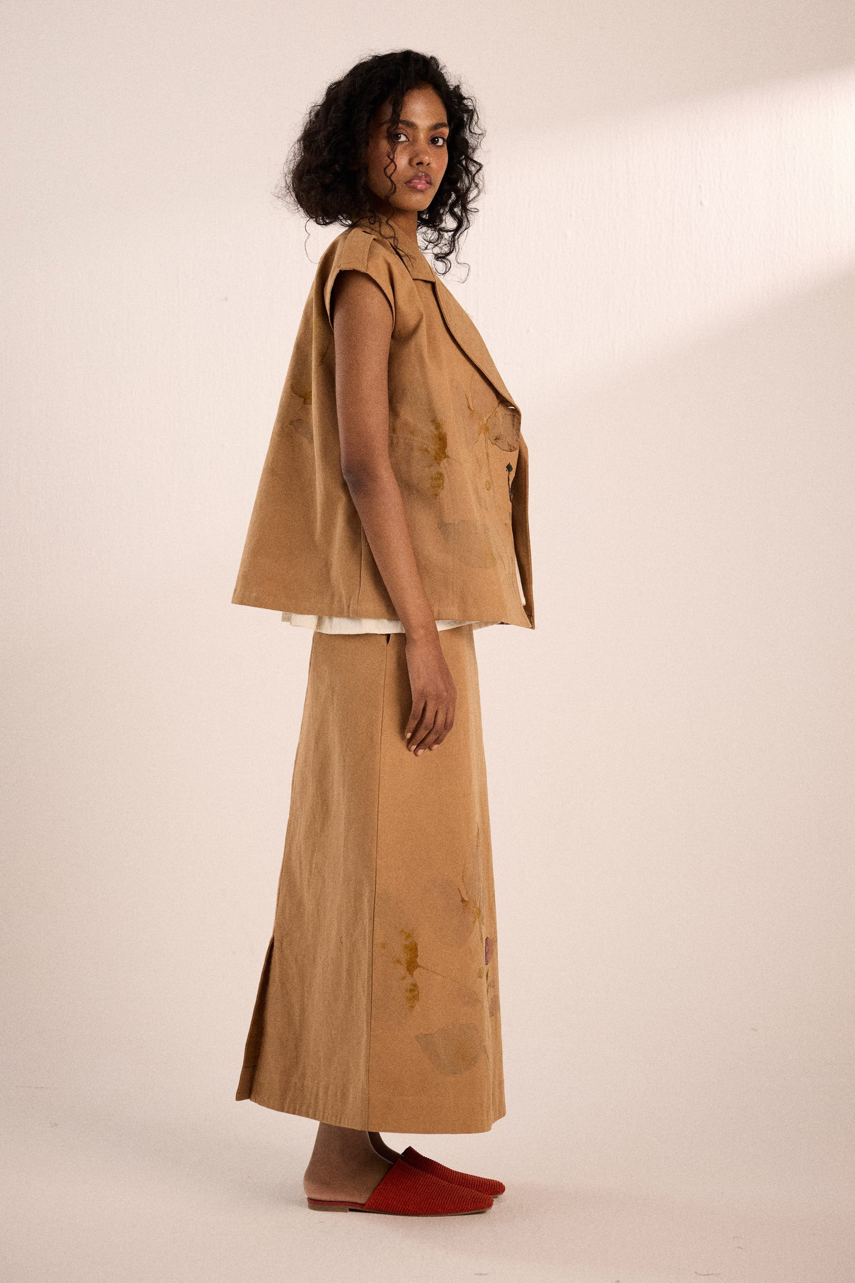 A beige twill cotton co-ord set with a subtle watercolor floral print. The tunic features a notch lapel collar and front button opening, while the straight skirt includes side seam pockets.