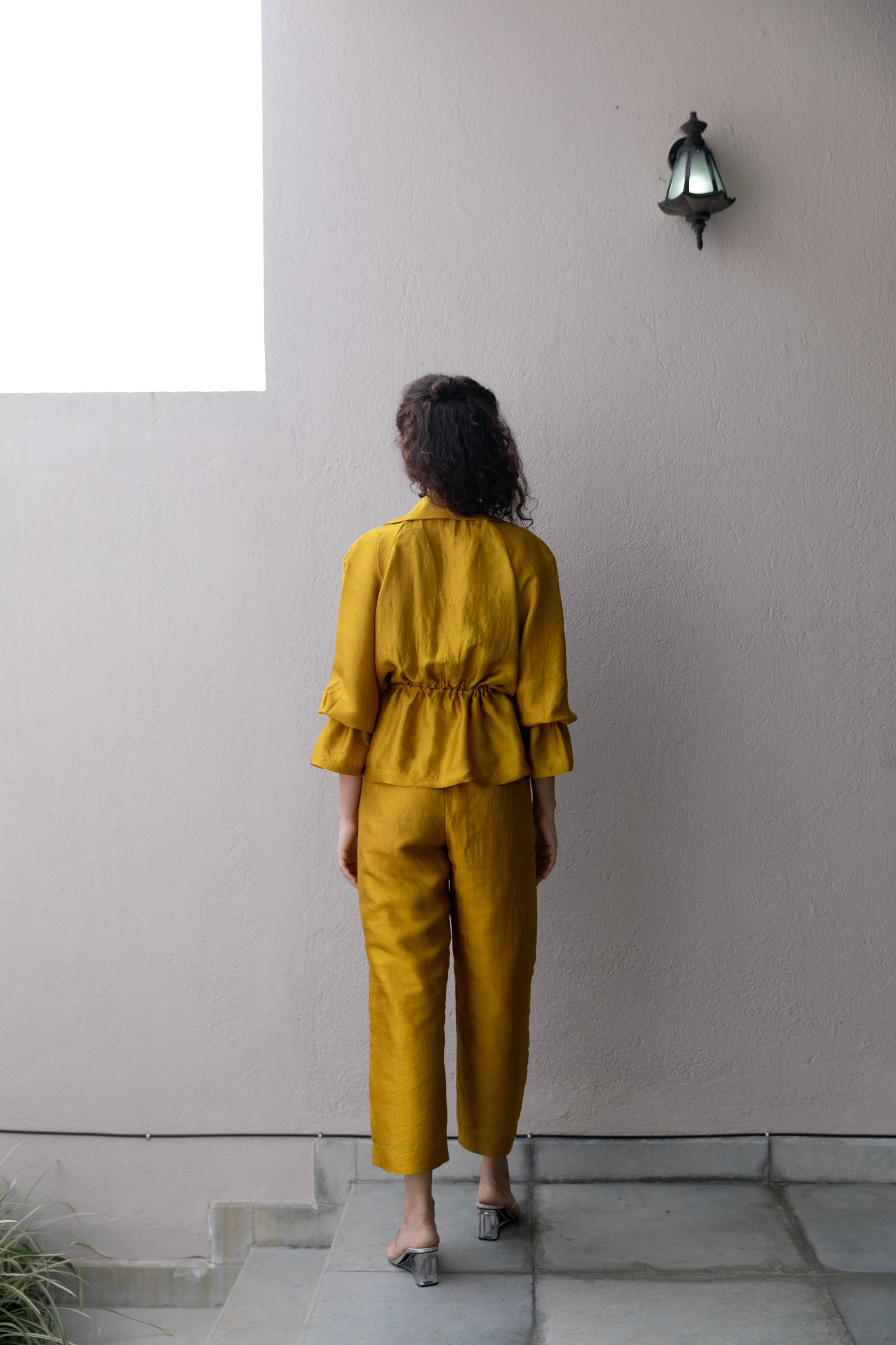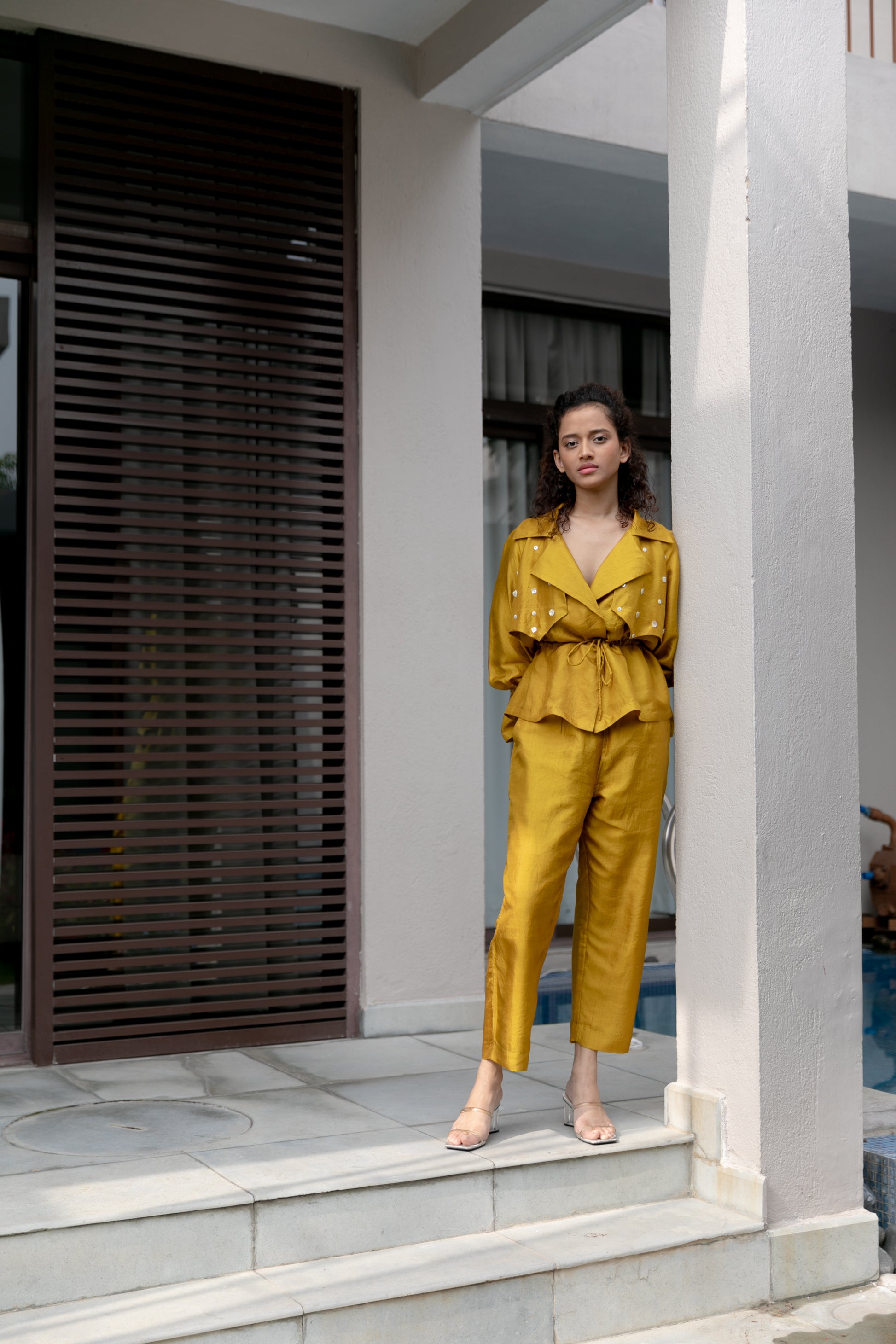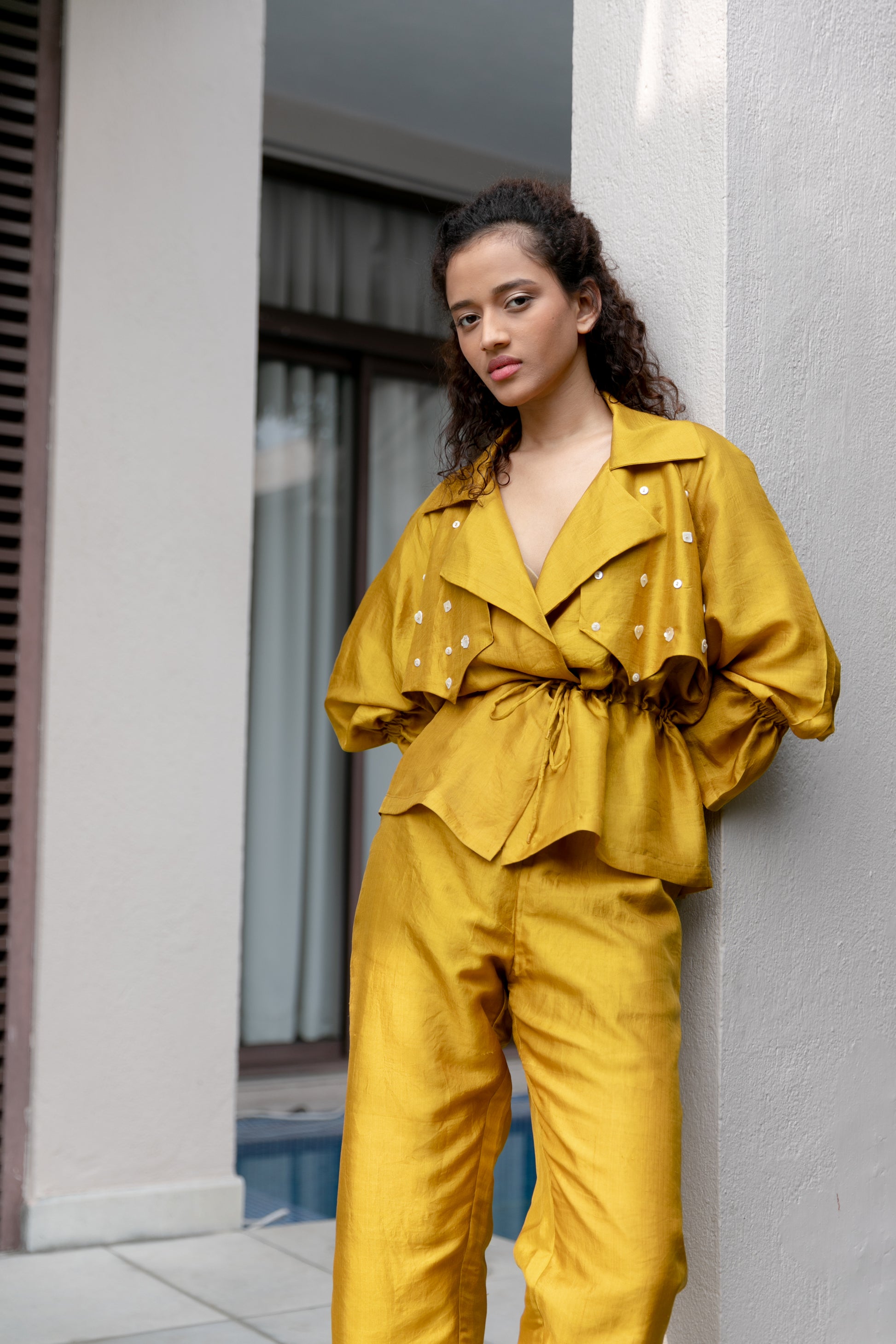 Handwoven Mulberry Silk Jacket style tie-up Co-ord Set with Mother of Pearl shell button embroidery