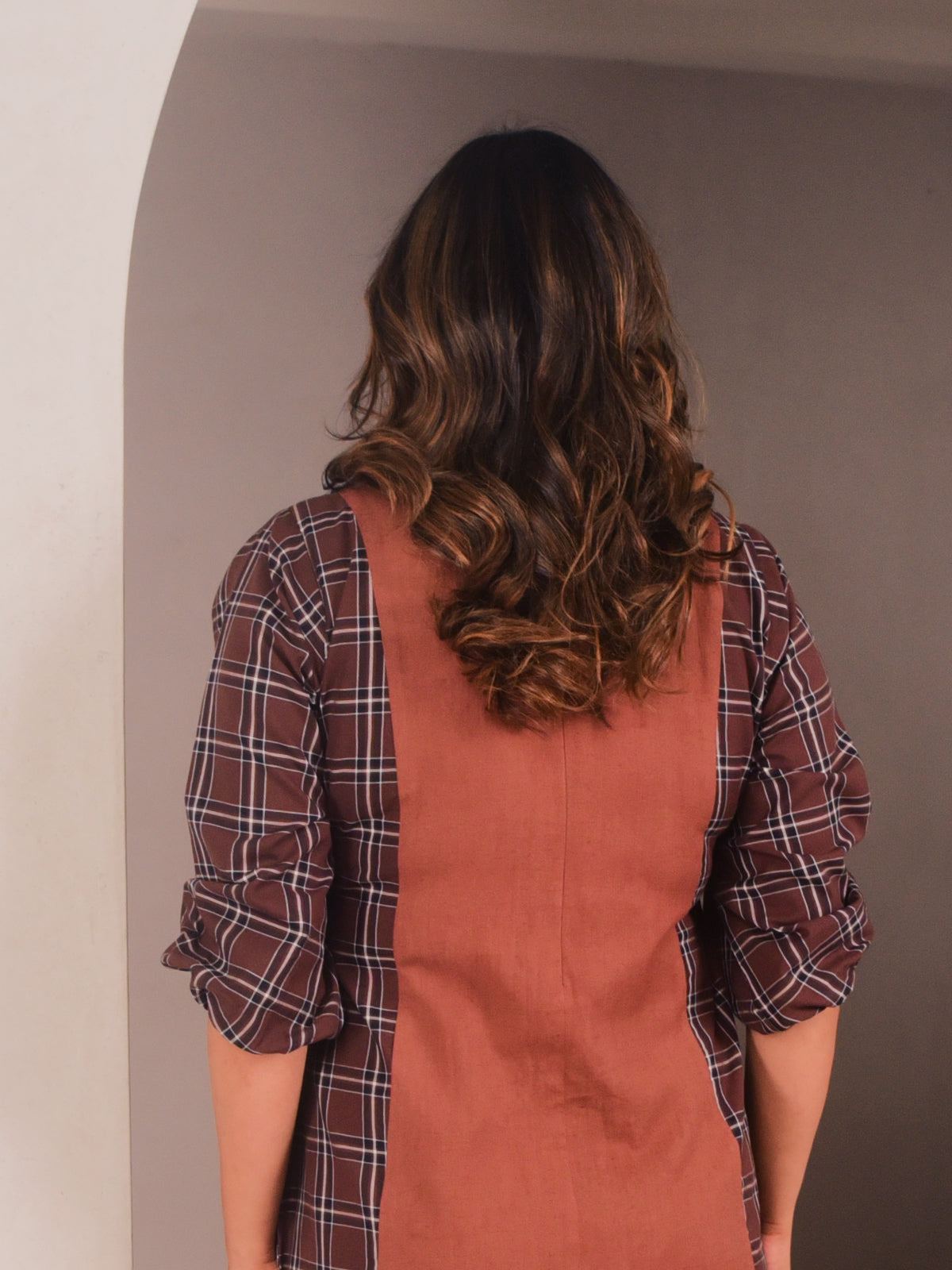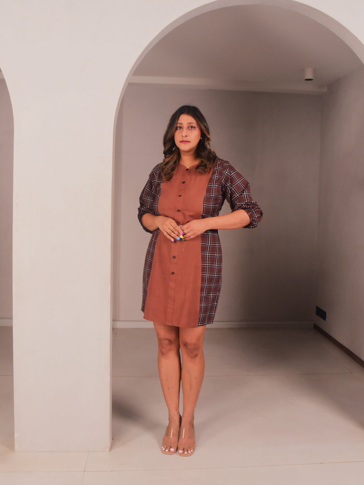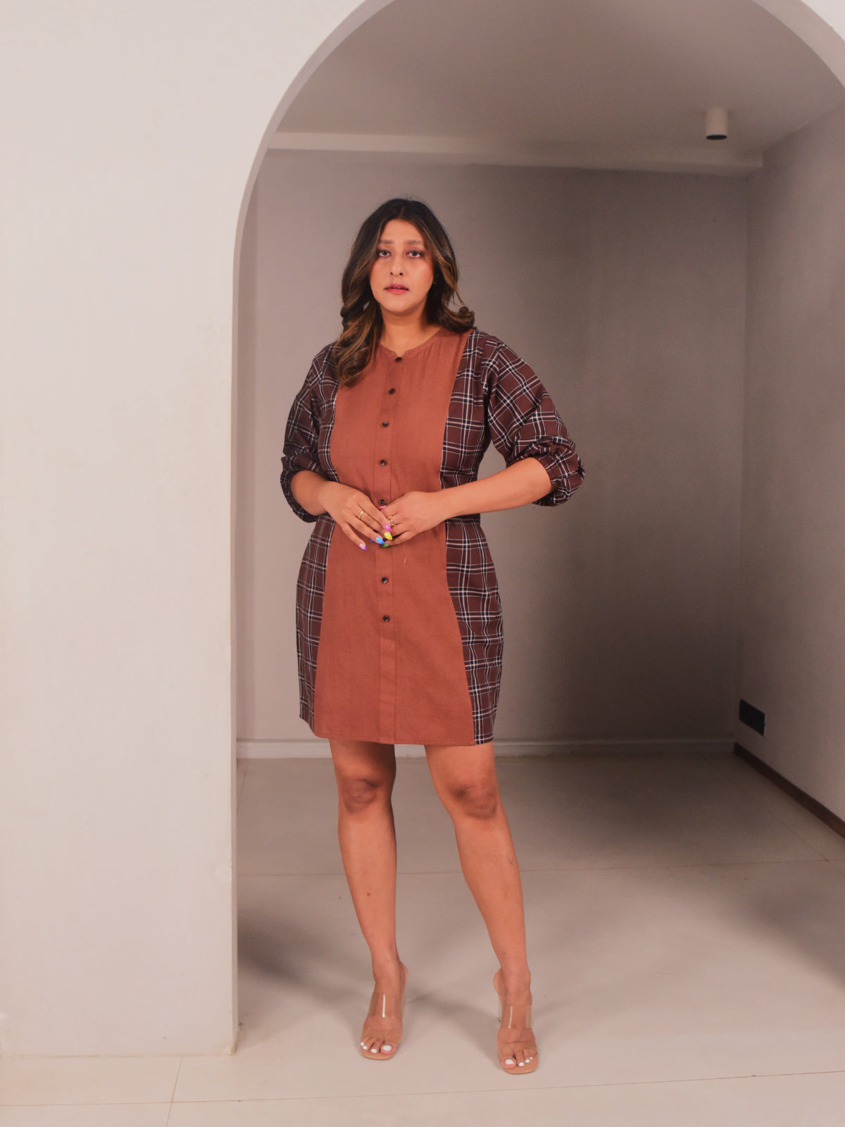 A tailored blend of our exclusive brown checkered cotton and dyed Amara cotton-linen, this Rae checks short dress features a round neckline, mid-length balloon sleeves, show buttons at the front, and a hidden zipper at the back. Designed with subtle side pockets and a structured fit, it strikes the right balance between classic and modern. Elevate the look with ankle boots or loafers and a structured tote. Great for office meetings, interviews, or networking events.
