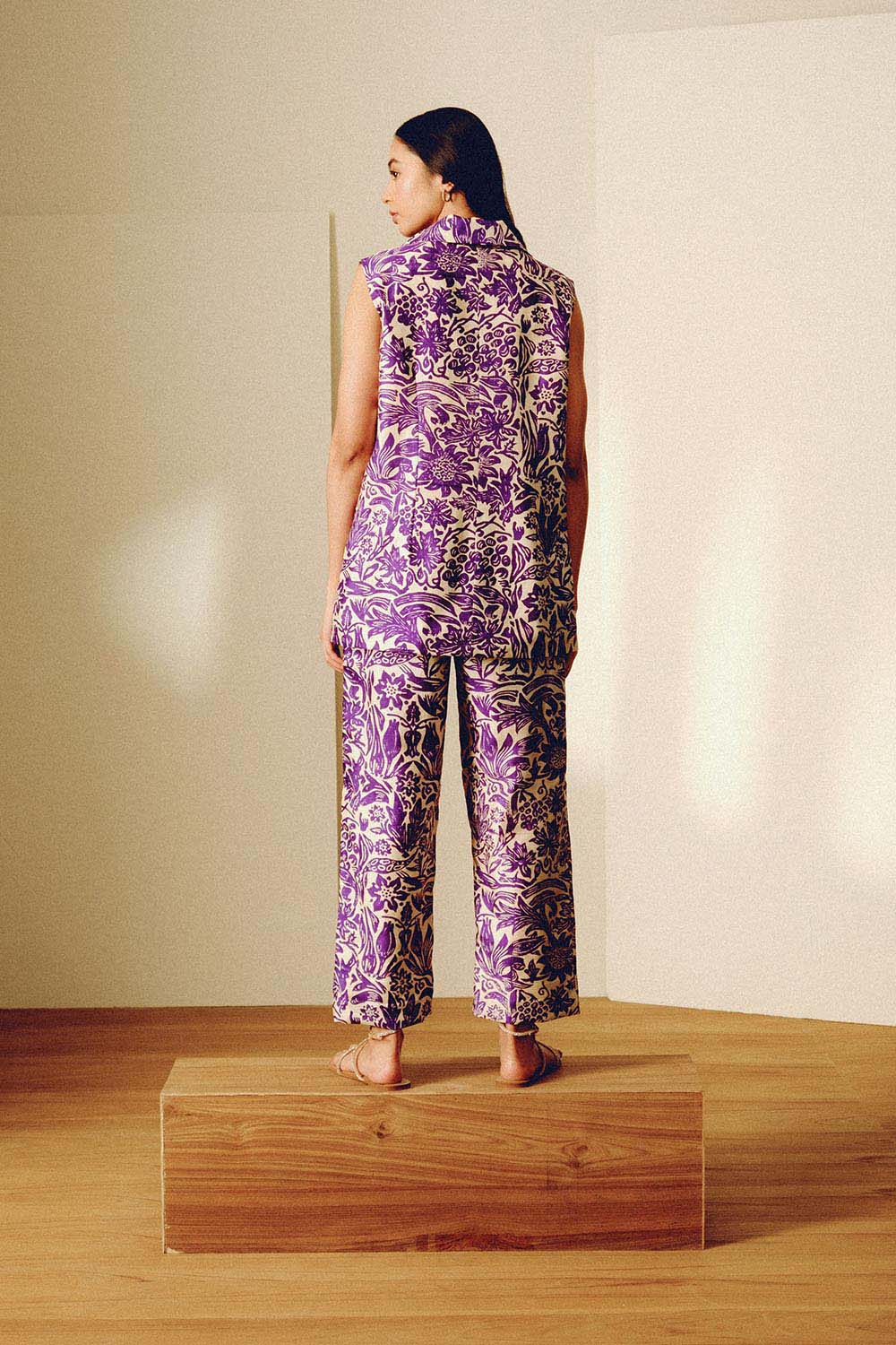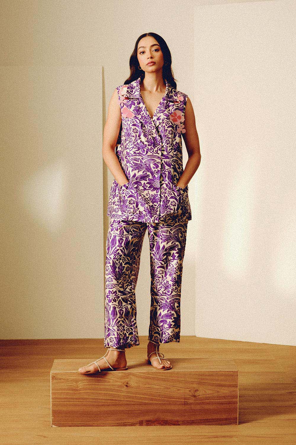 Handwoven block printed mulberry silk sleeveless blazer set with sustainable handcut sequins details in the front, paired with matching narrow pants . Blazer Length- 28” Pant Length- 37”