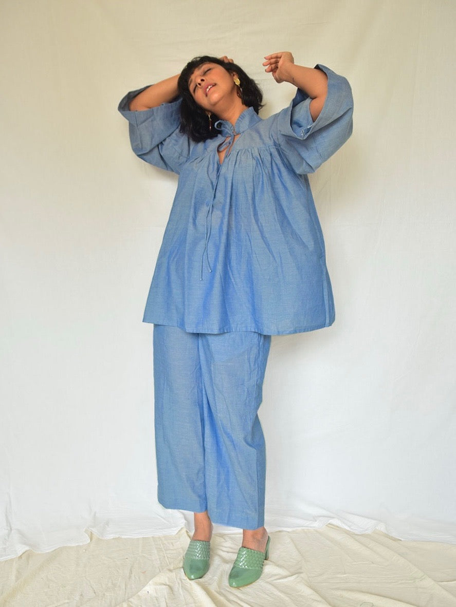 Breathable organic cotton in a muted denim blue for your board meetings, weekend errands and everything in between! The top has a close collar with pleated detailing and a tie. The sleeves are loose and pleated, with peats on the bodice as well. These soft, organic cotton pants are cut in muted denim blue, keeping you comfortable all day long!