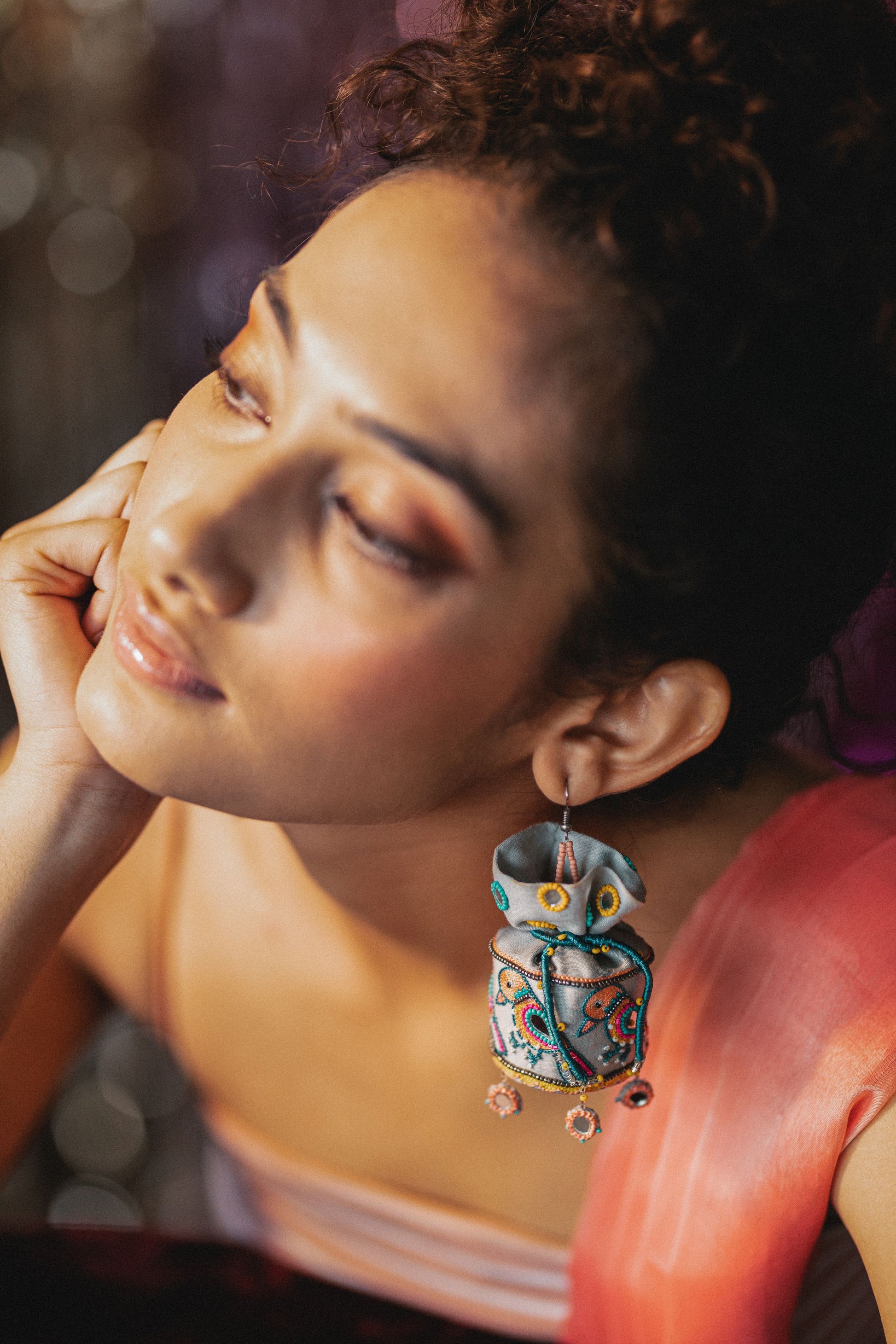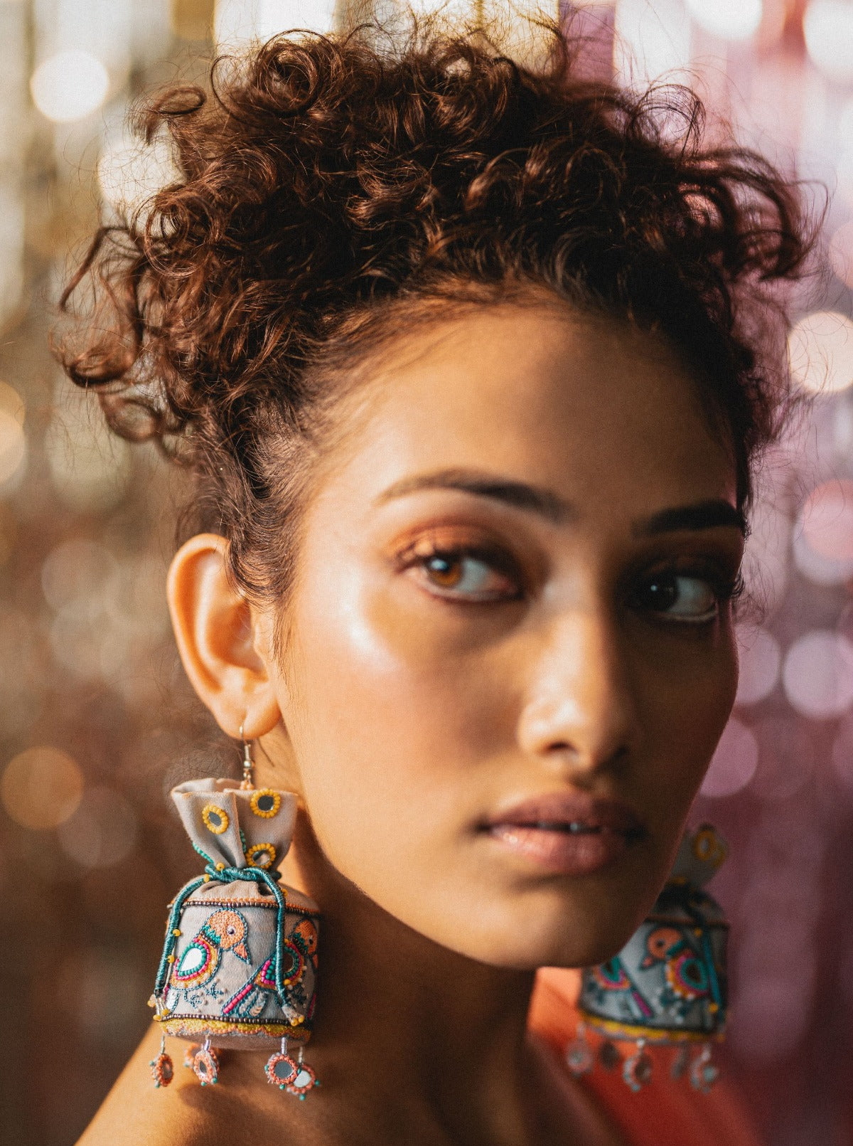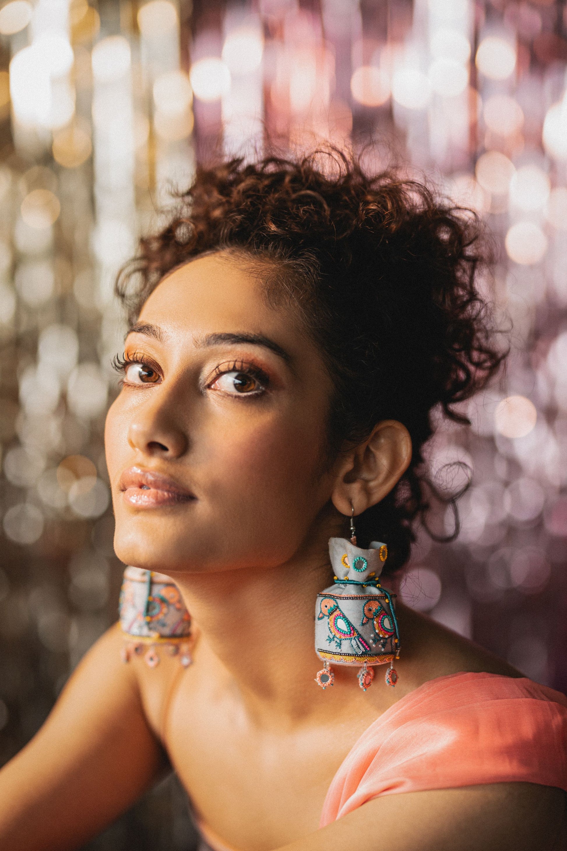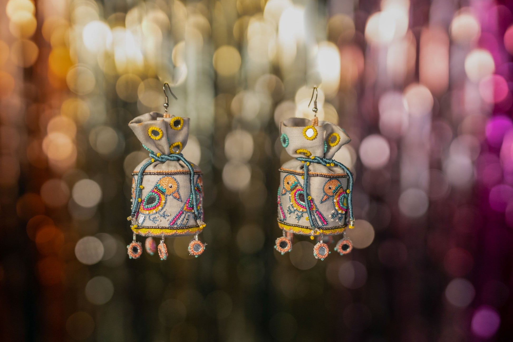 Handmade and hand embroidered potli earrings with our unique and intricately designed Sparrow motifs. A light weight potli pair with tiny mirror detailings at bottom. Provided with a hook on top.