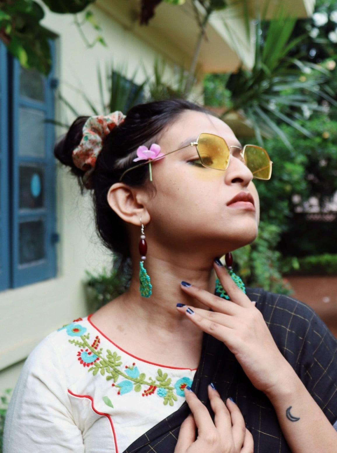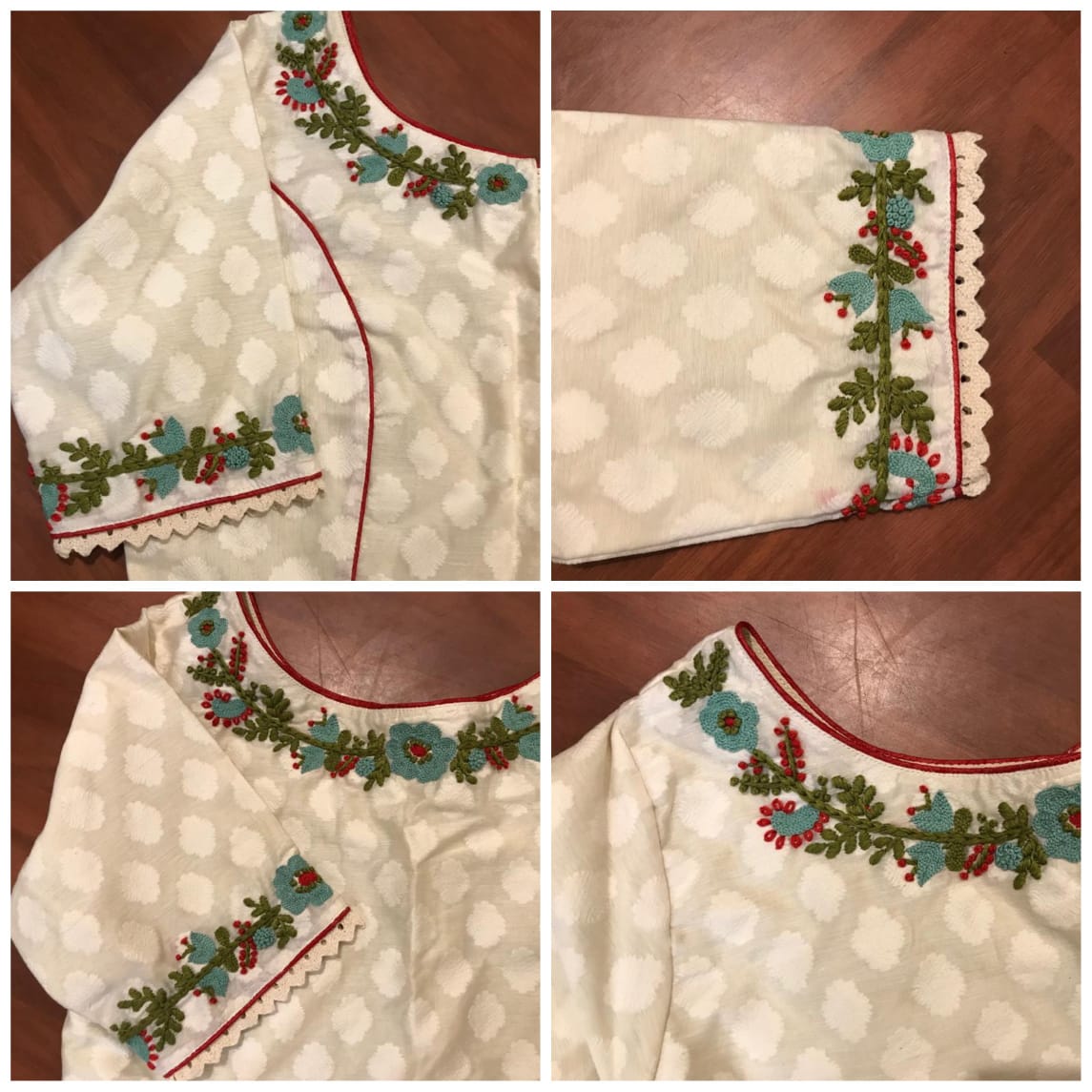 On handwoven self motif cotton, blue and red flowers with creepers are hand embroidered on the back, neck and sleeves.