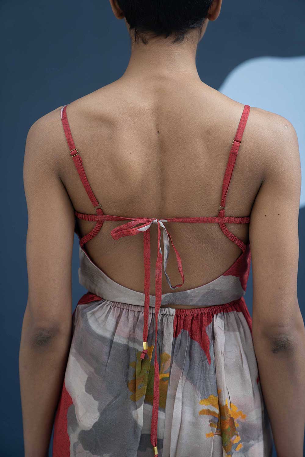 The jumpsuit is crafted in a unique red color with massive white poppies carefully printed on Dora silk.