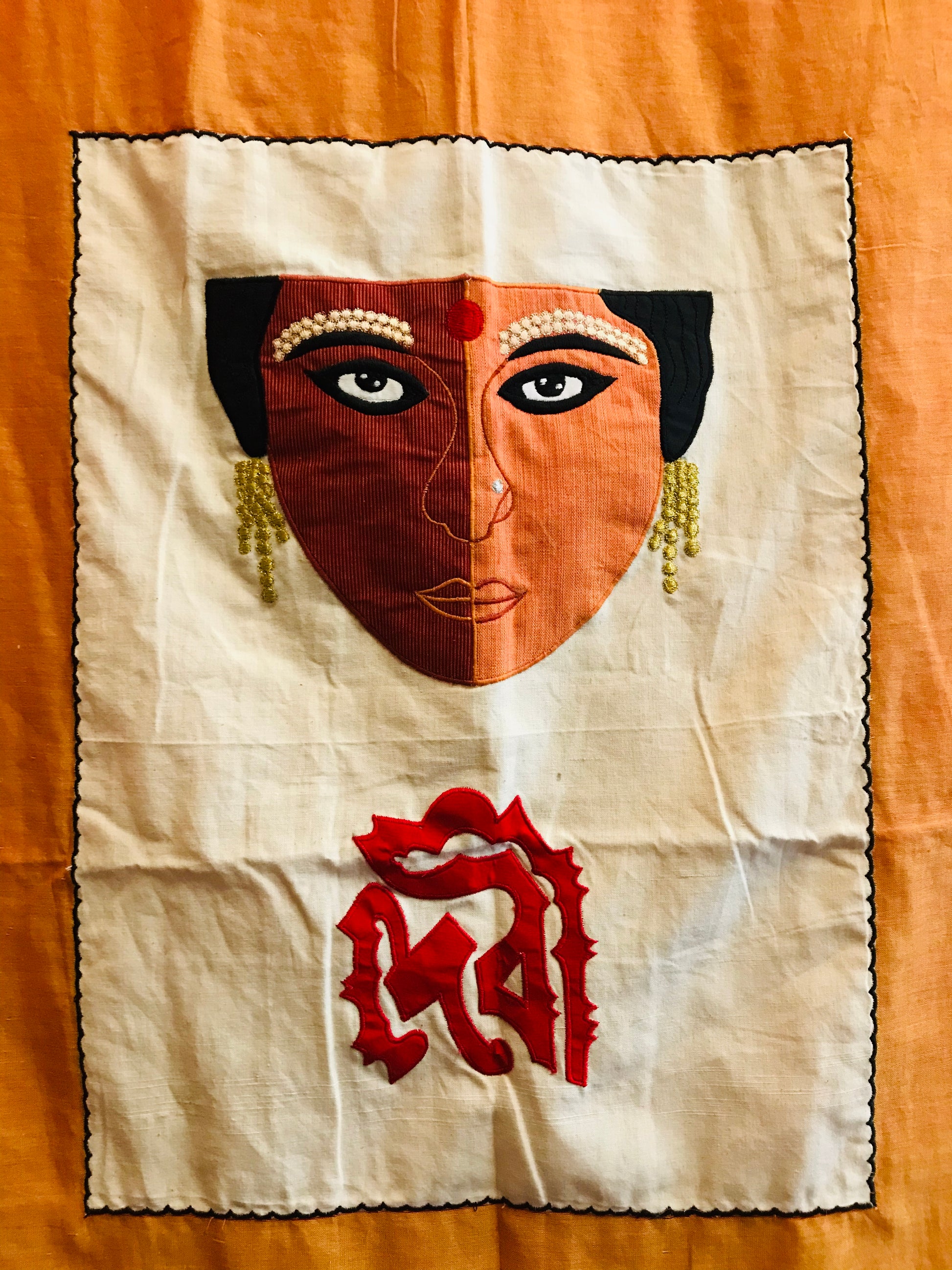 Vermillion red handwoven cotton saree from Phulia district of West Bengal with a bright yellow border. The poster of film Devi by Ray is done on applique and embroidery on the pallu of the saree. The body has Shiuli flowers scattered.