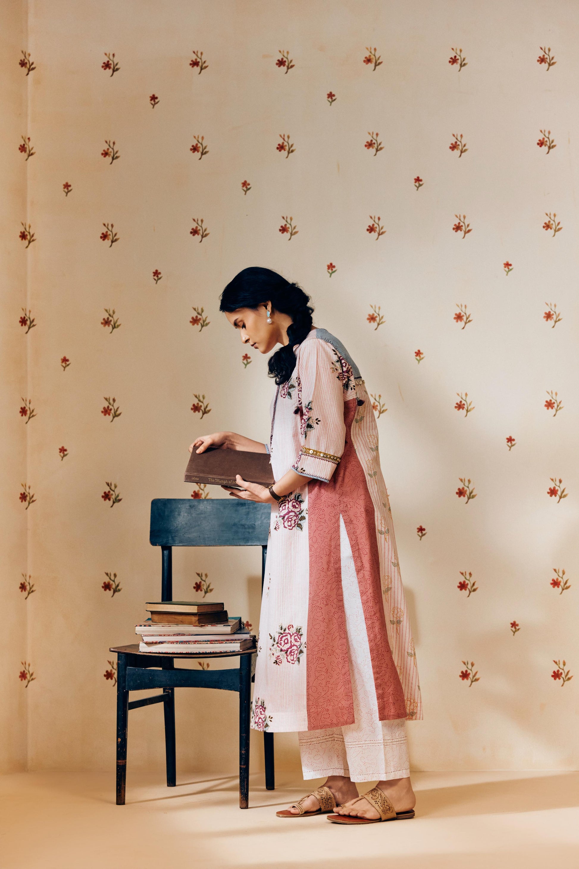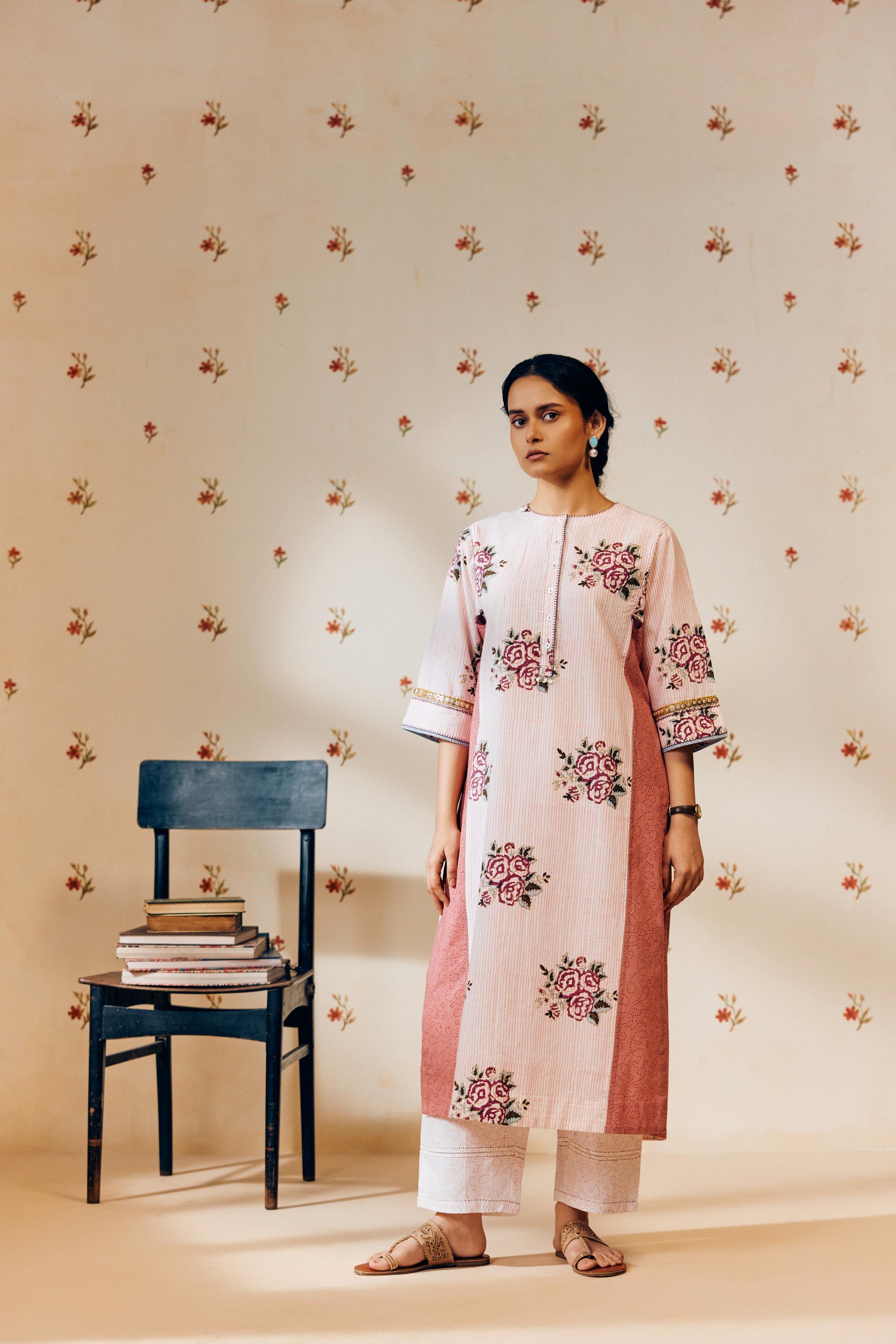 Stay cool, stylish, and effortlessly elegant with this handcrafted off-white khadi cotton tunic set, designed for the modern woman who values comfort and conscious fashion. The tunic features a soft pink rose hand block print, a classic round neckline with a button placket, and relaxed kimono cut sleeves—making it the perfect breathable silhouette for warm-weather dressing.
