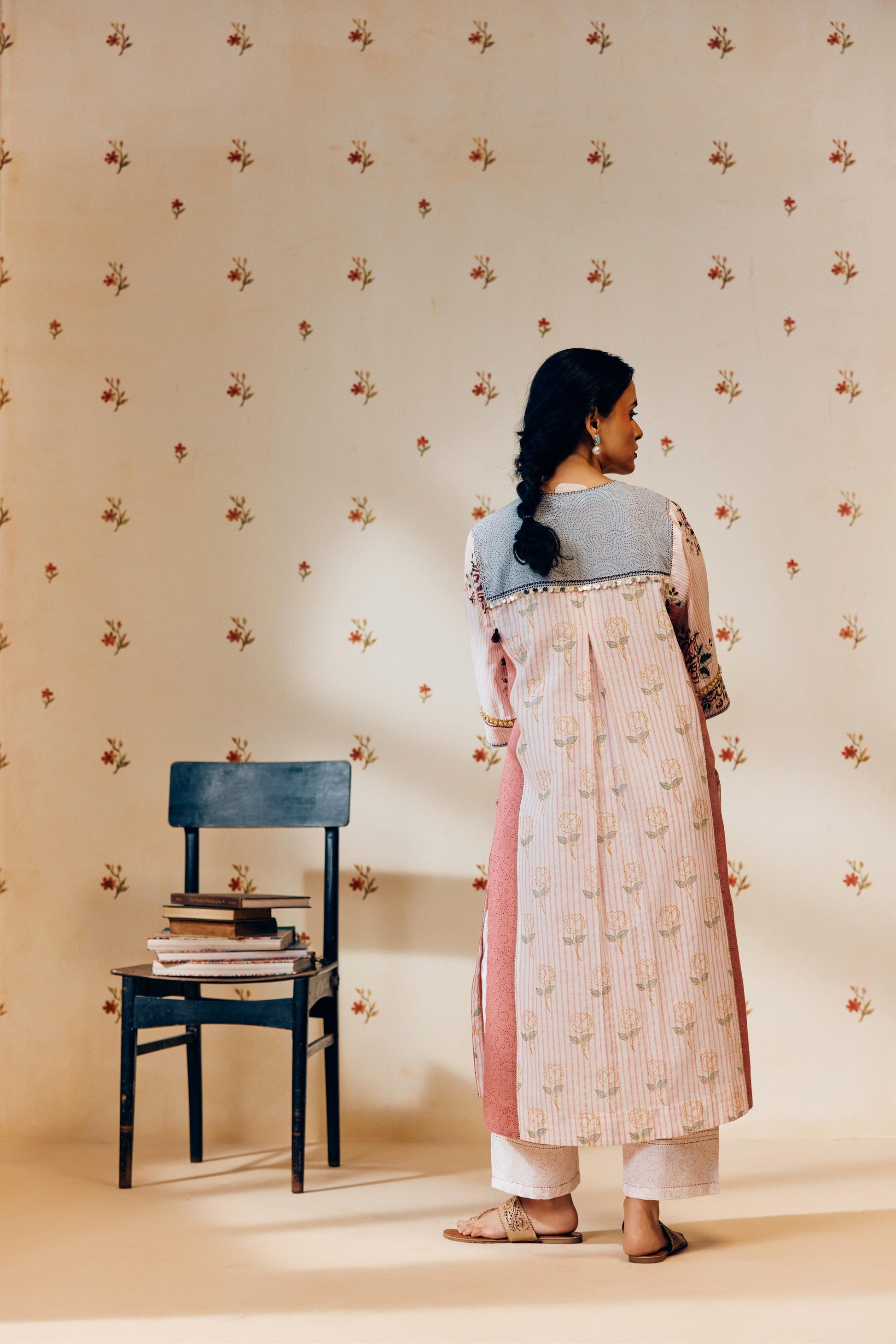 Paired with powder pink hand block printed pants in a charming Bandhani dot motif, this set blends traditional Indian artistry with easygoing, contemporary flair. Lightweight and eco-friendly, this handwoven khadi cotton ensemble is ideal for casual days, summer outings, or work-from-home style.