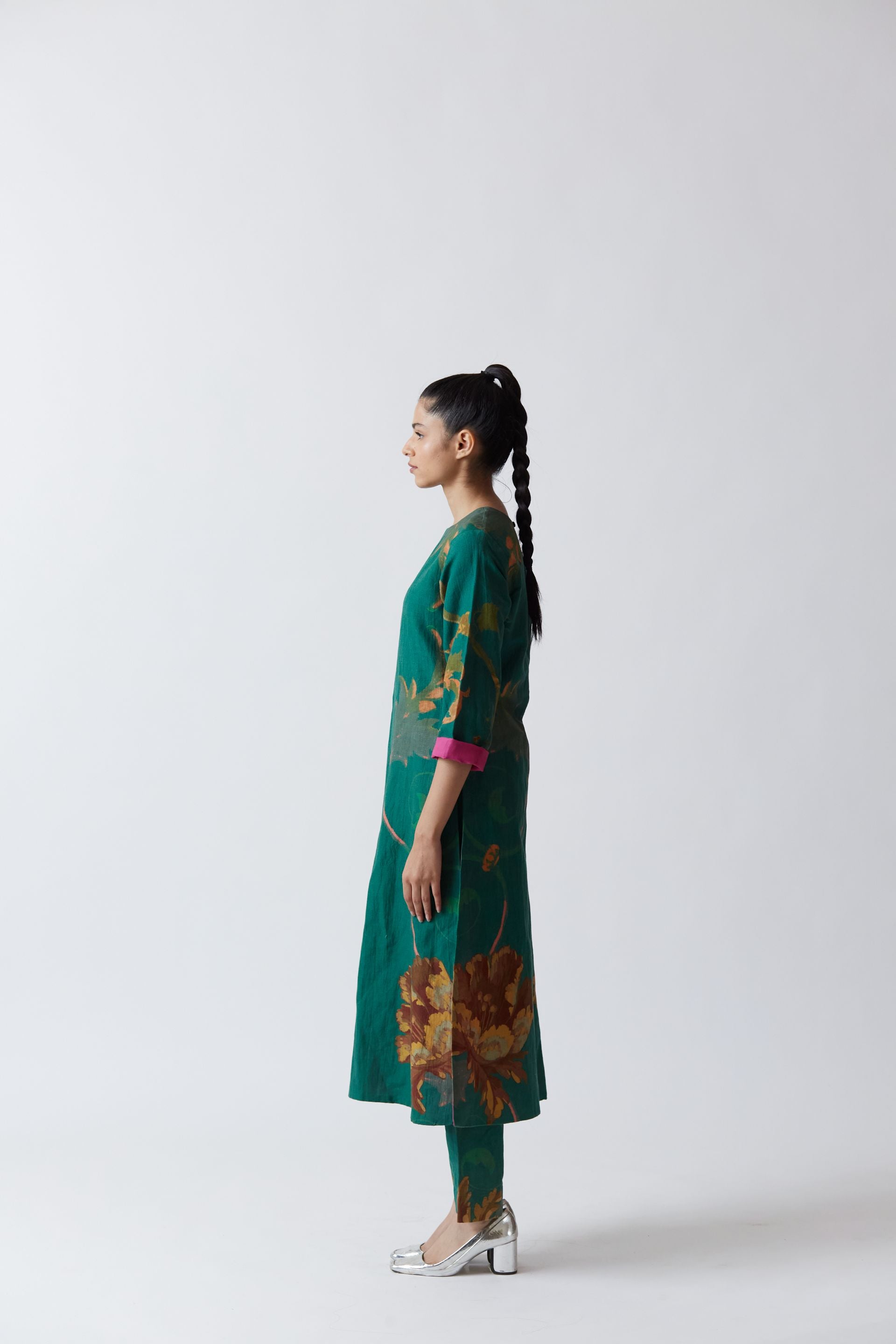 The set includes a pure linen kurta with a contrast pink mulmul lining and pants in shades of green