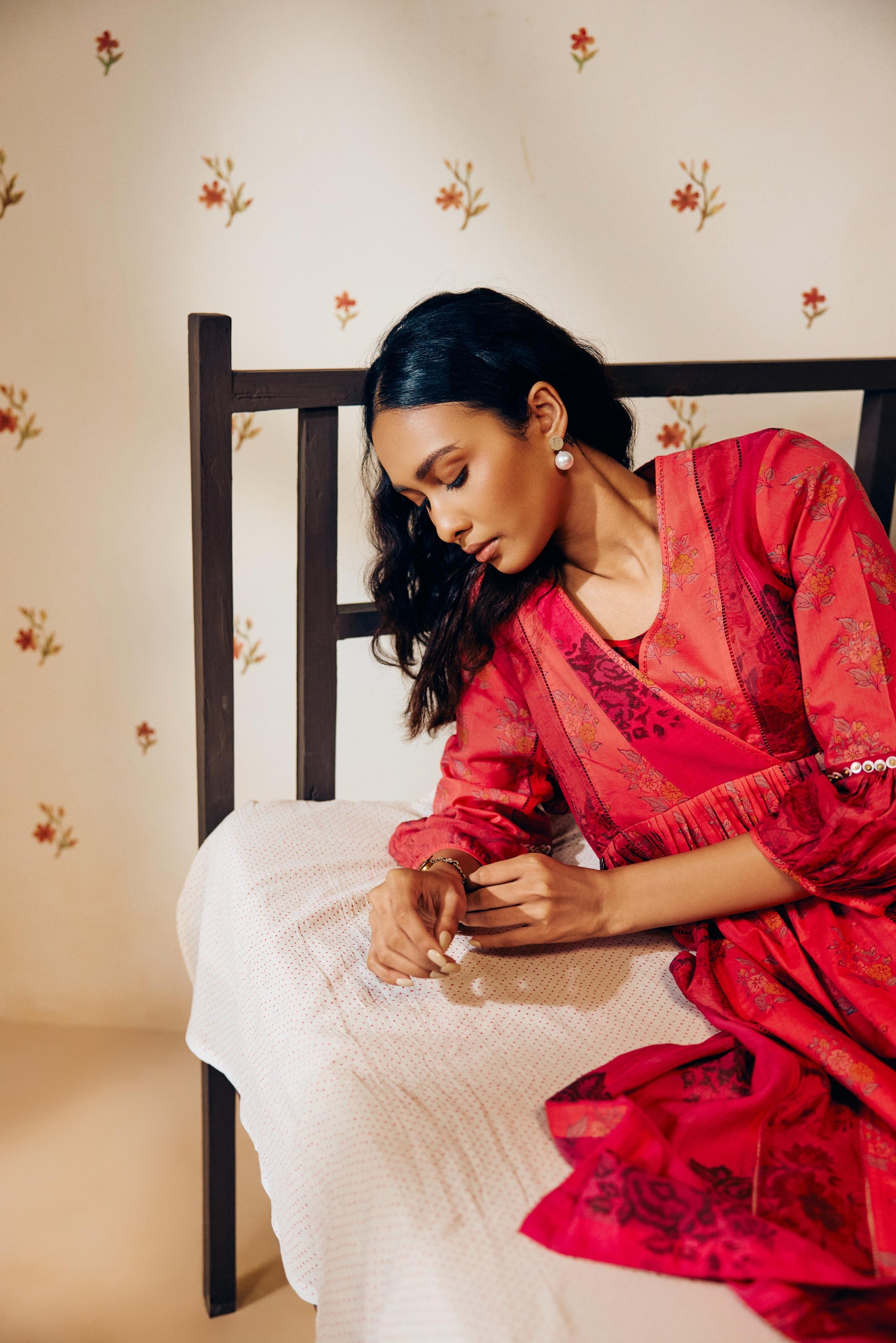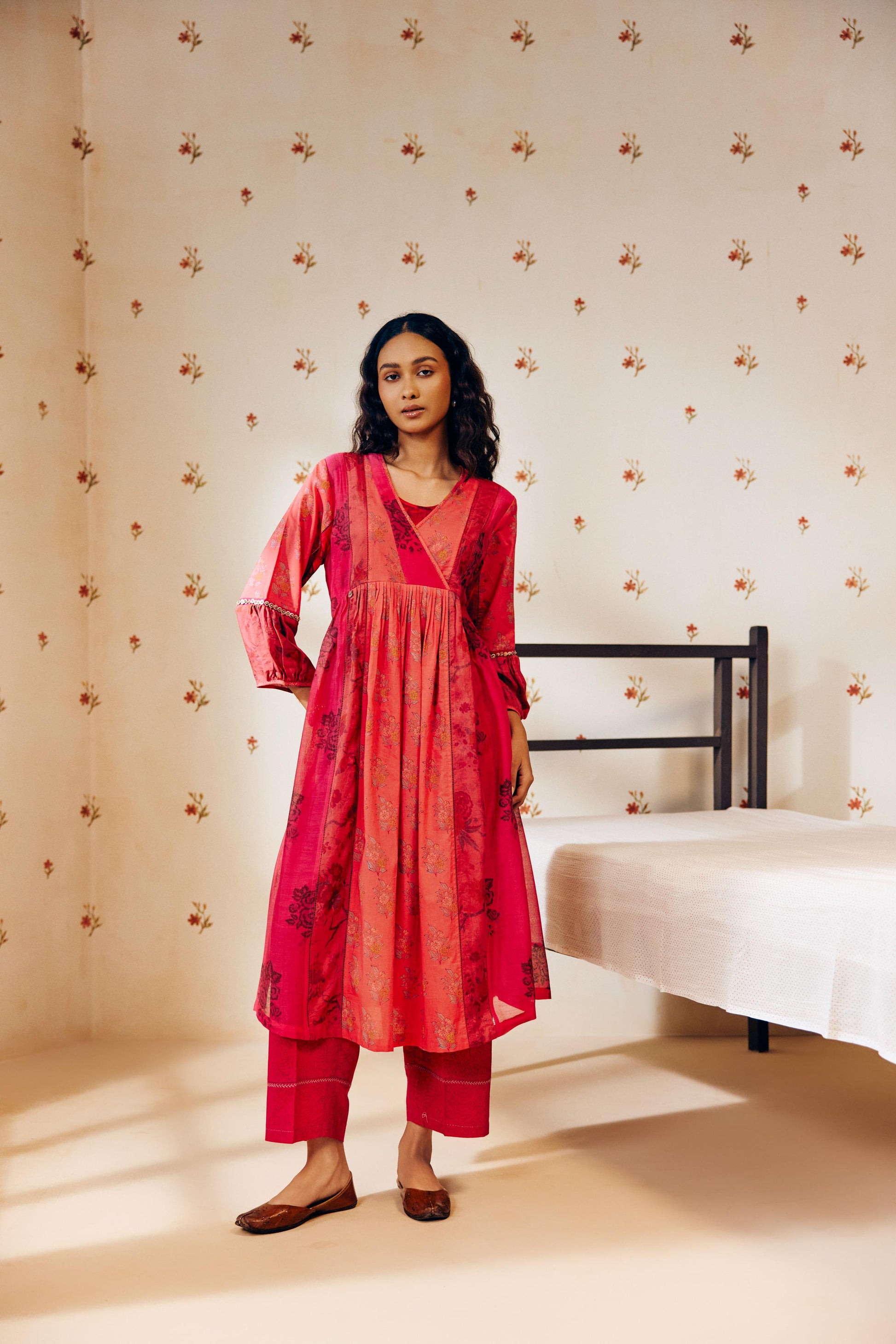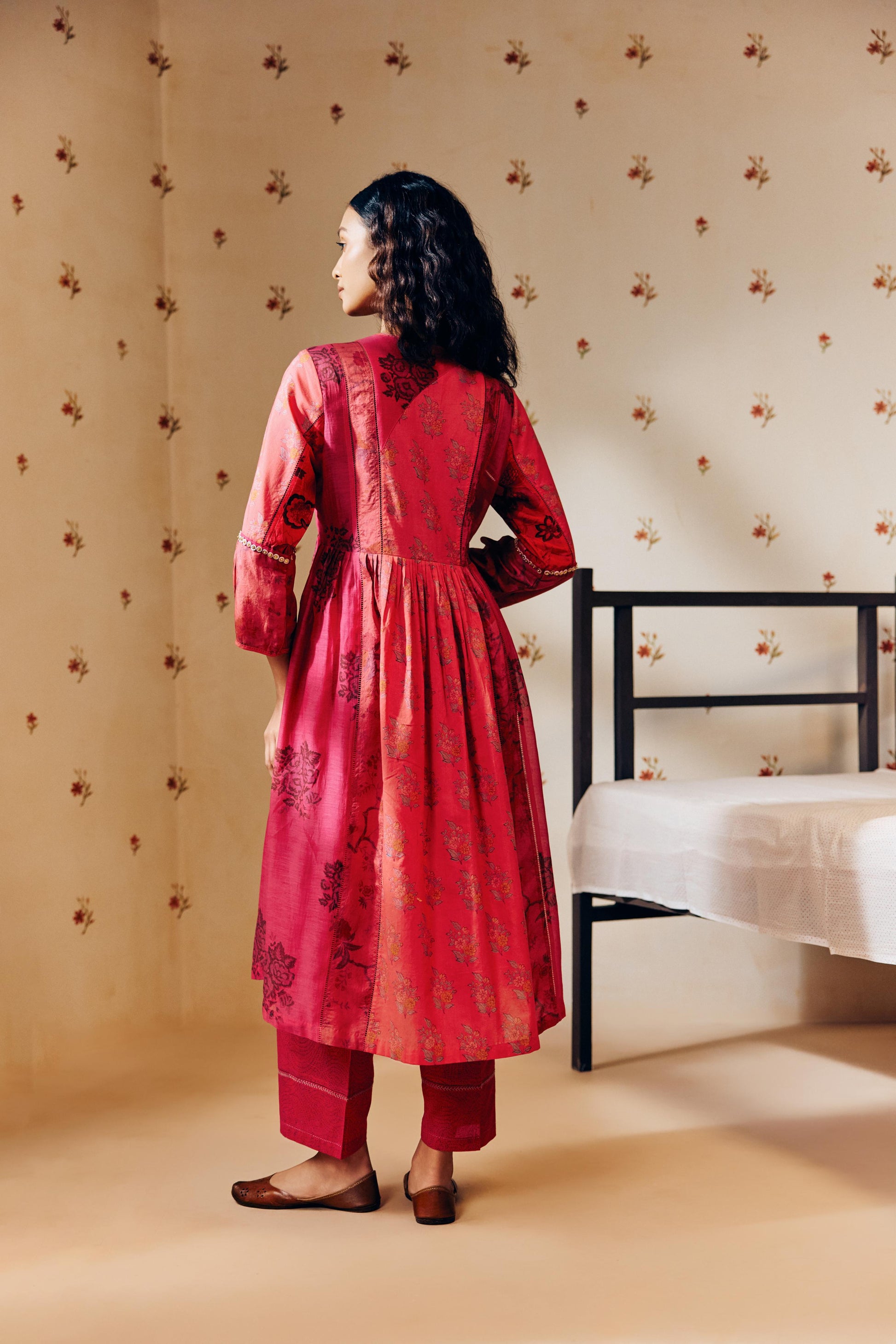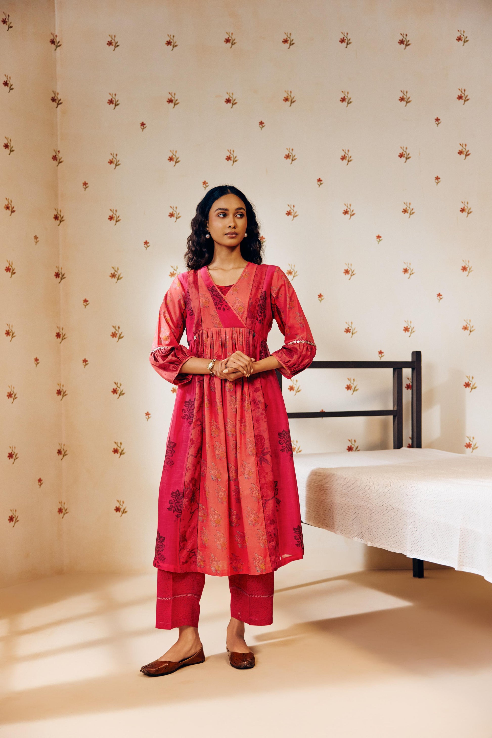 Enhanced with multi-paneled inserts in printed mulberry silk and hand block printed handloom Chanderi, adding texture and depth