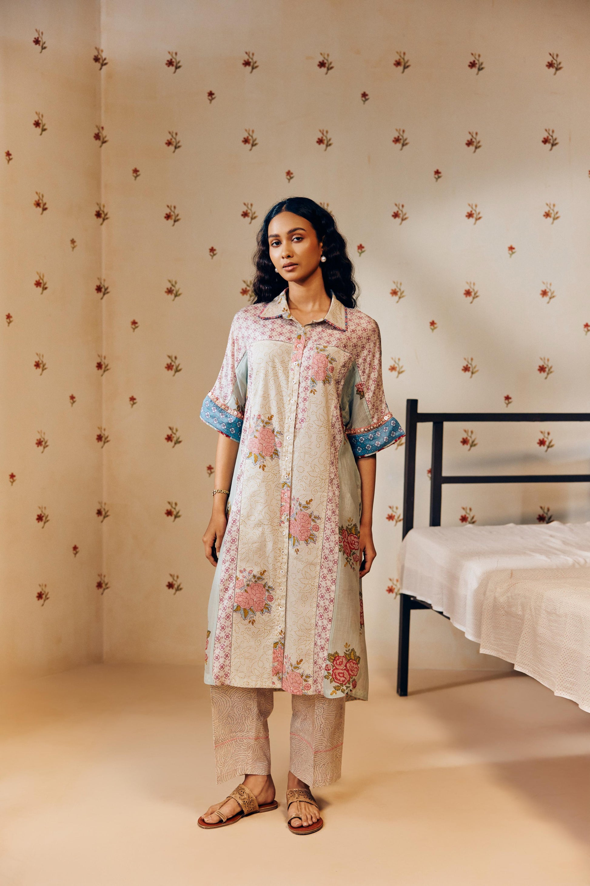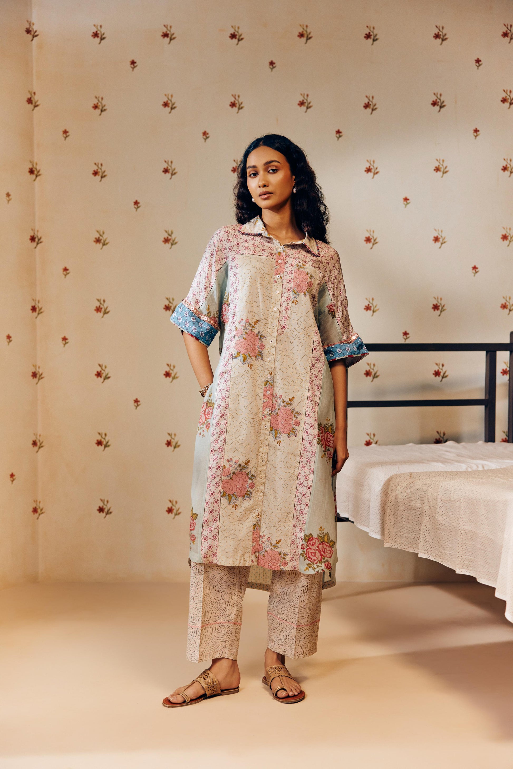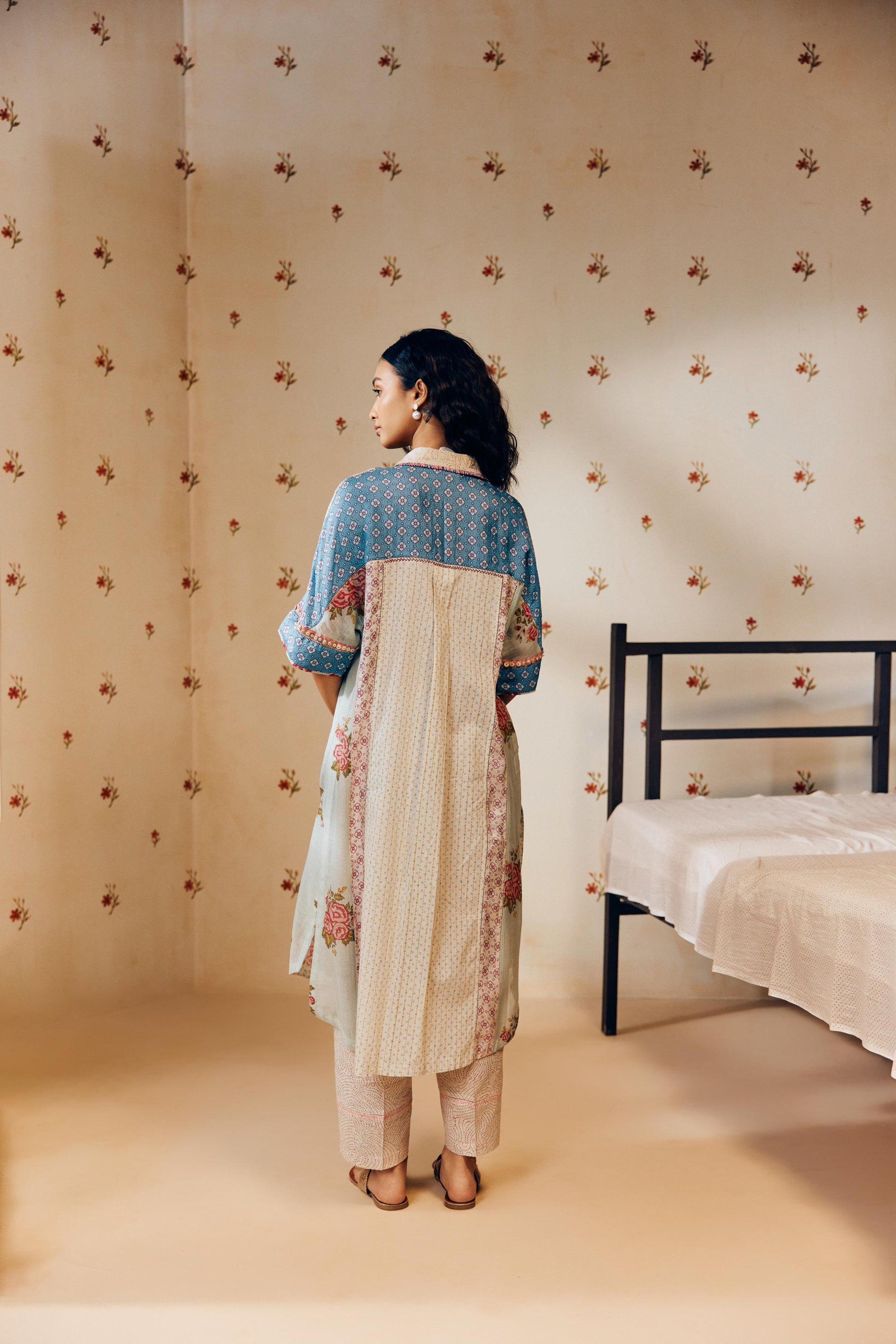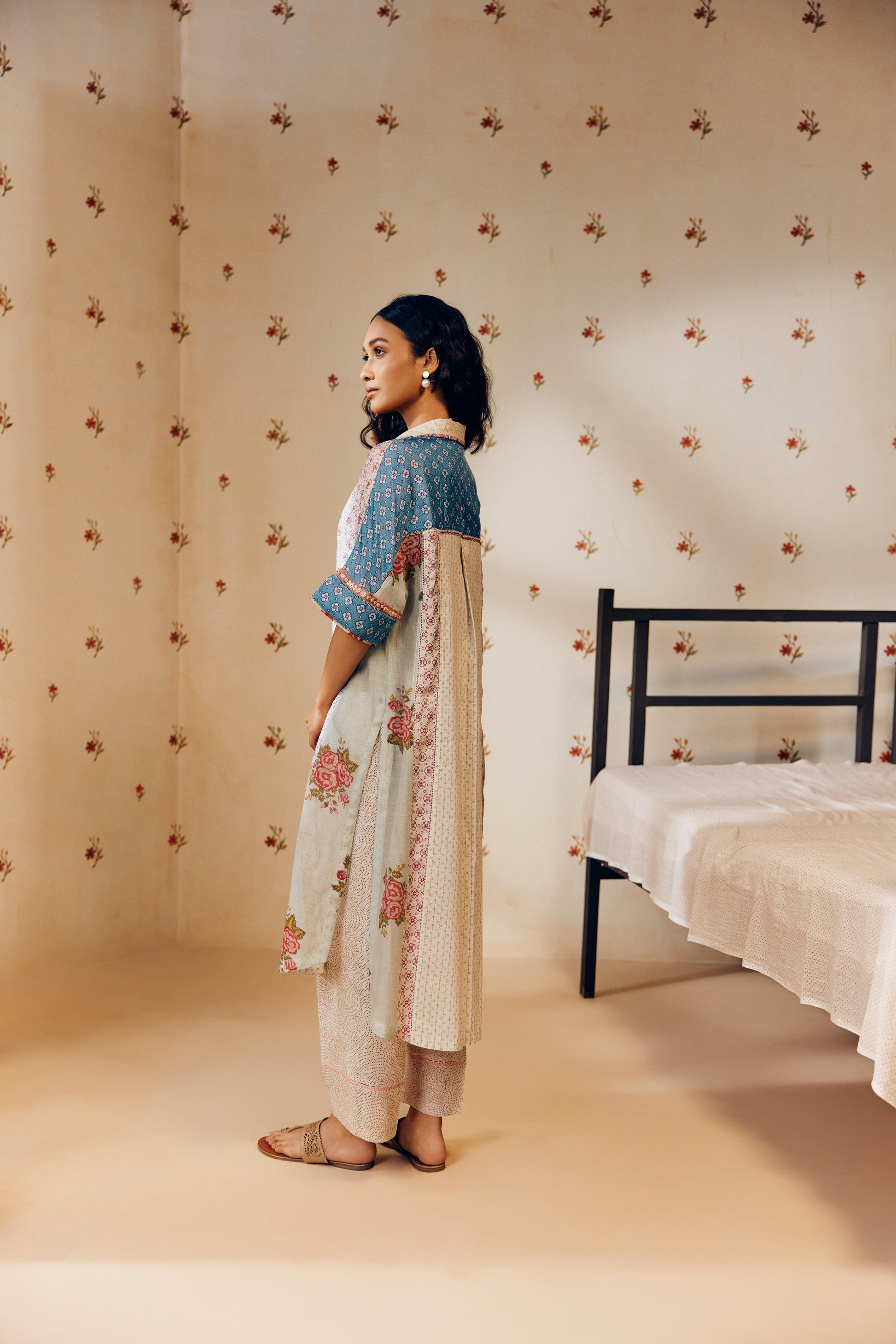 Multi-paneled construction with printed mulberry silk and block printed handloom Chanderi in soothing shades of off-white, greyish blue, and pale blue rose