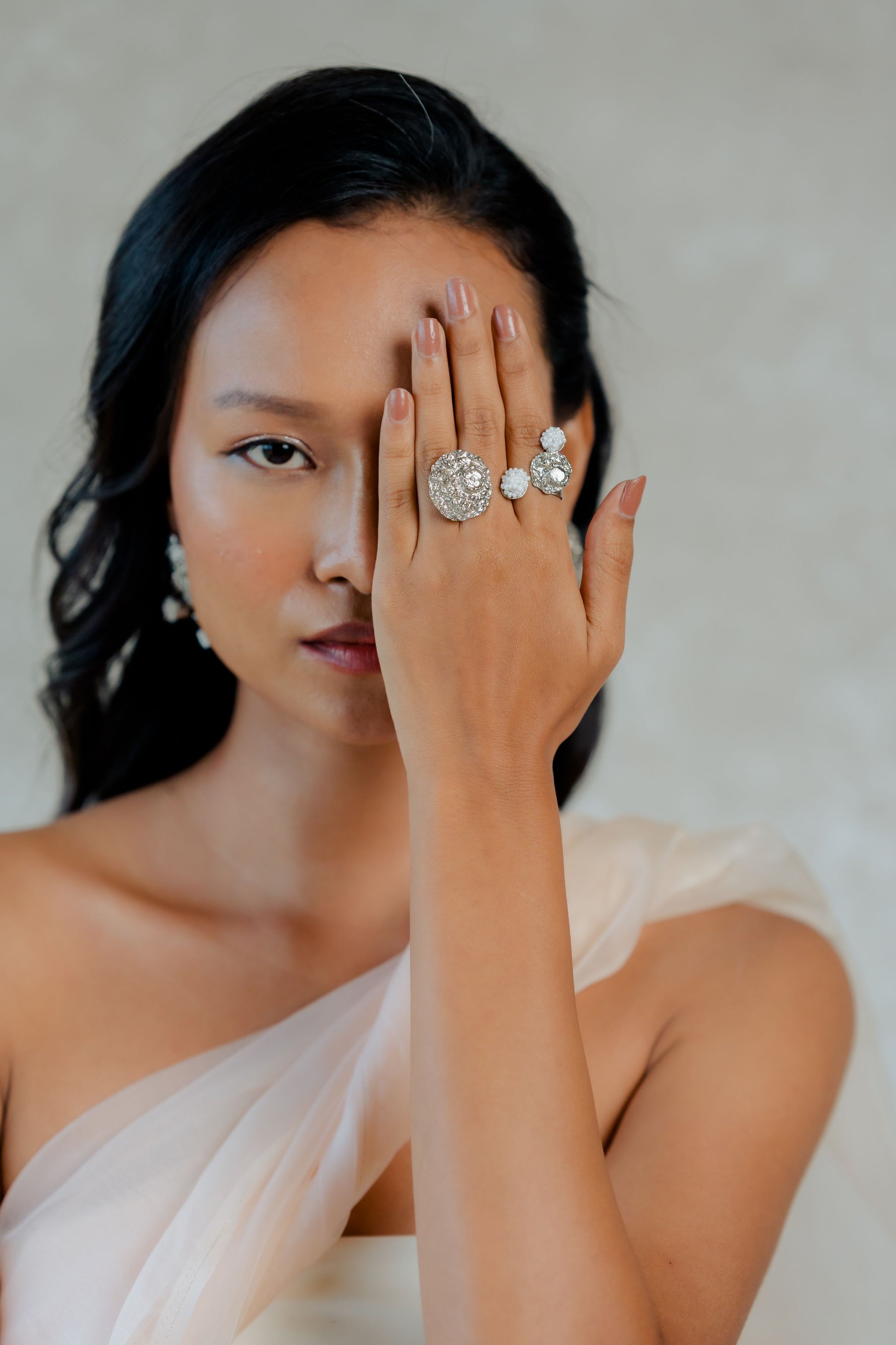 A dual ring with different sizes of Chaand and our signature hand embellished beads makes for a delicate, eccentric piece.