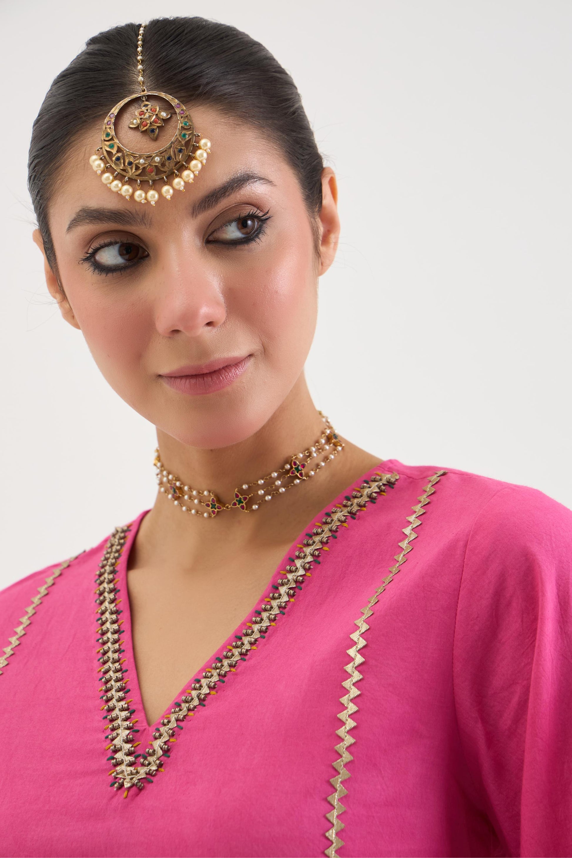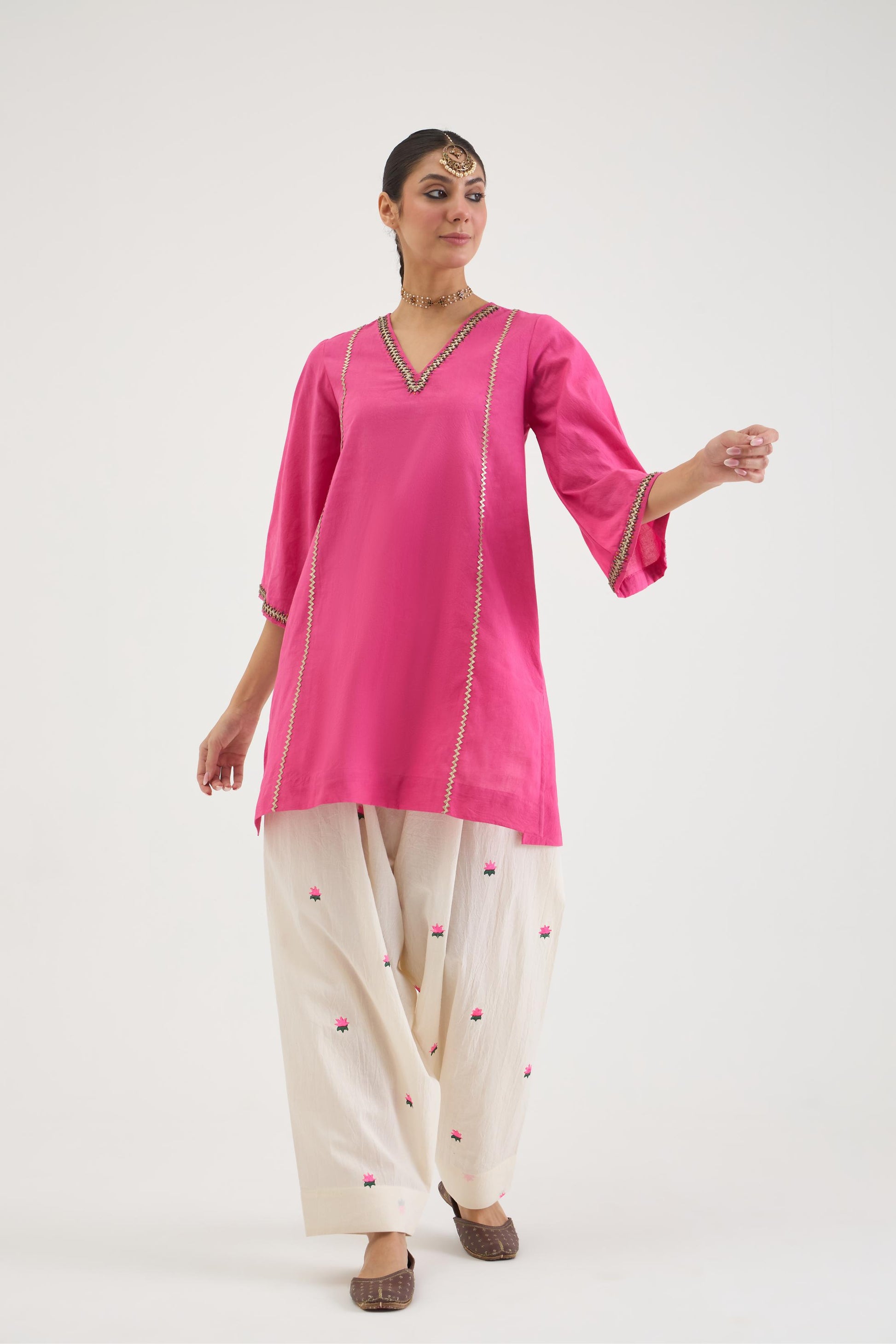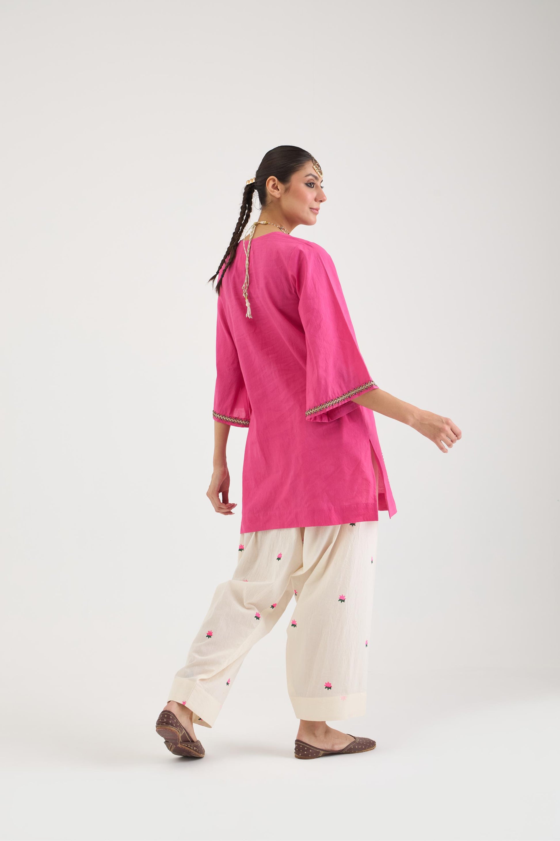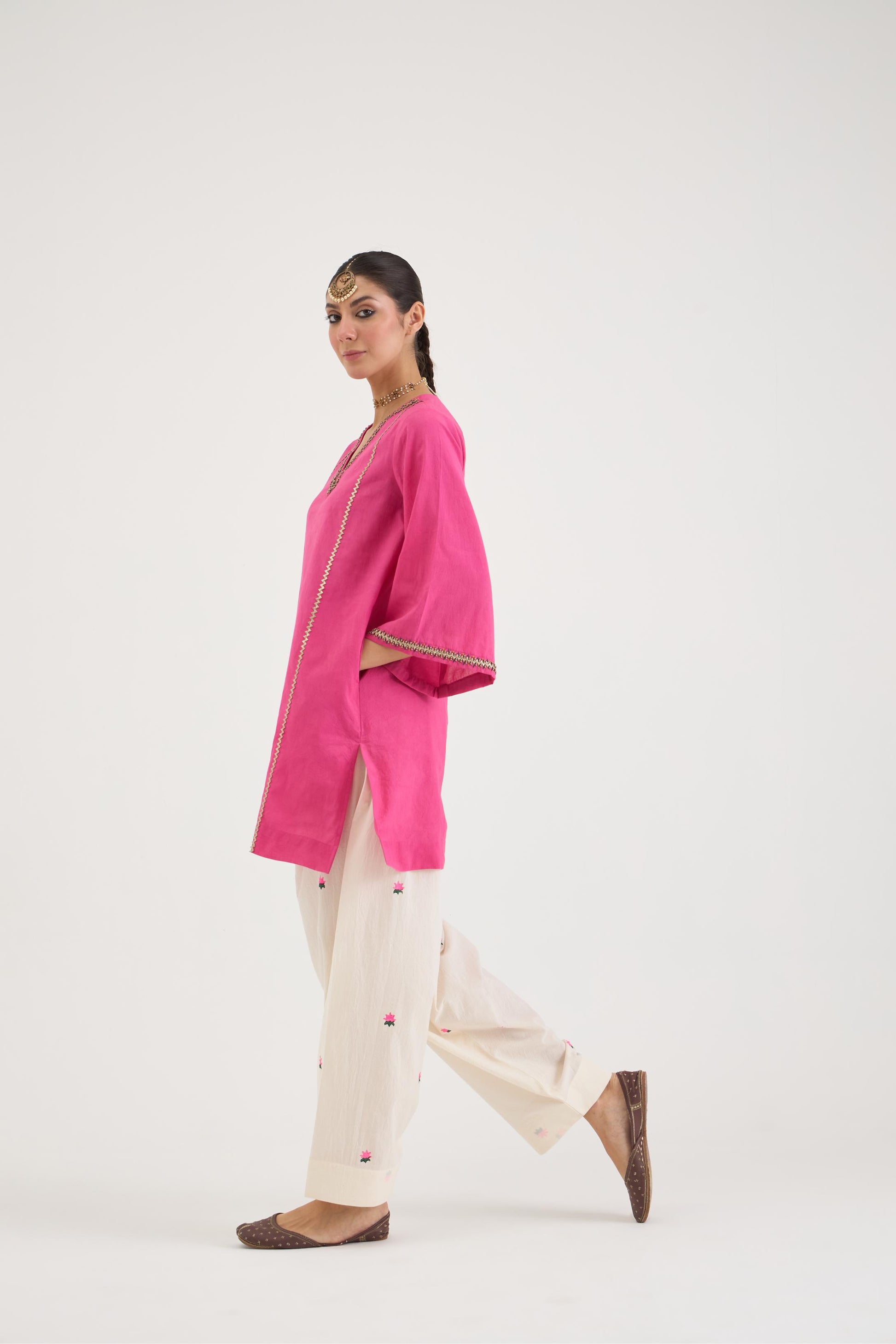 Kalidaar short pink kurta emblished with gota on the kali, intricate hand embroidery on the v-neck and sleeves, paired up with printed farsi pant.