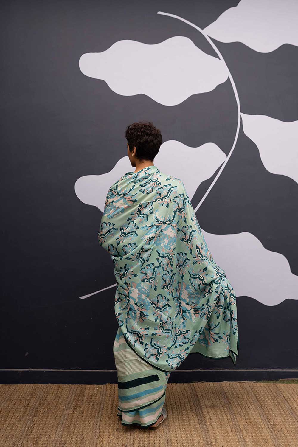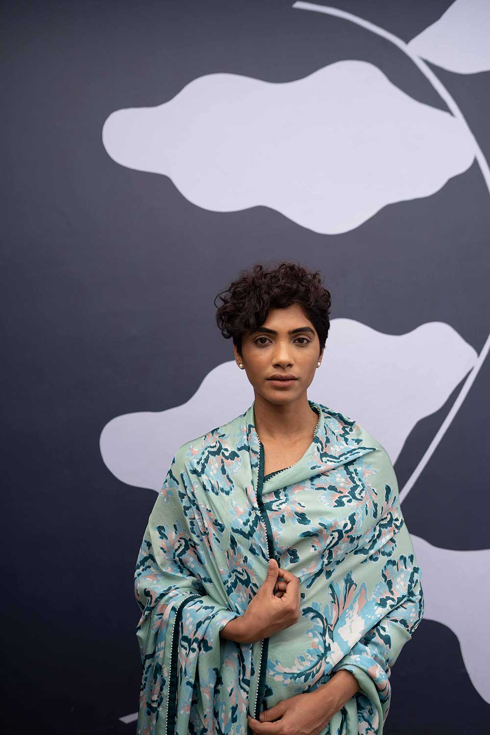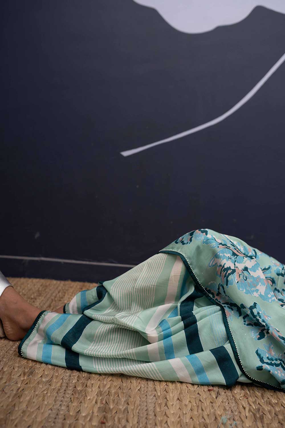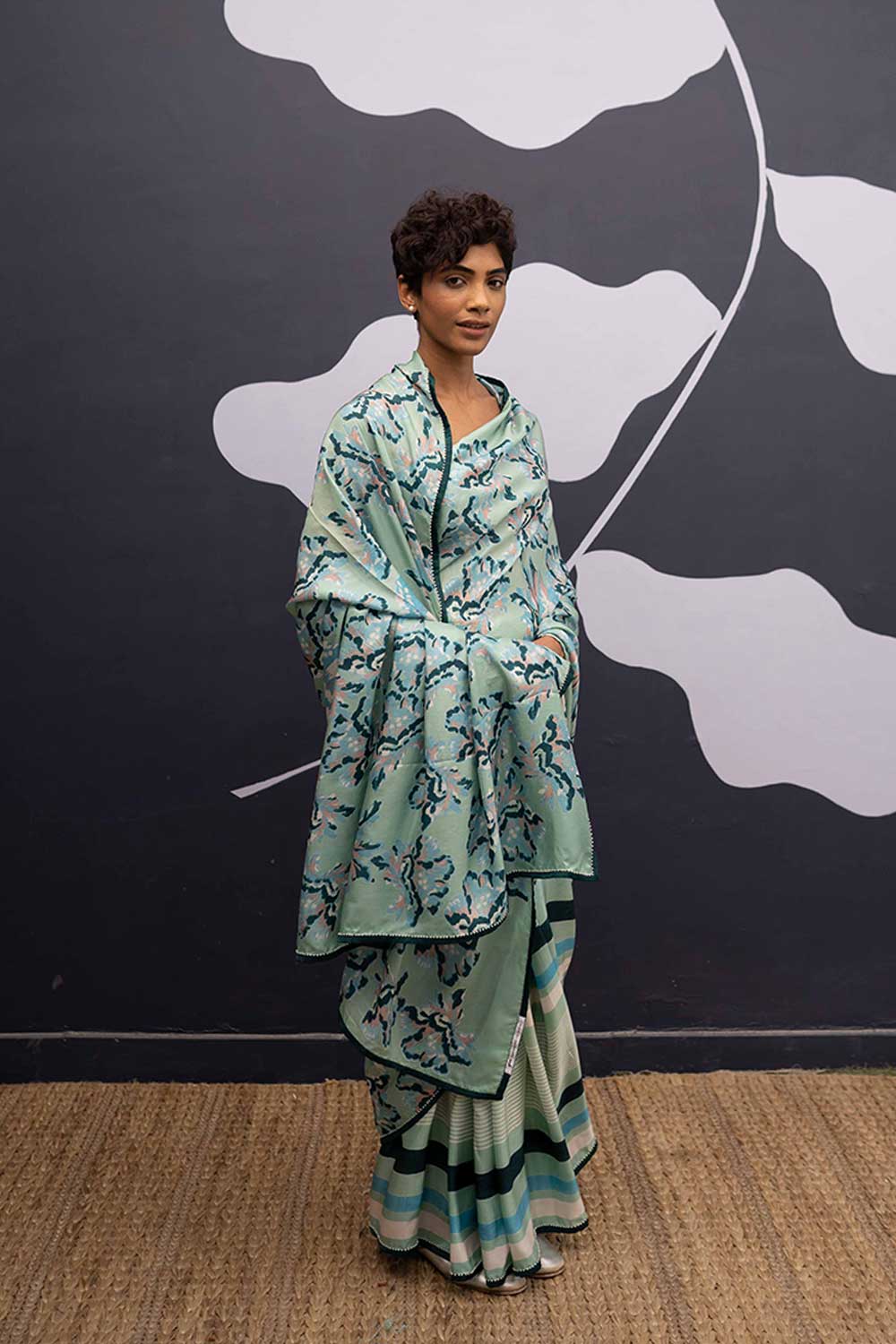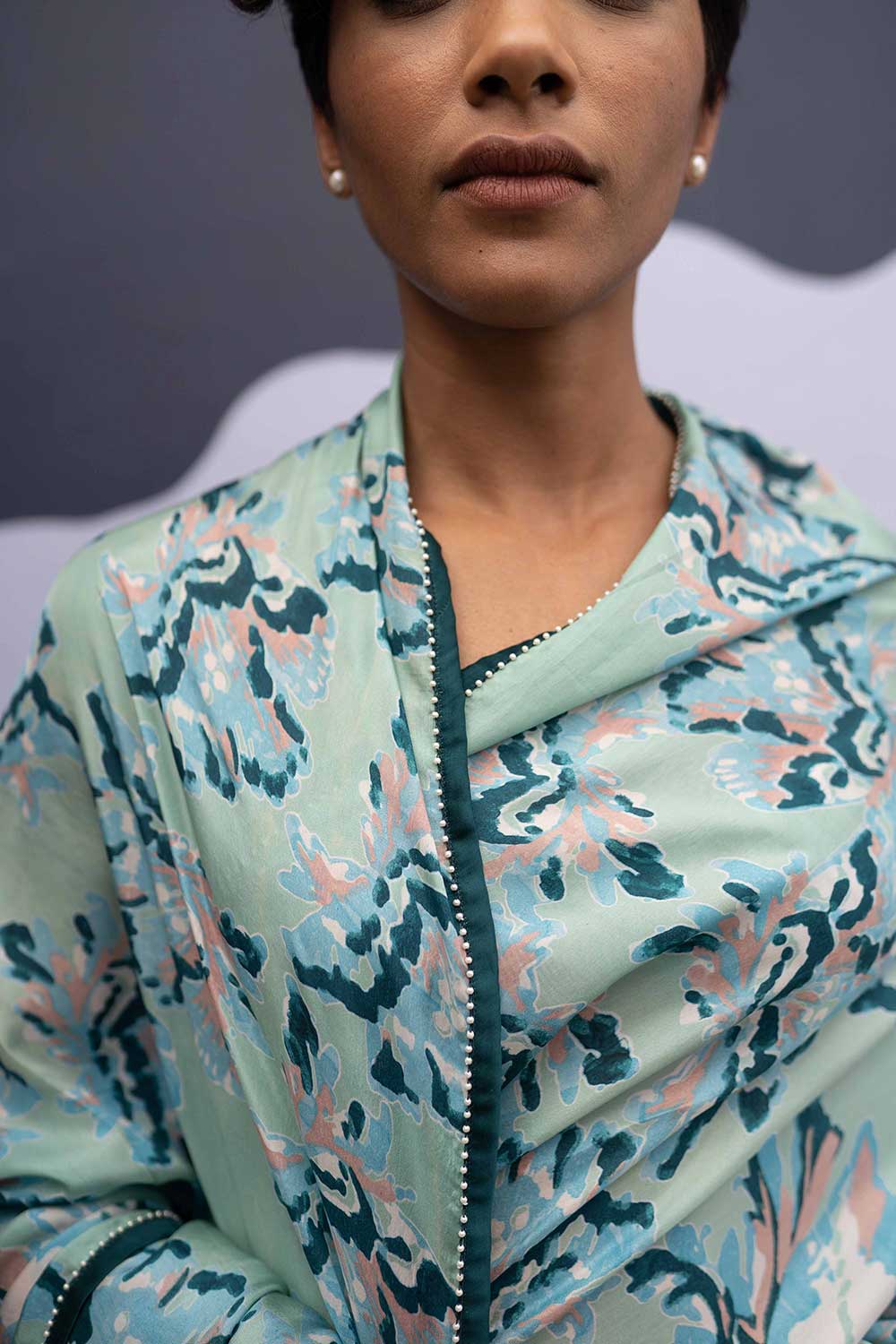The rose island print is a amalgamation of block printed flowers in cotton in shades of mint and green and blue