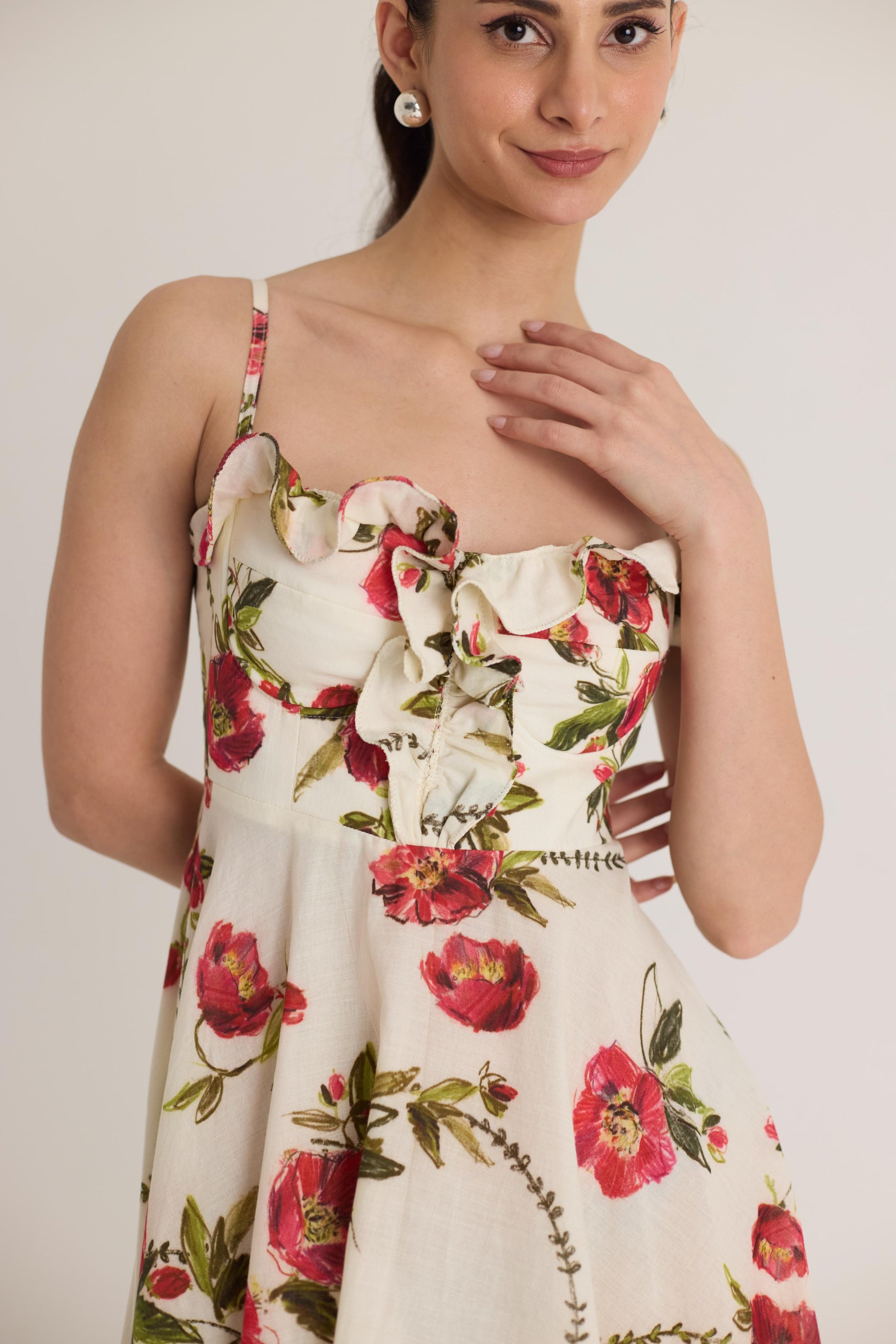 Adorned with a vibrant floral print on a soft ivory base, this dress features blooming red flowers with lush green foliage, creating a fresh and romantic aesthetic.