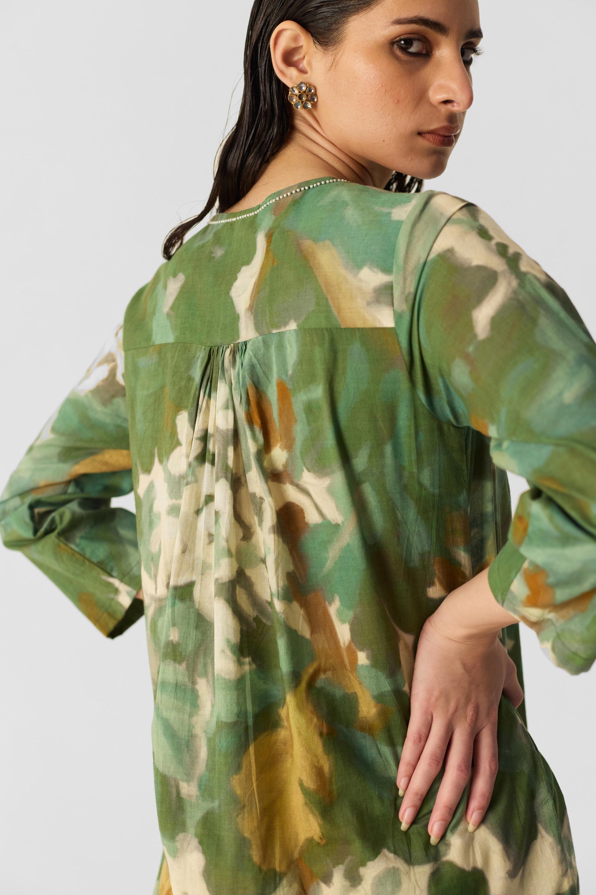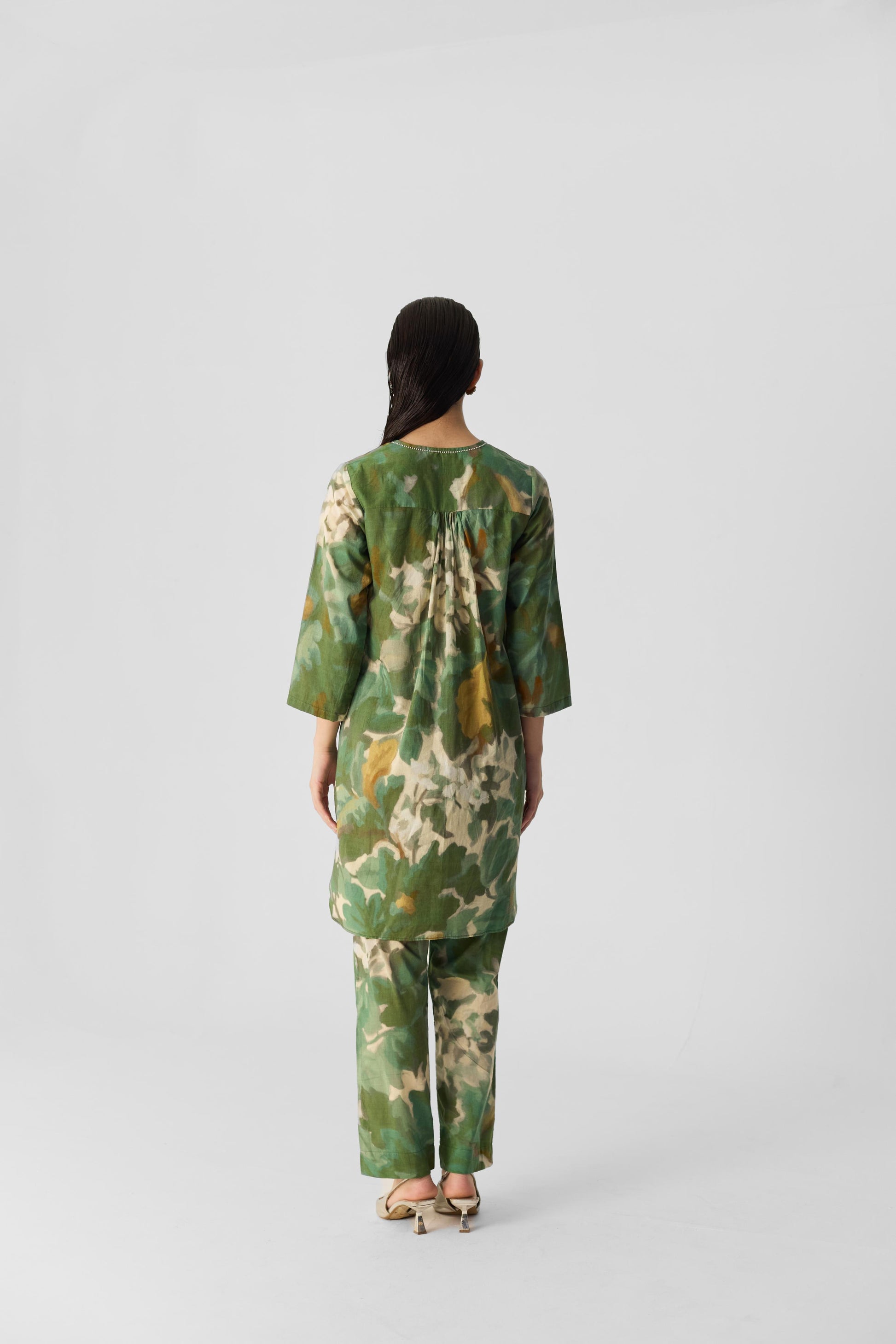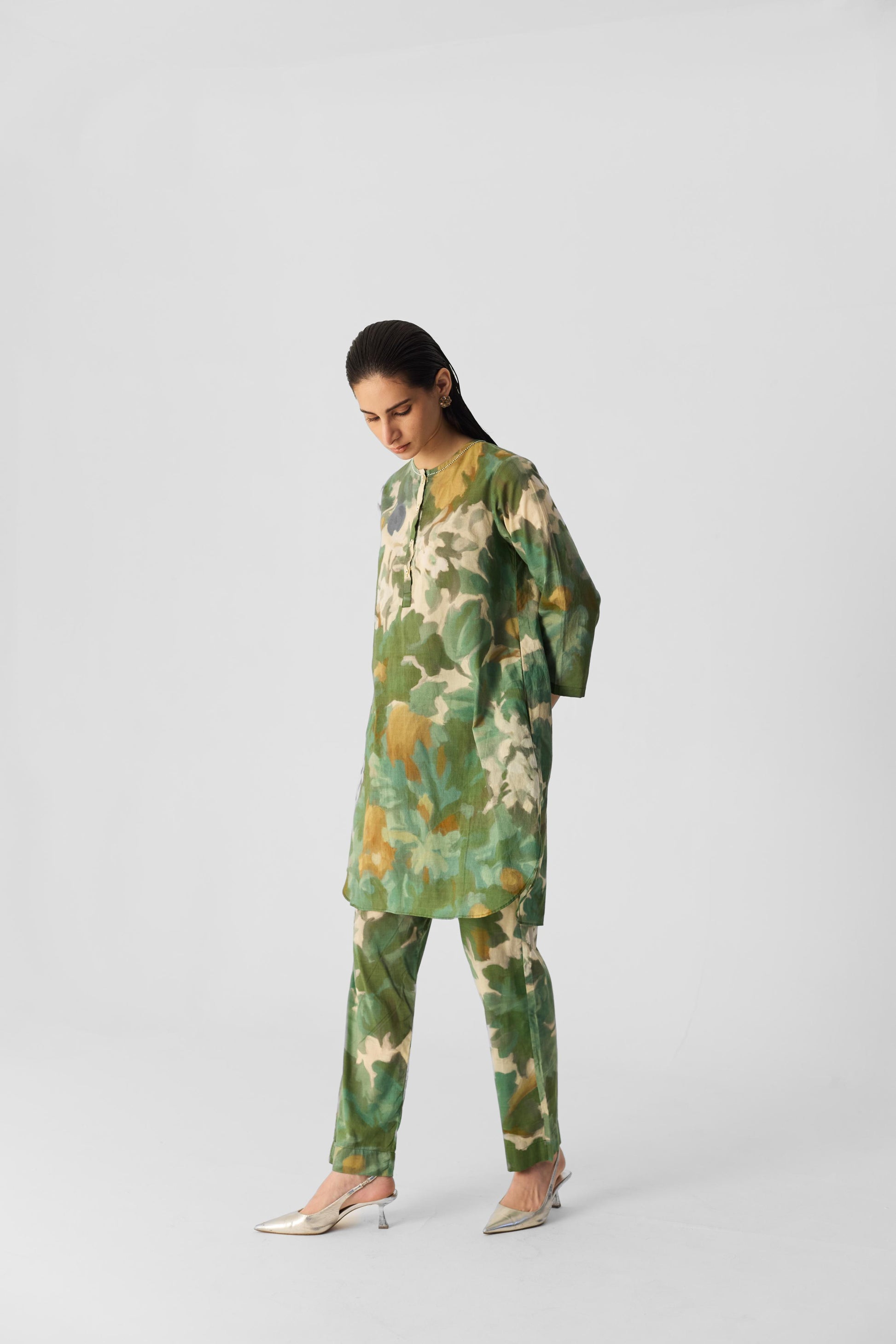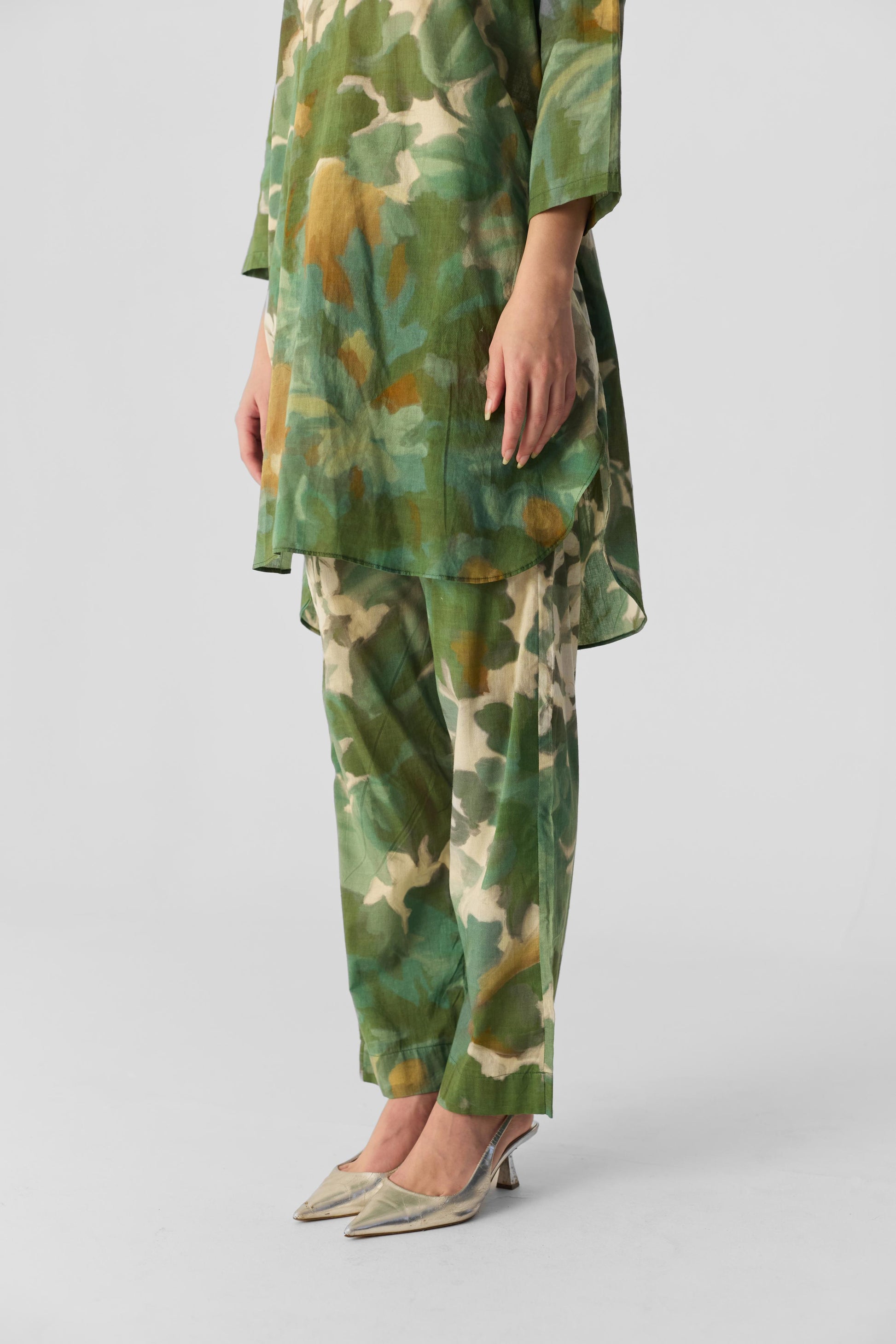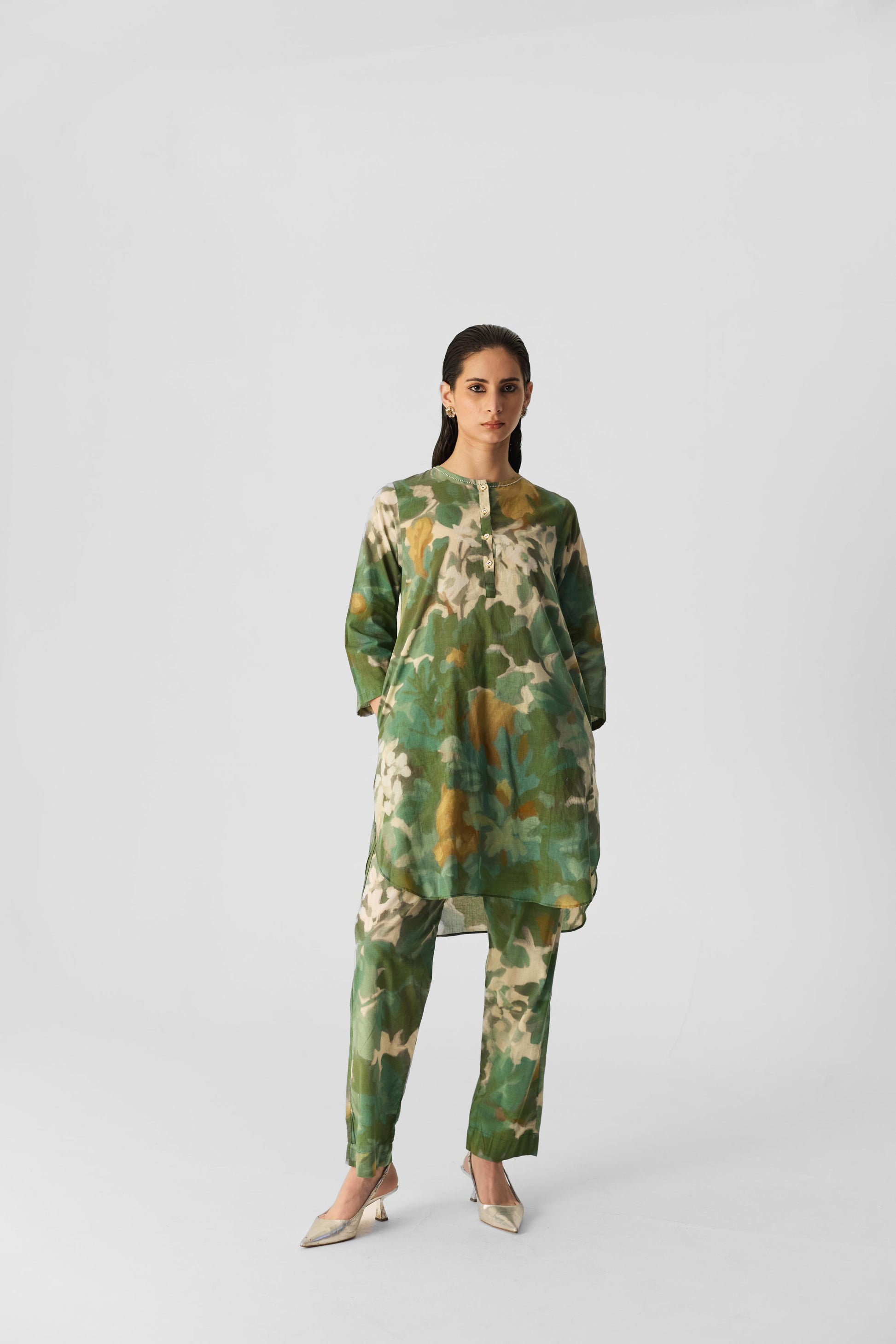 The print of this ensemble is inspired by the lush beauty of jungle flora, featuring vintage-style flowers that evoke a sense of natural elegance. The intricate design blends vibrant blooms with a timeless aesthetic Crafted from soft cotton fabric, the kurta has a round neckline with a front buttoned placket and practical side pockets for added convenience. It is paired with matching printed pants that feature an elasticated waist with front drawstrings for a comfortable fit. The pants also include side pockets, ensuring both style and functionality in this chic ensemble. Perfect for any casual outing or relaxed gathering.