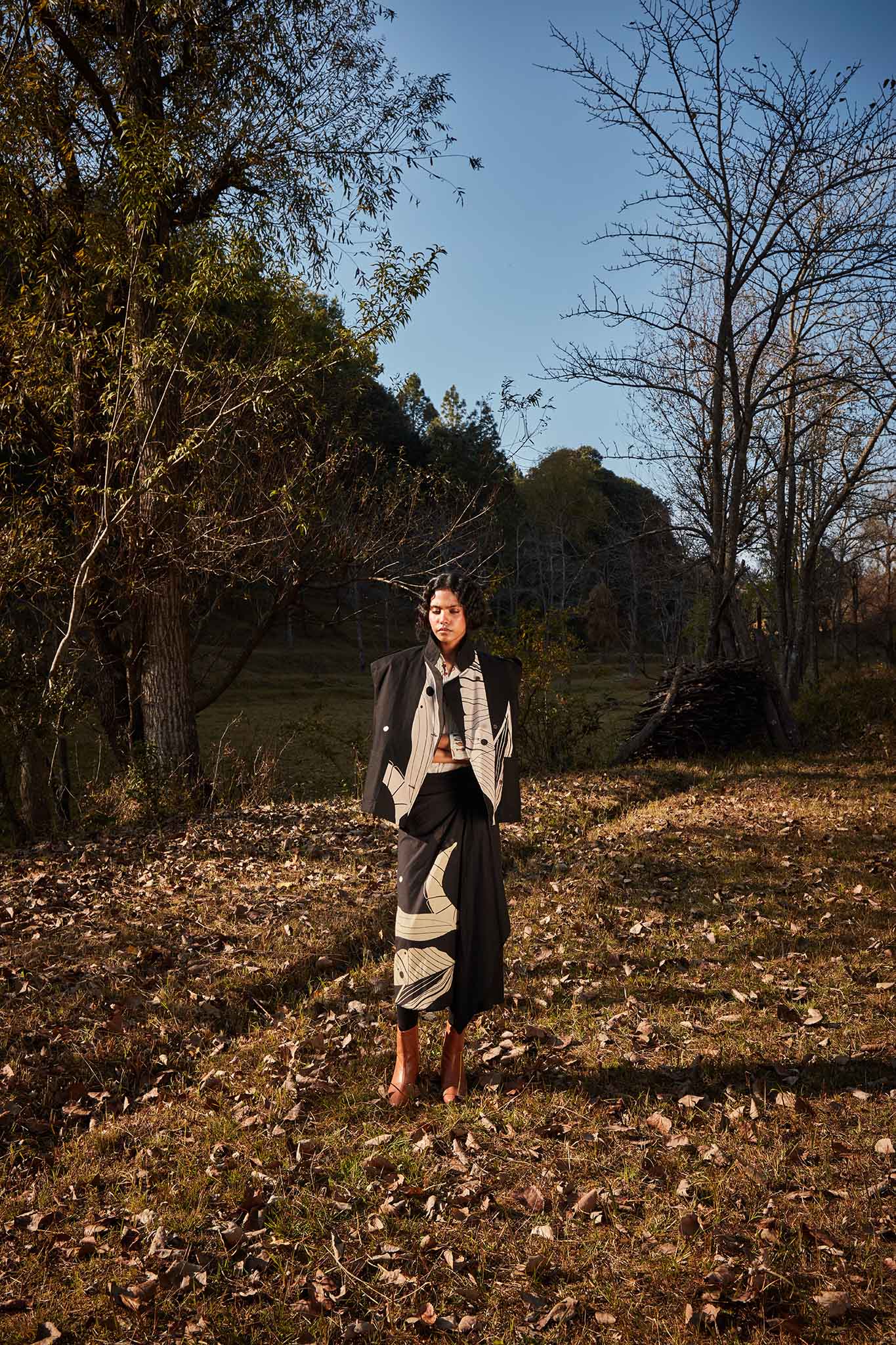 This black printed Oxford wrap skirt is a stand out piece.The wrap design offers a chic, effortless look that's perfect for any occasion, combining style and sophistication with a modern twist. Comes with pleated finishing for the extra glam.