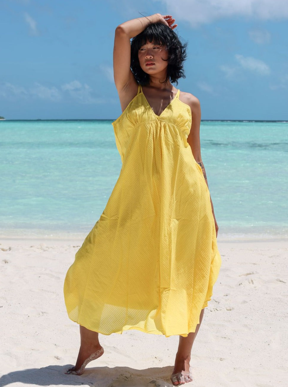 Sunshine yellow strap fit flare midi dress with yoke detailing & side pockets