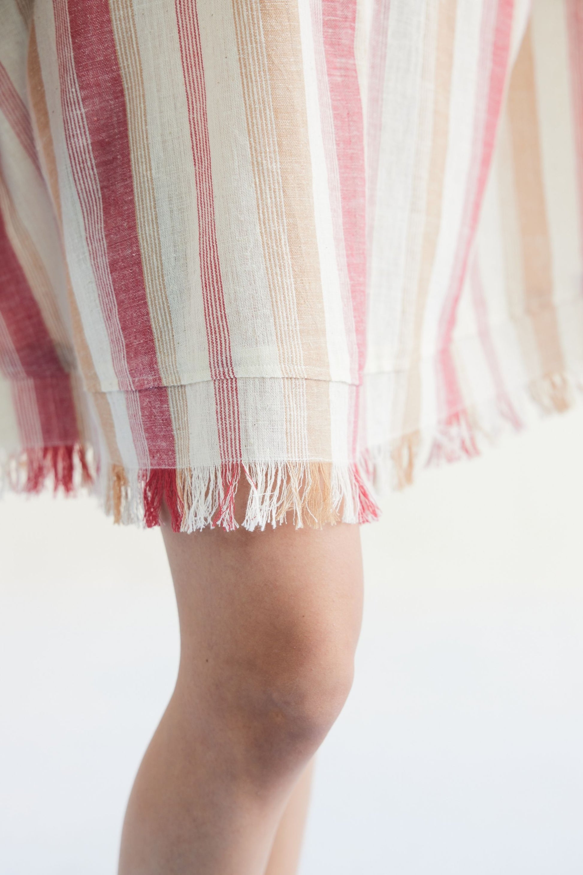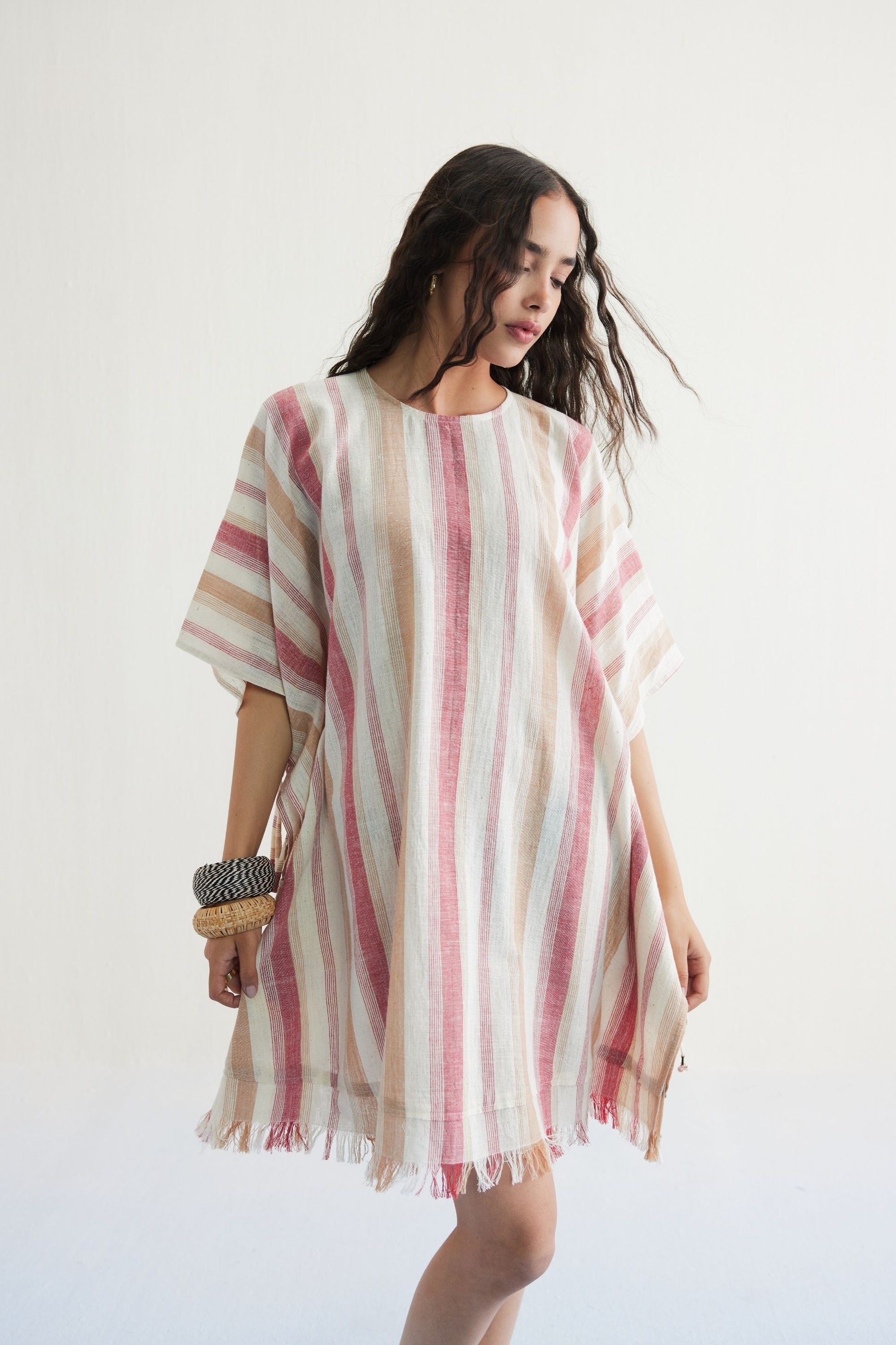 Relaxed fit, half sleeve, round-neck, short kaftan dress that has fabric ties along the sides, crafted in striped azo-free dyed handspun and handwoven Kala cotton fabric.