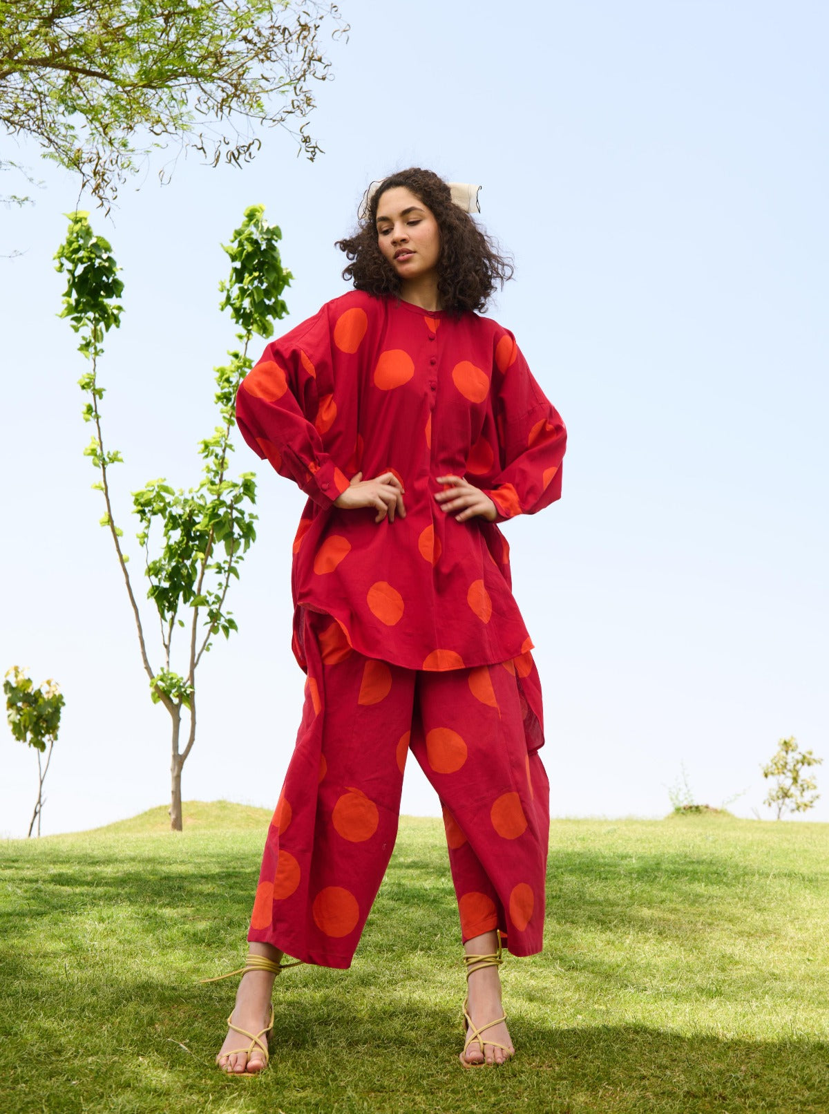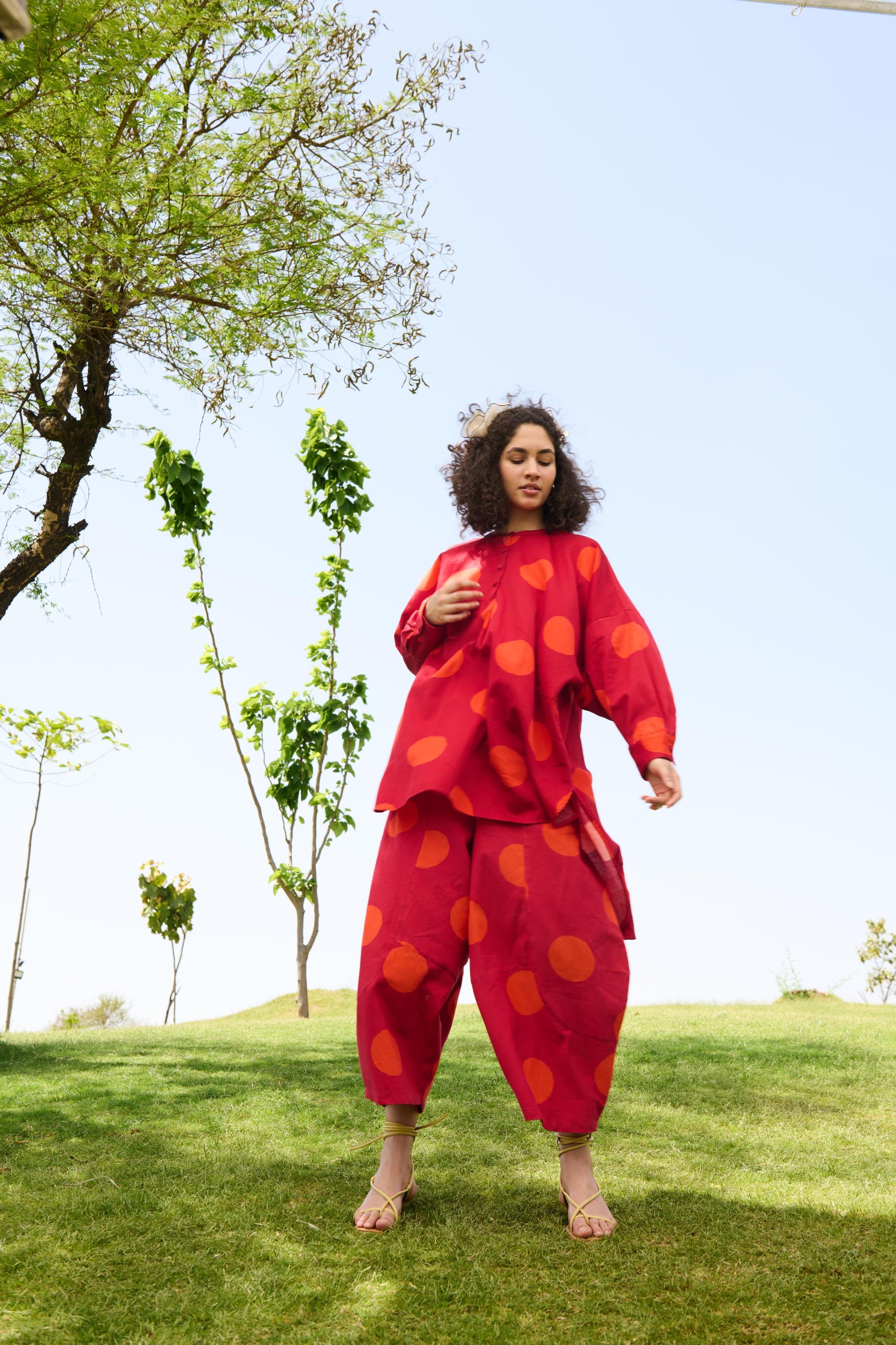 The Salvia Coord set is crafted from our linen cotton oversied tunic in our small orange polka print paired with our balloon panelled pants.