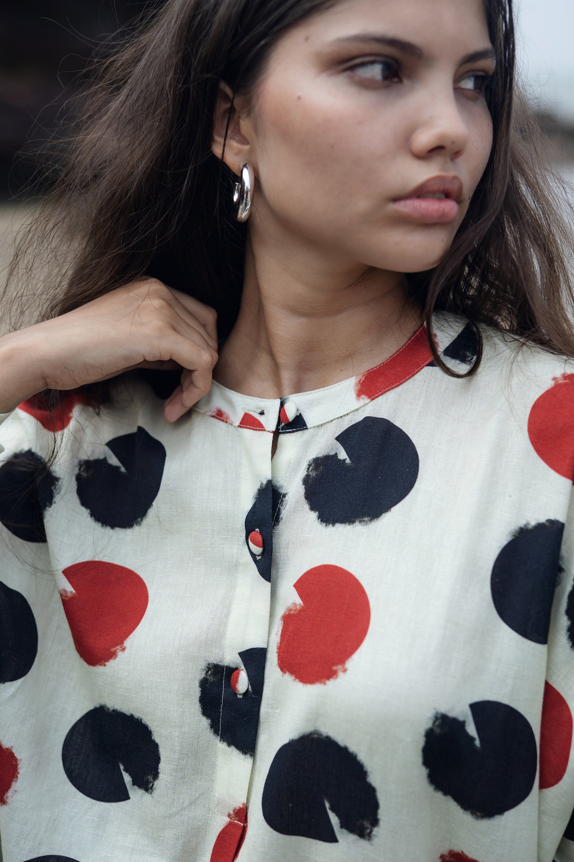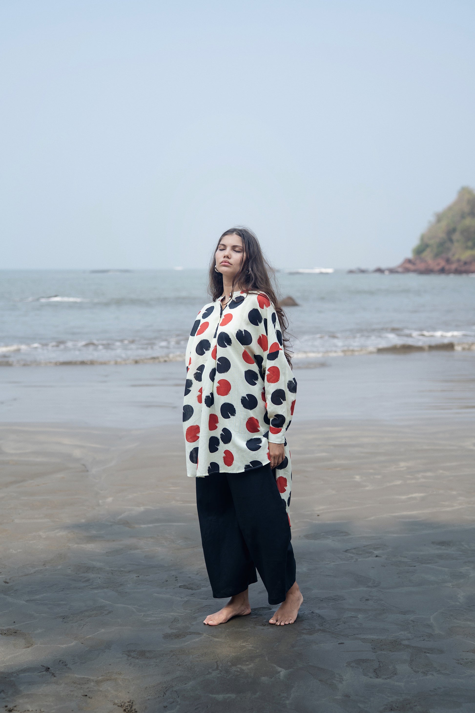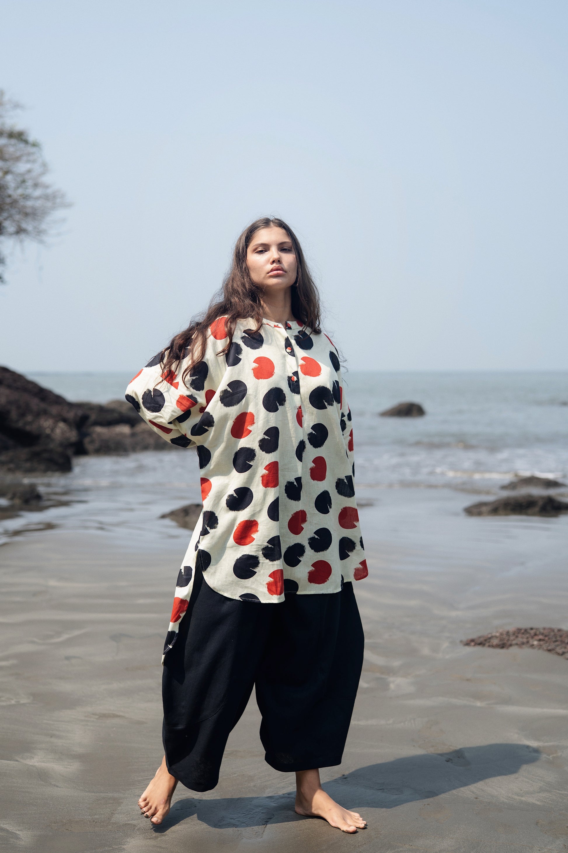 Salvia polka is one of our signature silhouettes which comprises of a anti fit kurta and relxed fit balloon trousers.