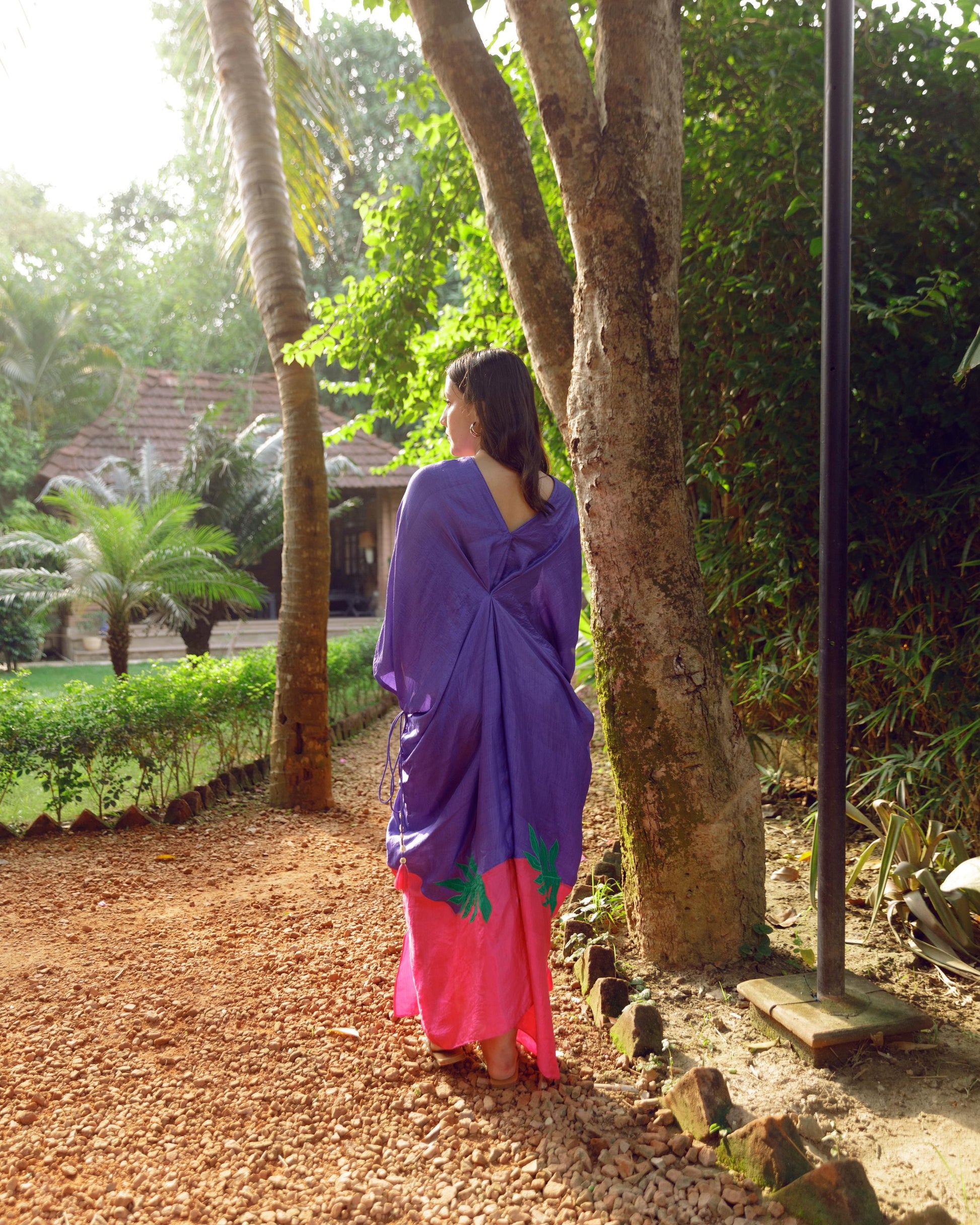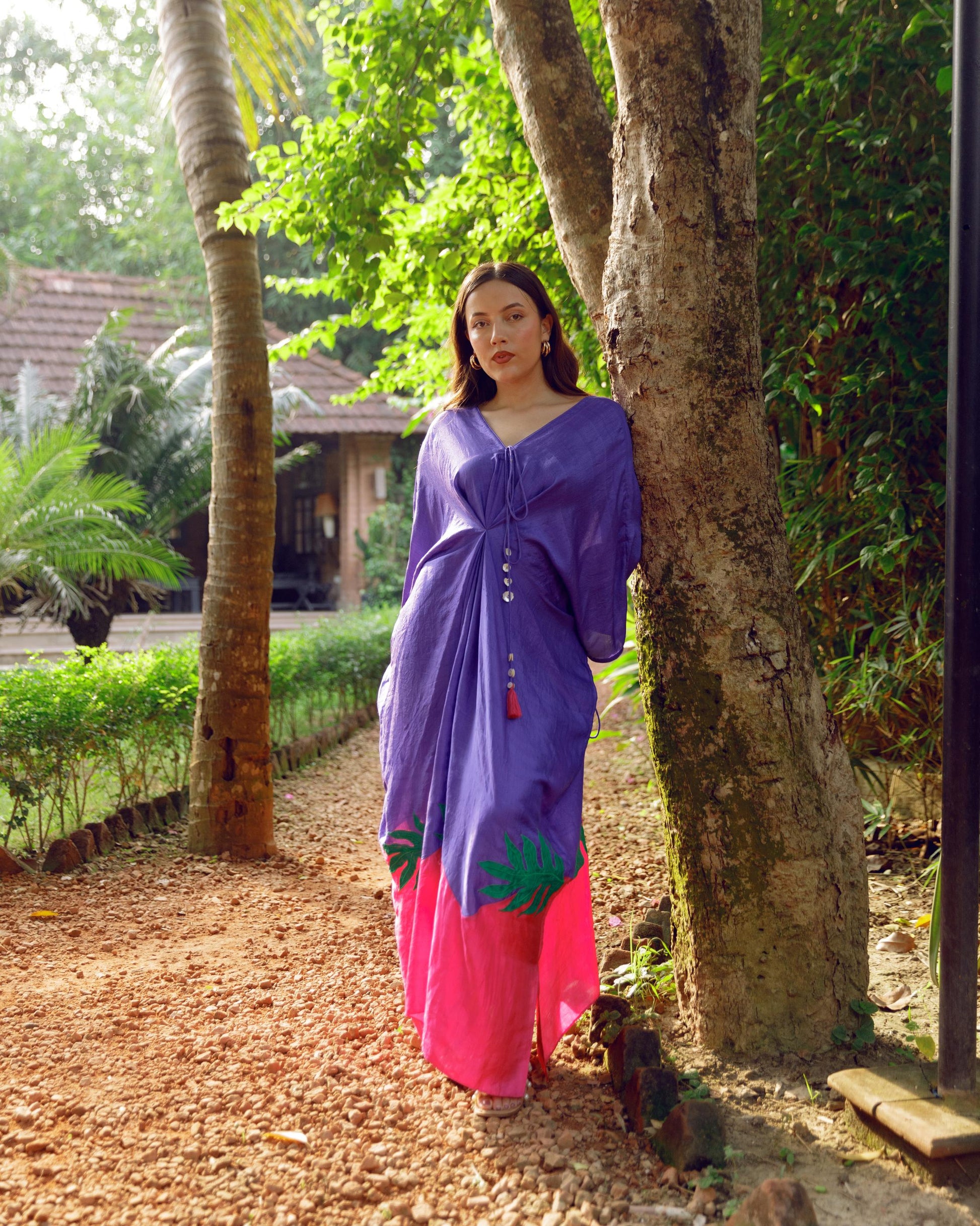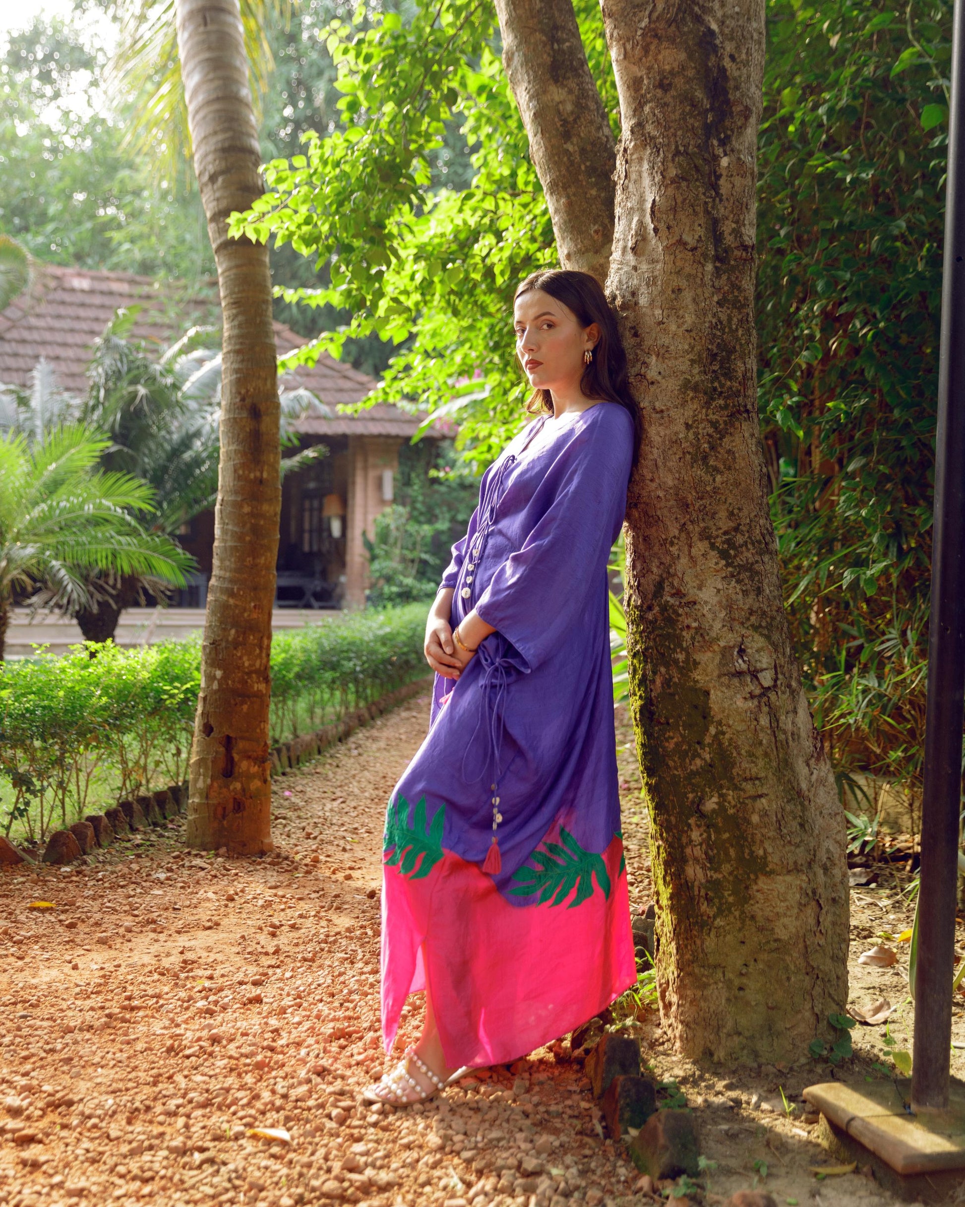 Purple handwoven mulberry silk free size kaftaan with a contrast pink shaped hem and large green aplique leaves. The neck and sleeve hem have a tie up cord detailed with shell embroidery.