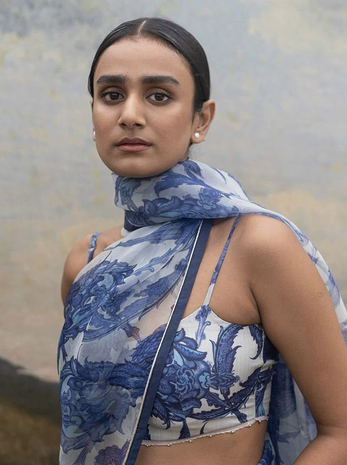 “Santorini” pure silk blouse features massive floral jaals and peacocks in the blue and white hues of greek city Santorini.