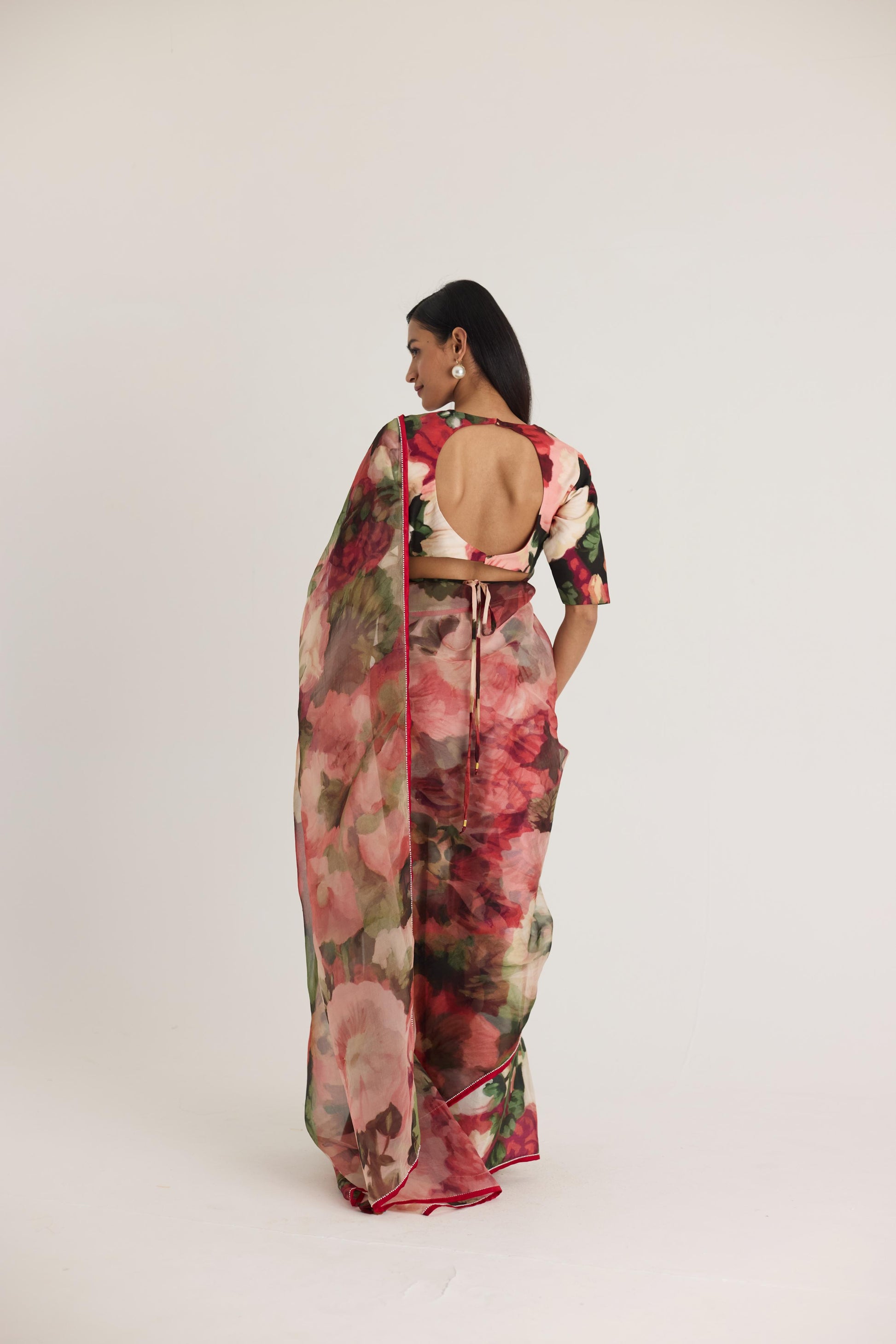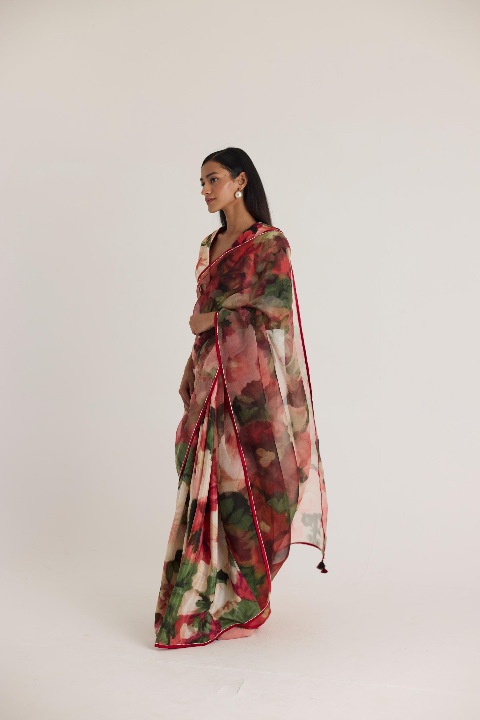 A dreamy, ethereal saree featuring a sheer fabric adorned with a painterly floral print in deep reds, pinks, and lush greens. The fluid drape and delicate red piping along the edges add to its timeless elegance, making it a versatile choice for both festive and formal occasions.