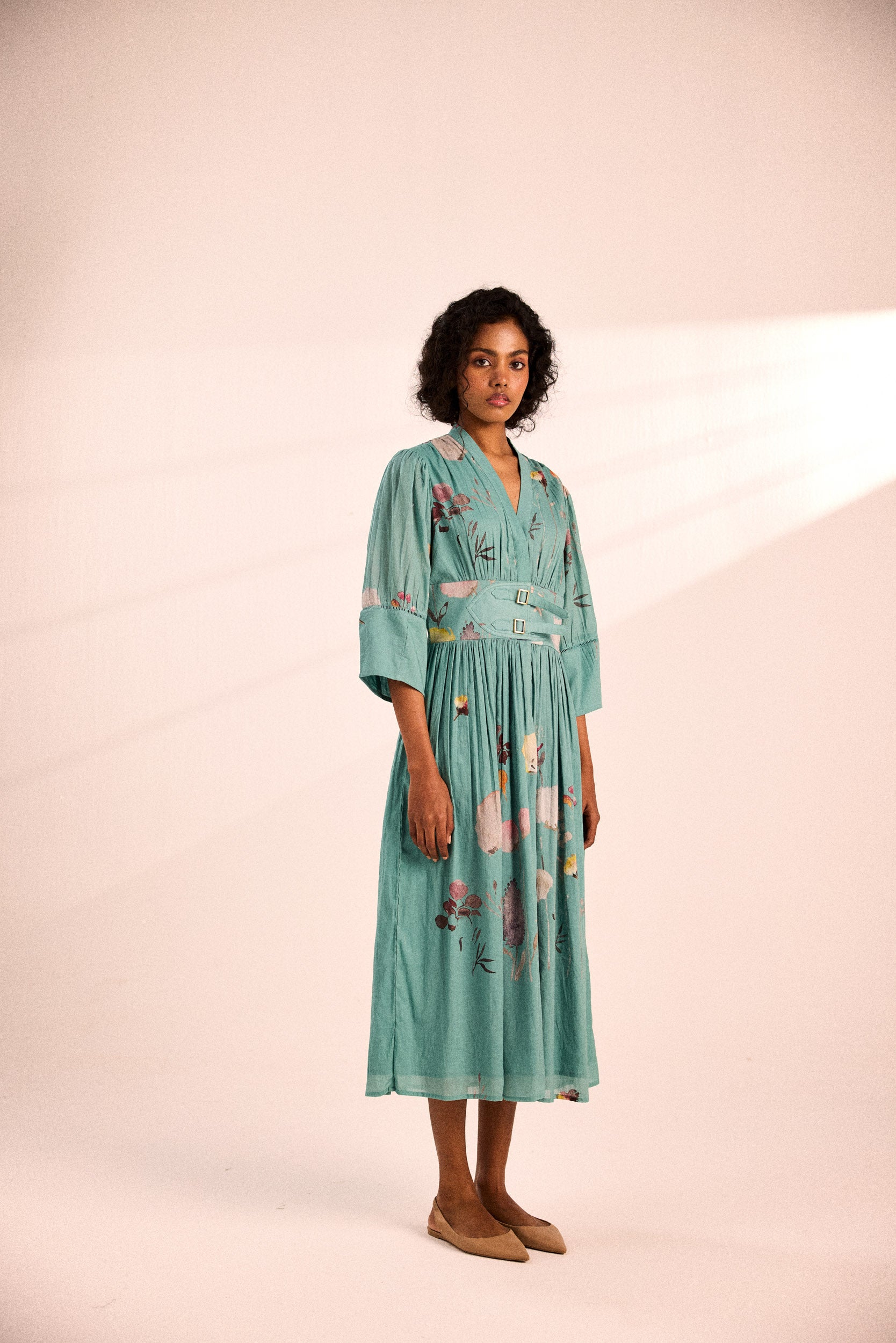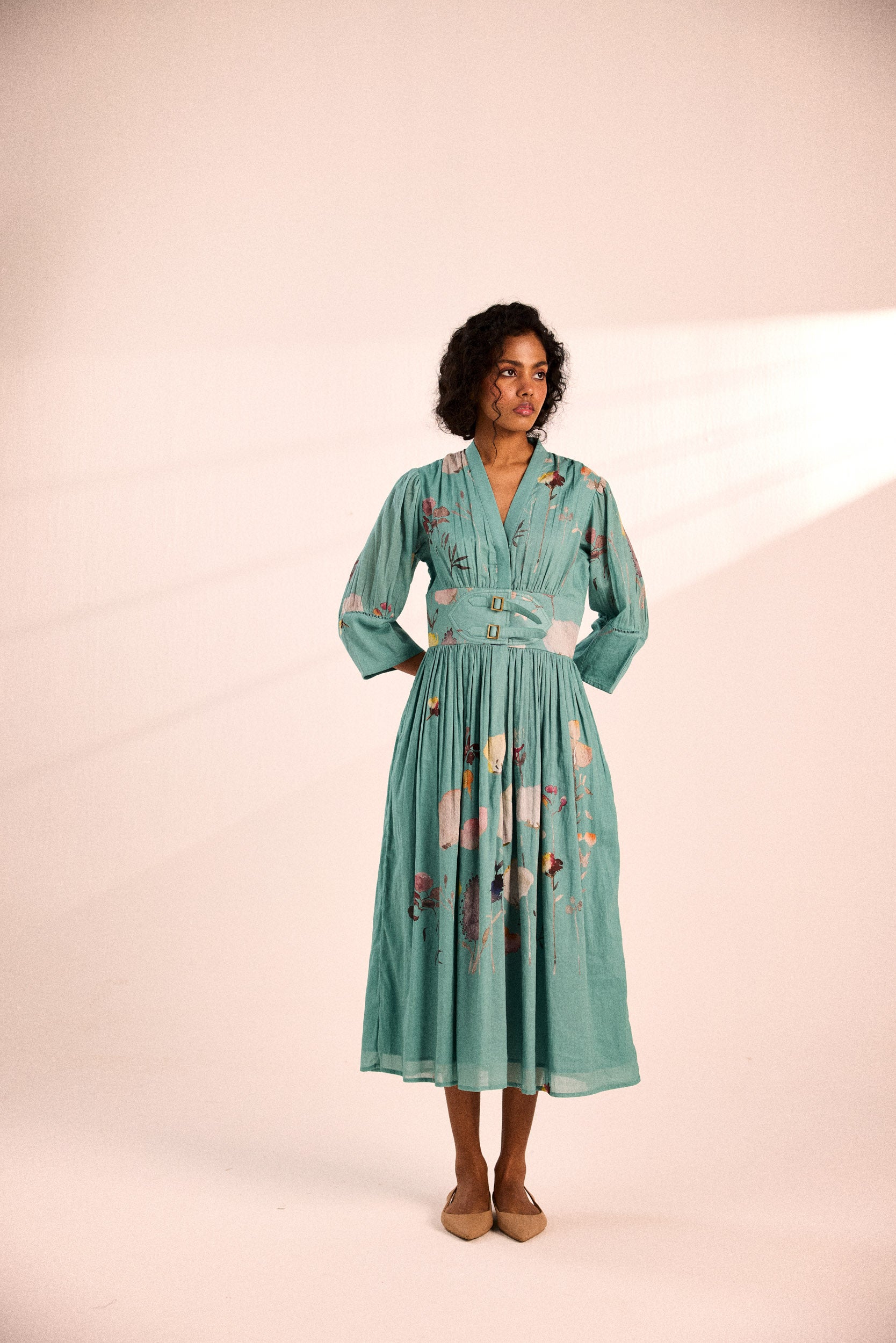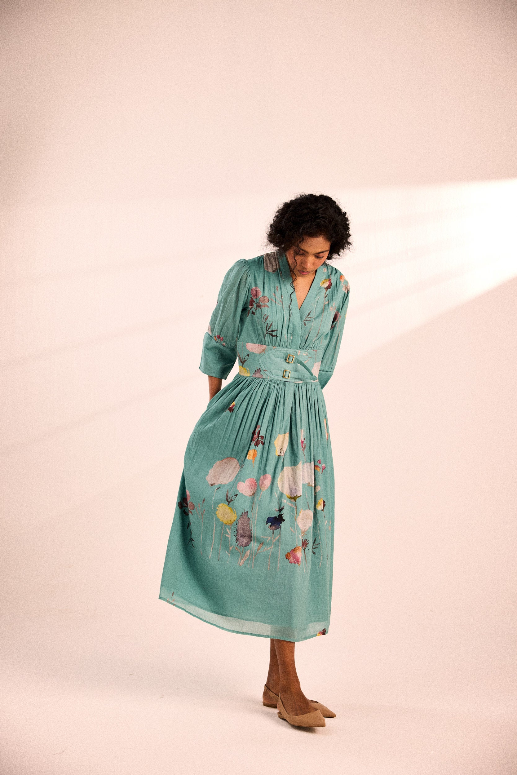 A stunning seablue dress with an artsy floral print, featuring a fitted waist with adjustable buckles for a customized fit.