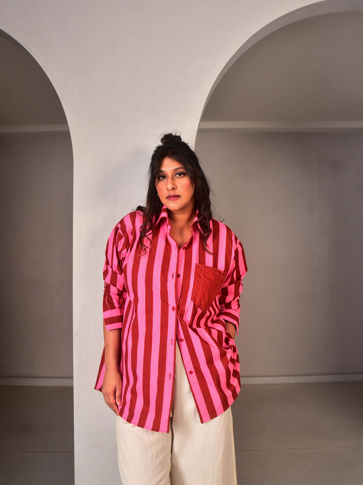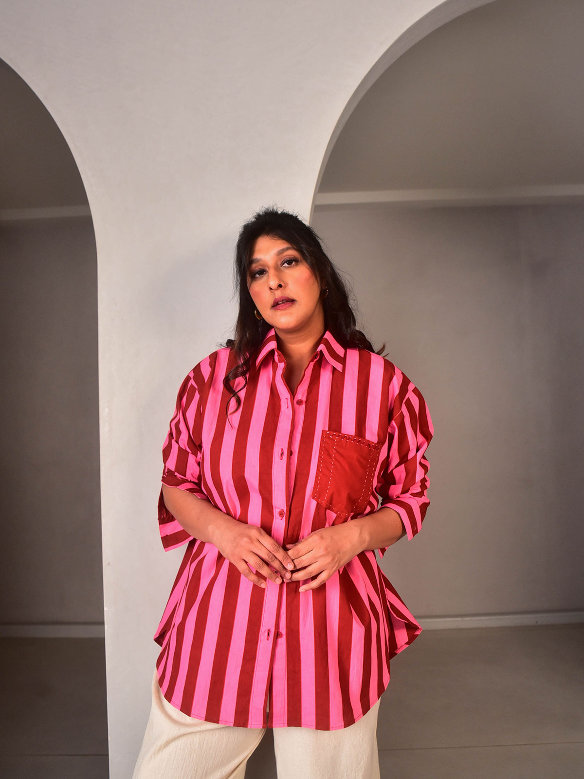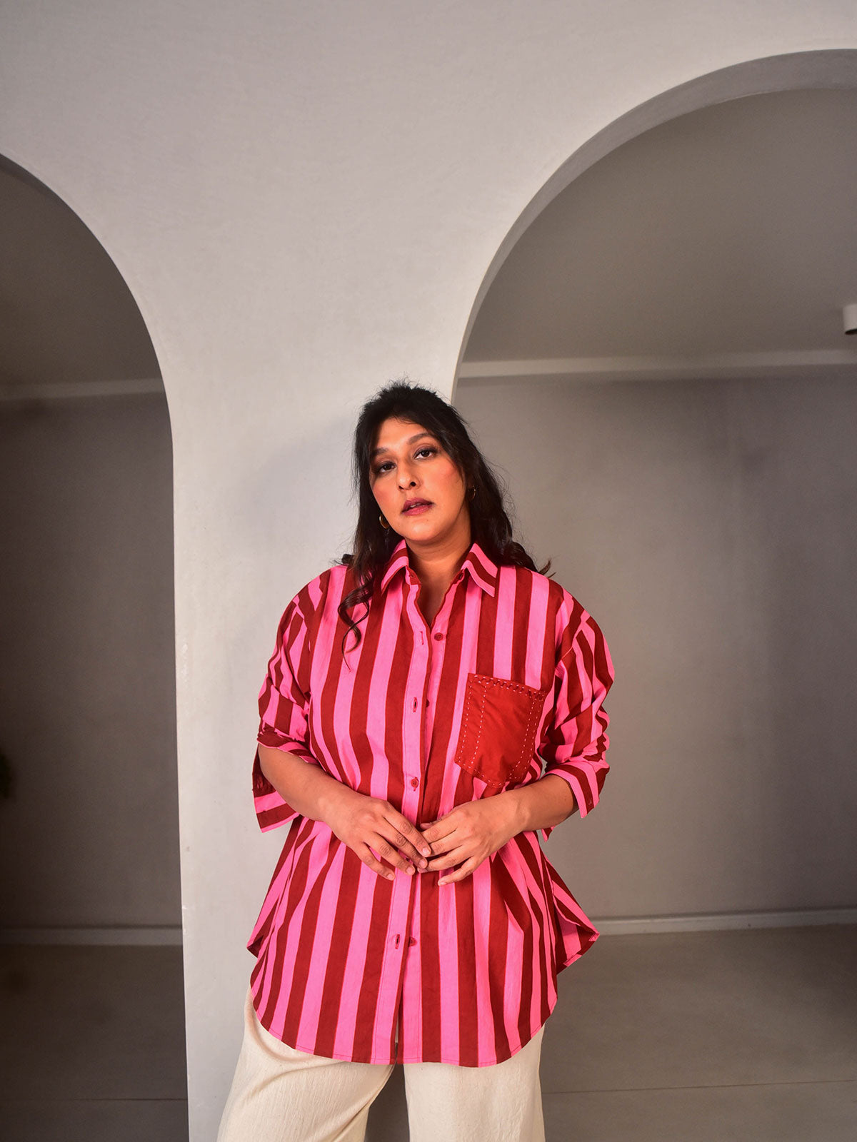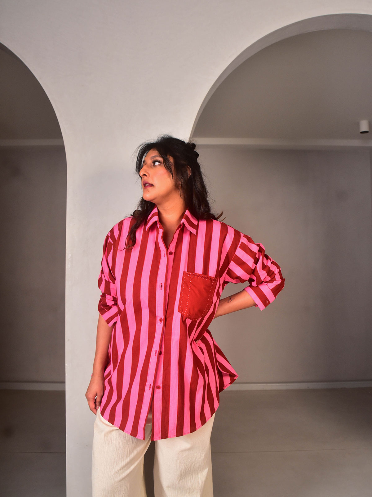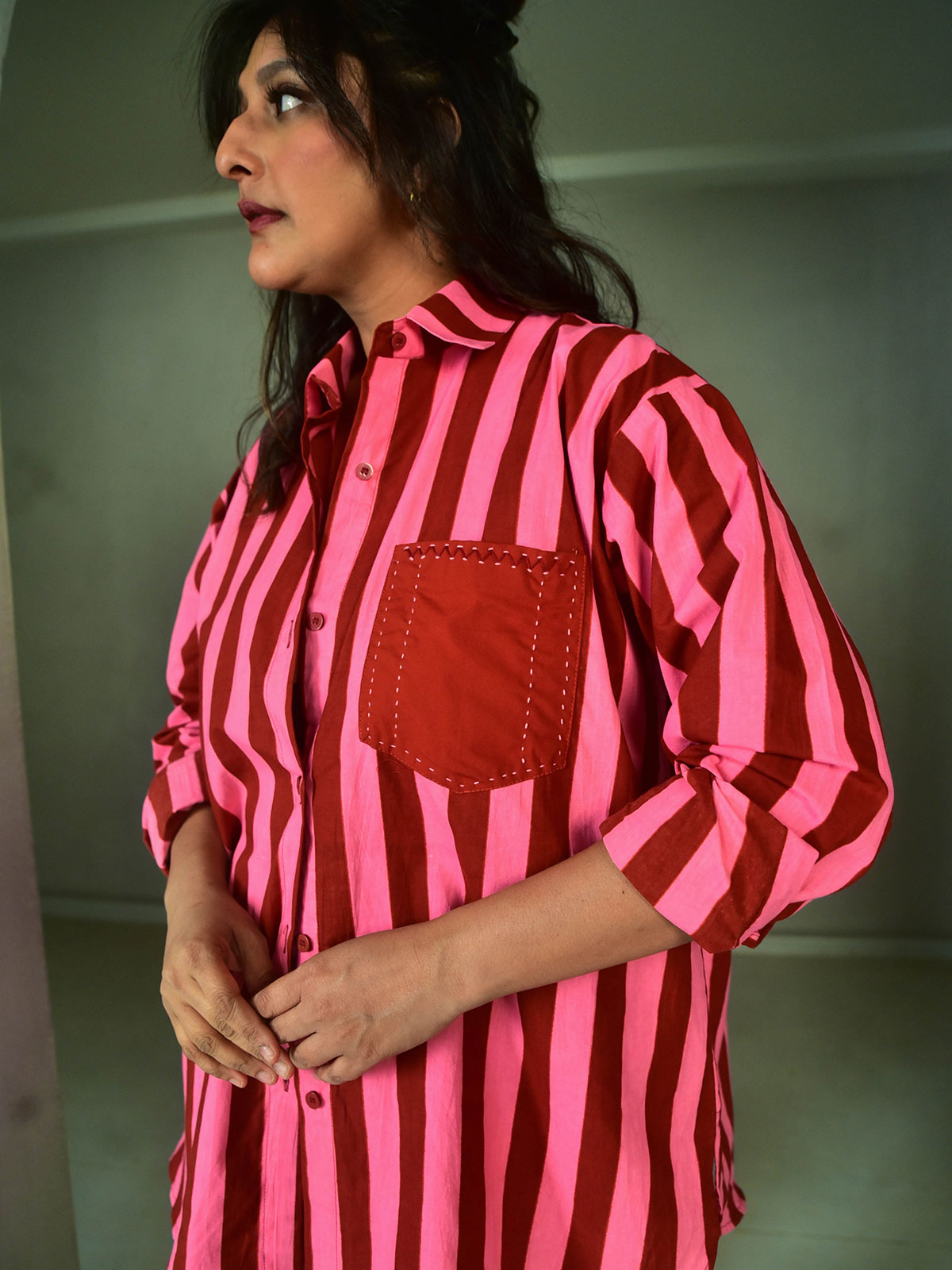 Breezy silhouette meets rich colours. Cut in our exclusive Pink and Maroon striped hand-screen printed cotton. This oversized shirt brings a pop of colour to your wardrobe. Classic collars, hand embroidery detailing on the pocket and buttons down the centre.