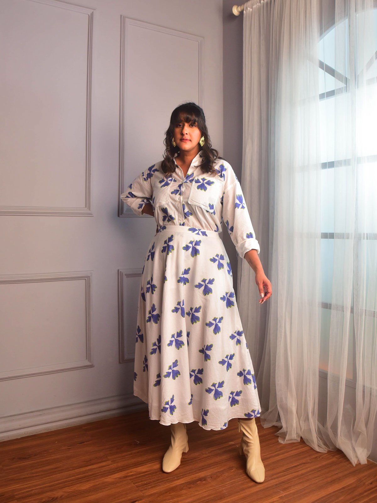 A billowy flared skirt for the festive season. Cut in our exclusive blue and white floral block-printed cotton a classic Umbrella skirt with a waist band and two inseam pockets.
