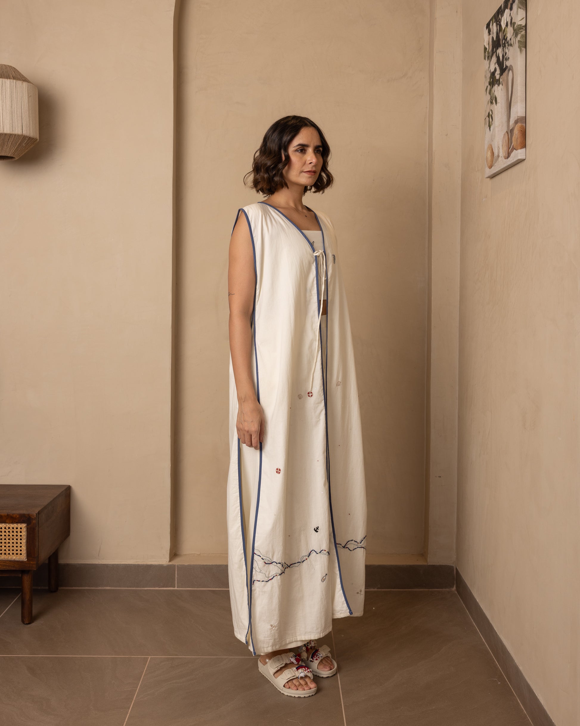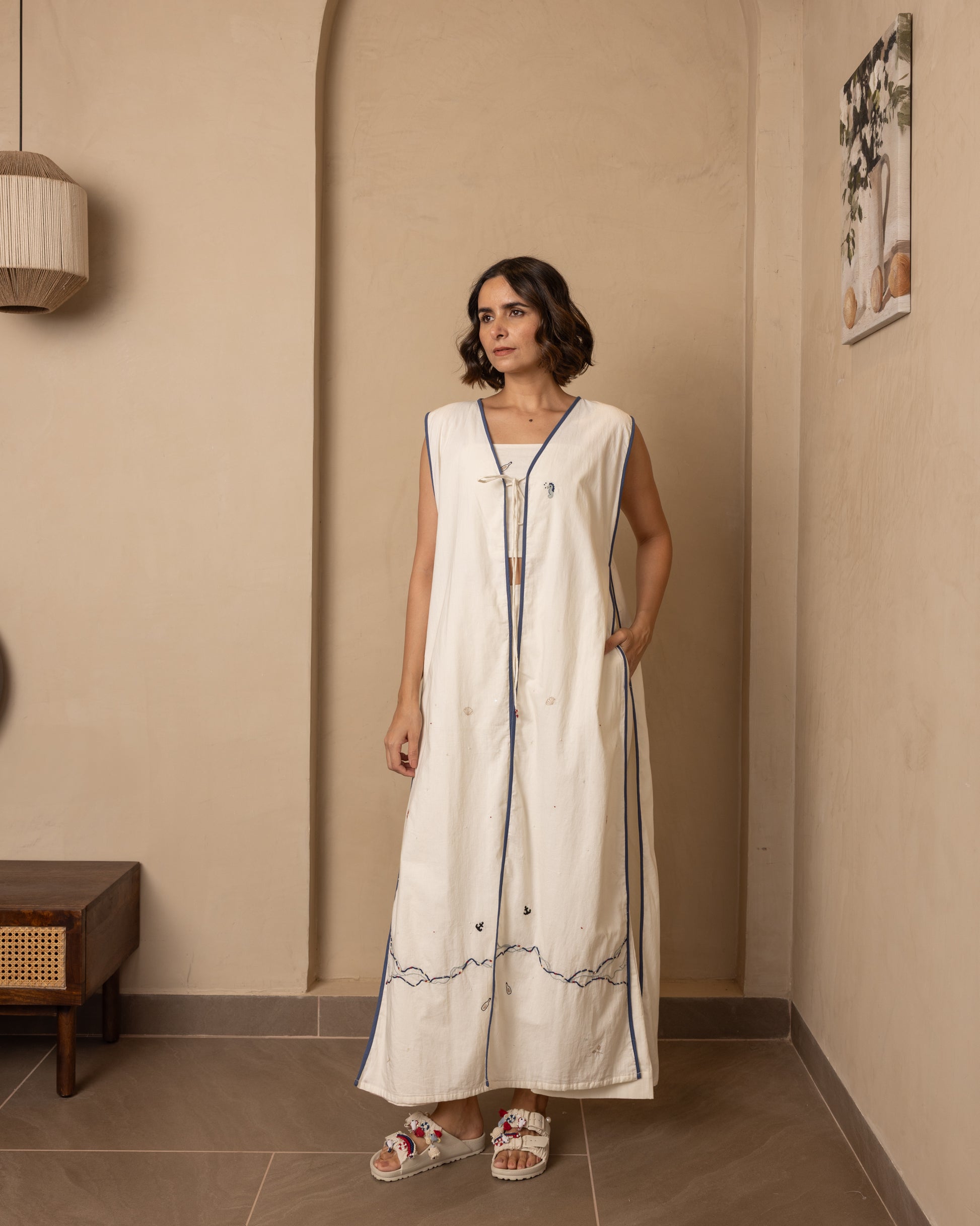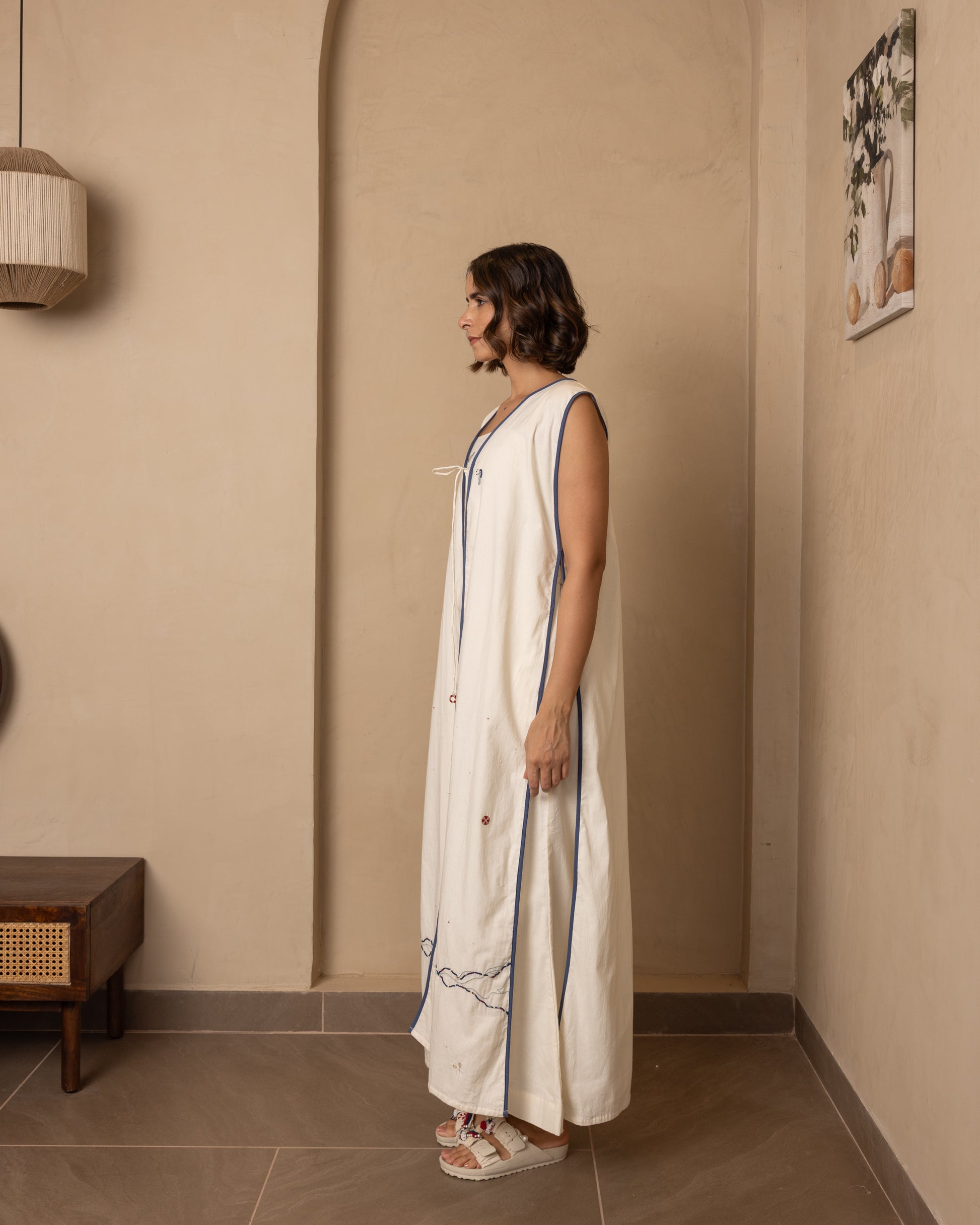 Intricate shoulder-to-sleeve lace detailing adds a touch of femininity and grace, while embroidered buttons along the neckline offer a polished finish. A standout feature of this dress is the tassel detailing on the back yoke line, adding whimsical charm and a unique focal point to the ensemble