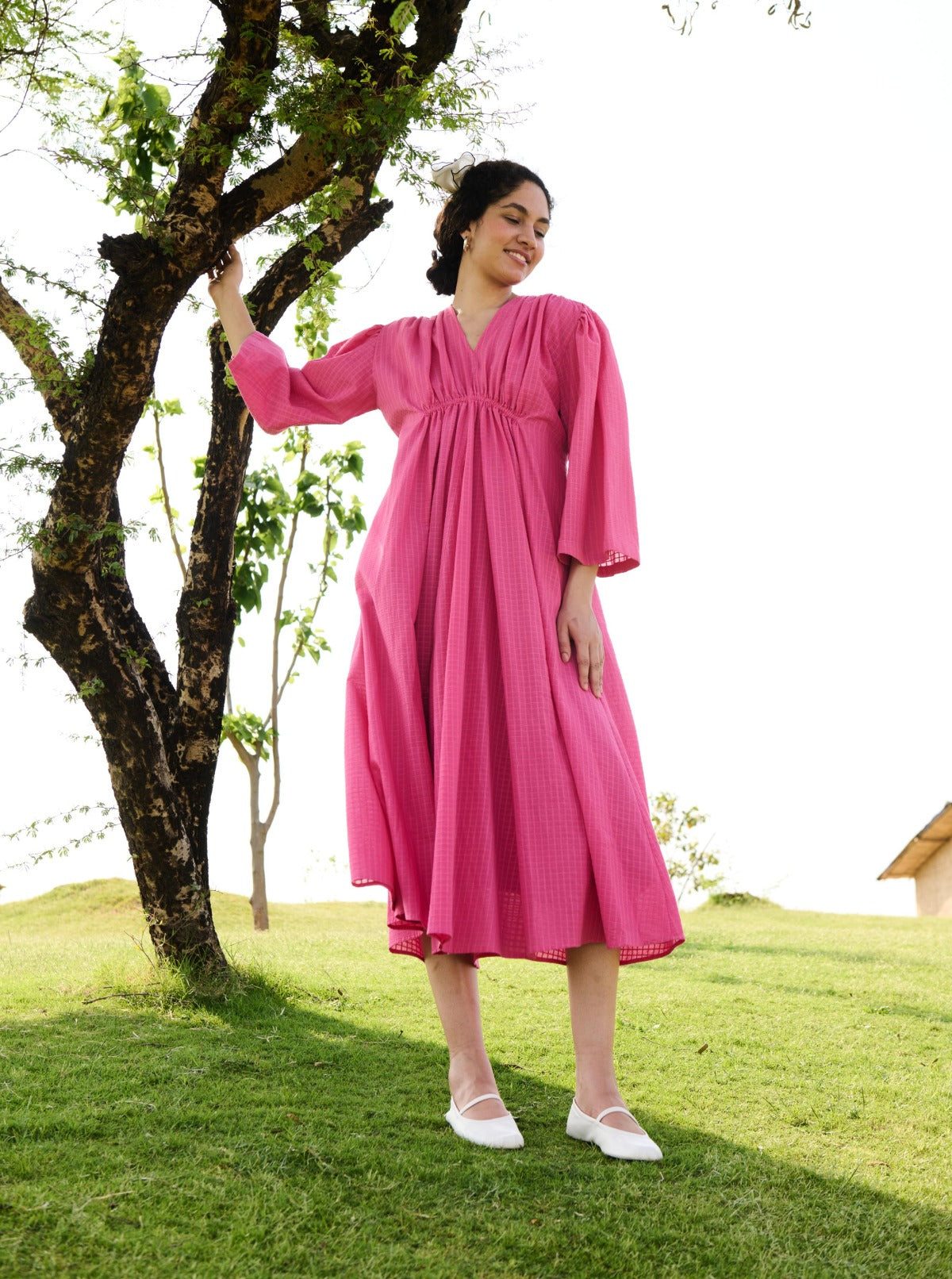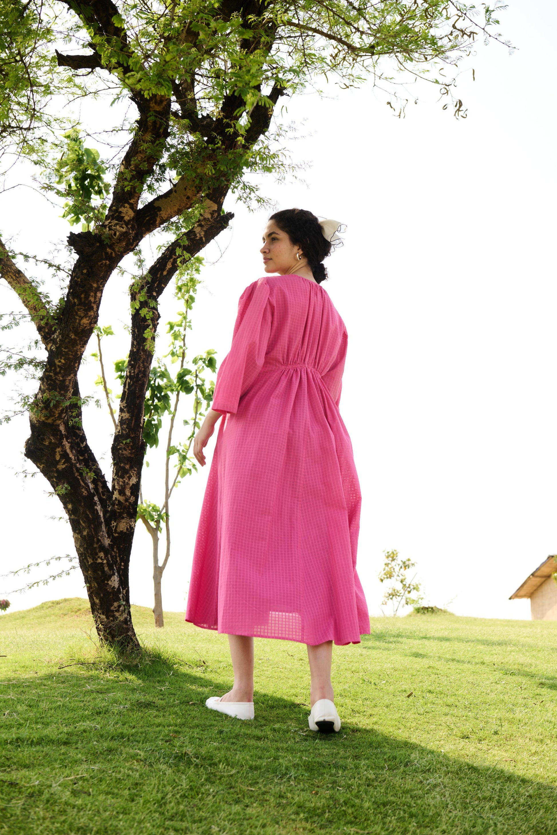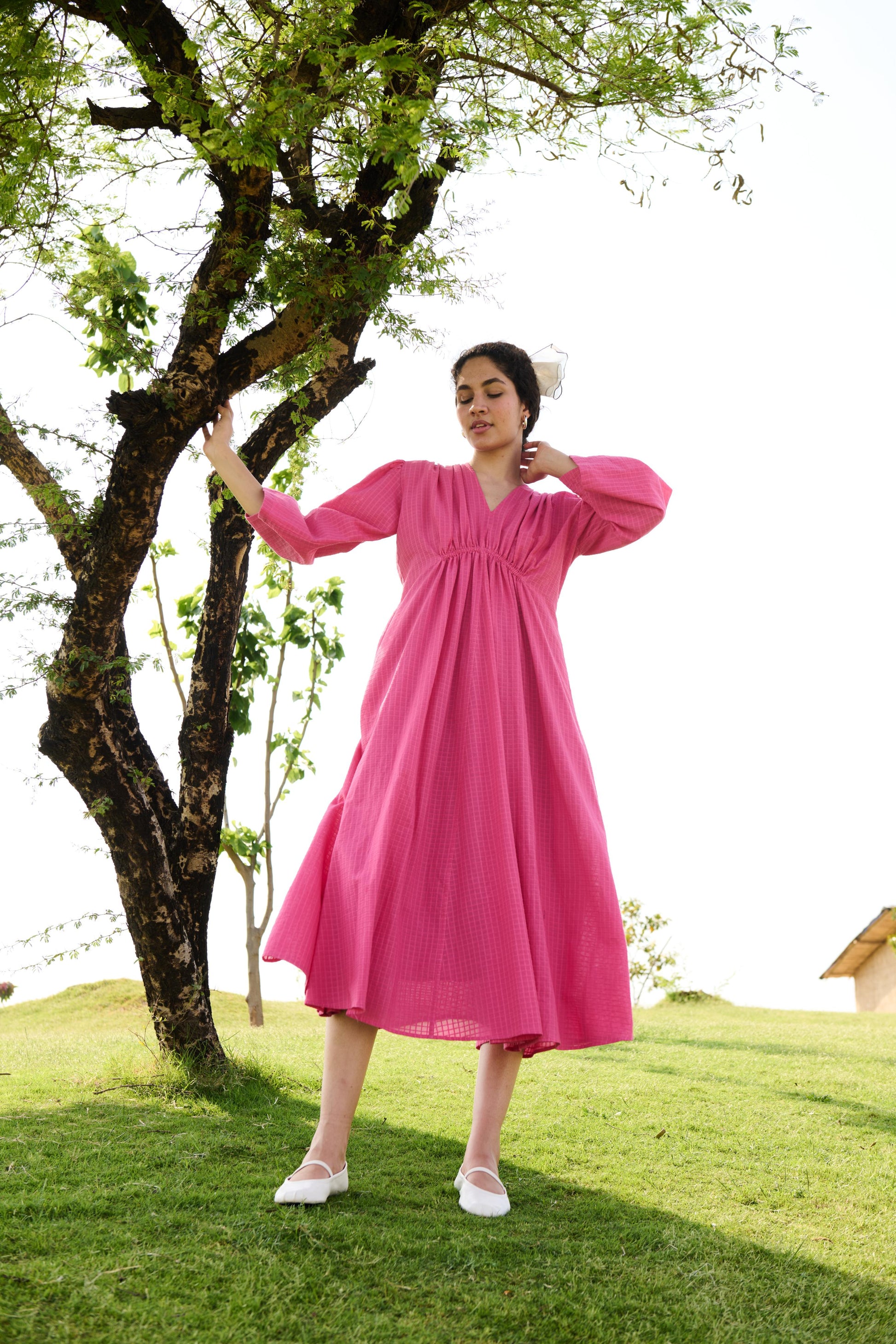 The Shringara dress is crafted with our checkered cotton fabric in the prettiest of azo free pink colour with elasticated detailing at the bust.