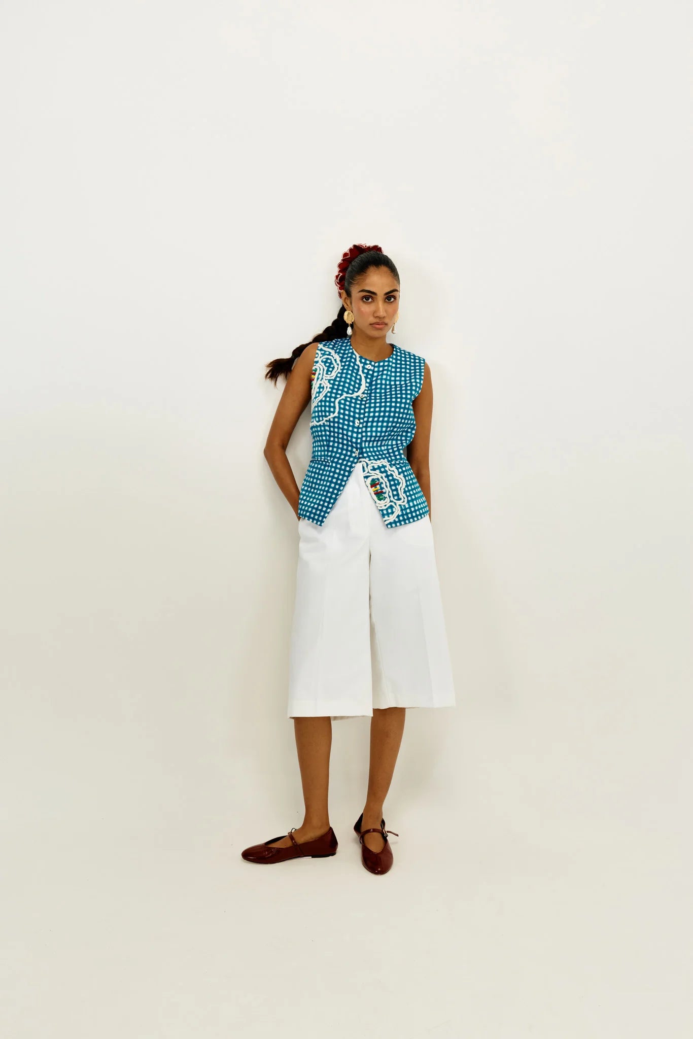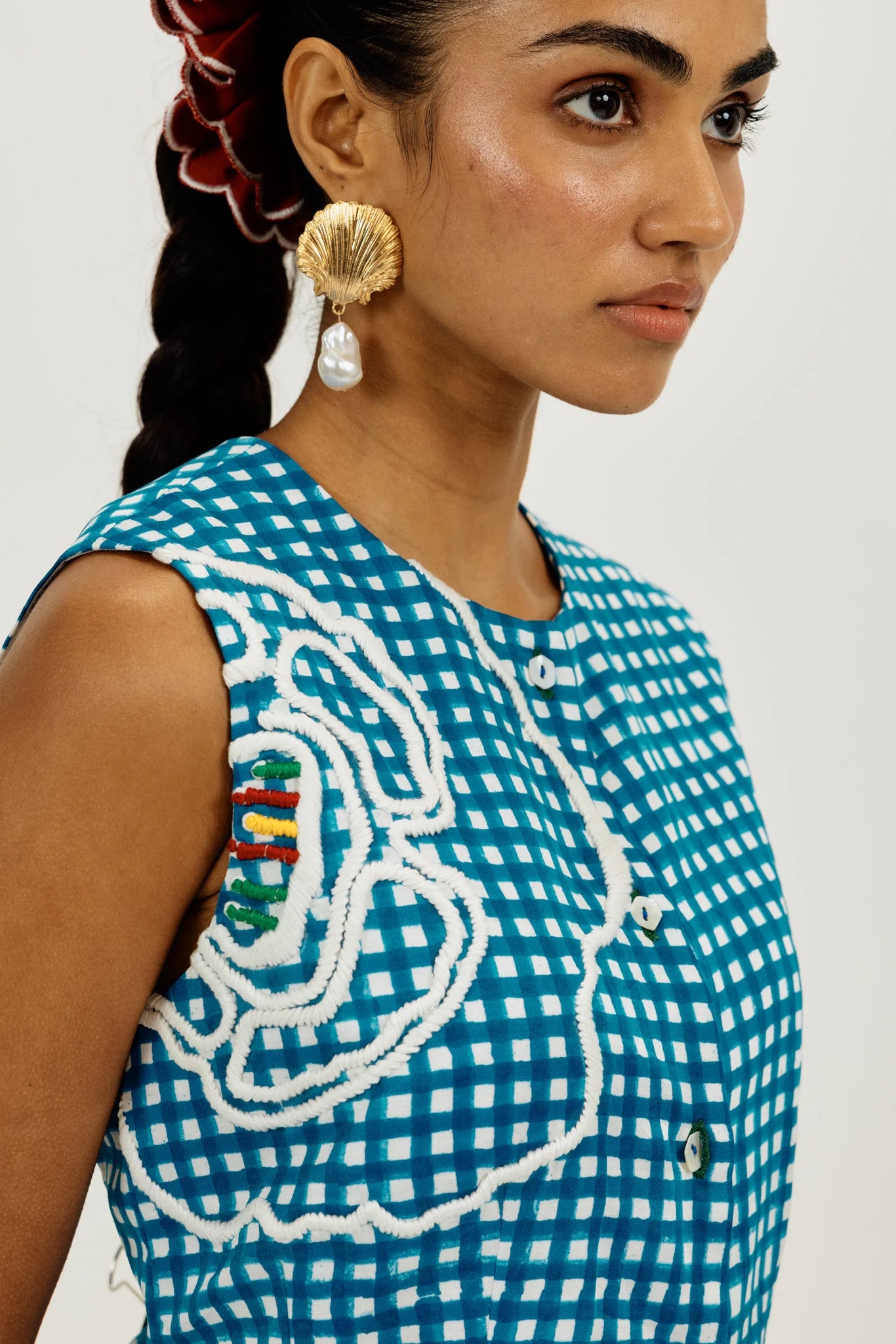Say hello to our power vest moment. Tailored in structured hand-block printed checks, this sleeveless number is elevated with bold thread-appliqué florals and playful pops of hand embroidery. The fitted silhouette and curved hem make it ideal for layering or wearing solo as a statement piece.