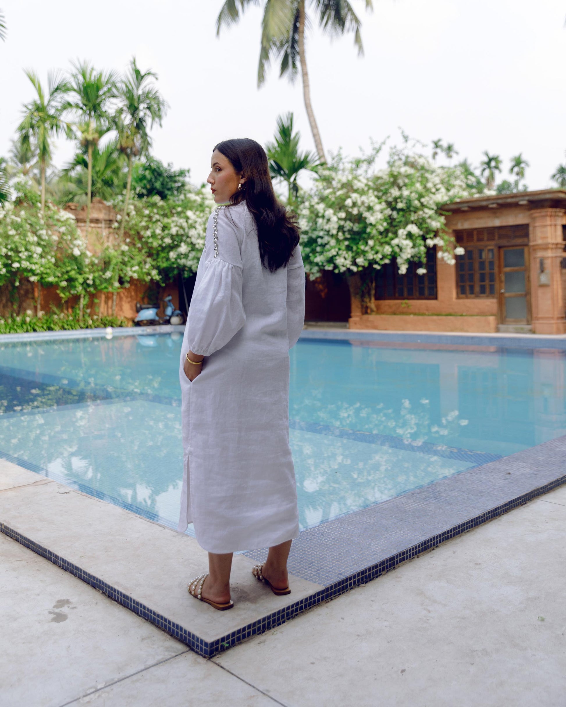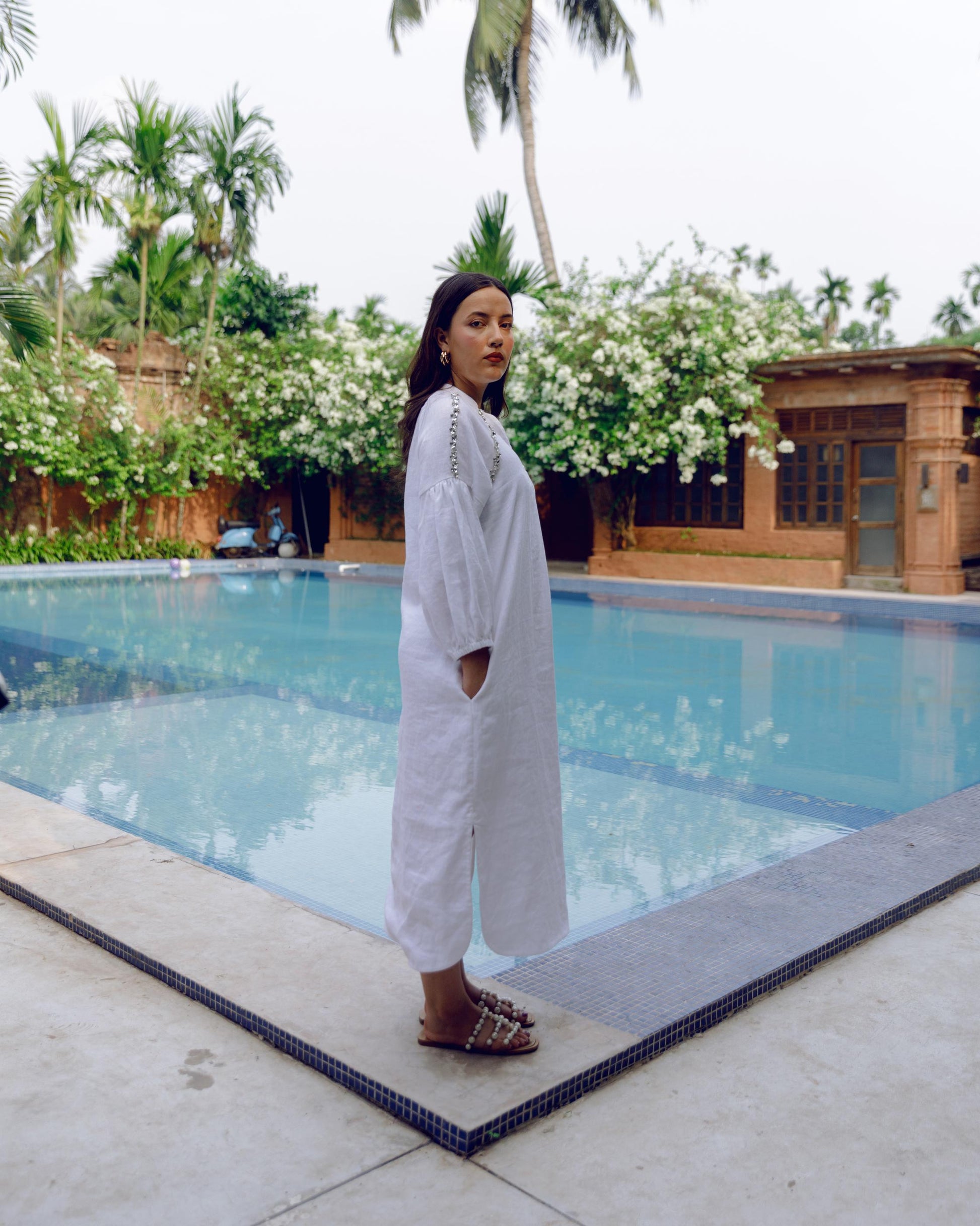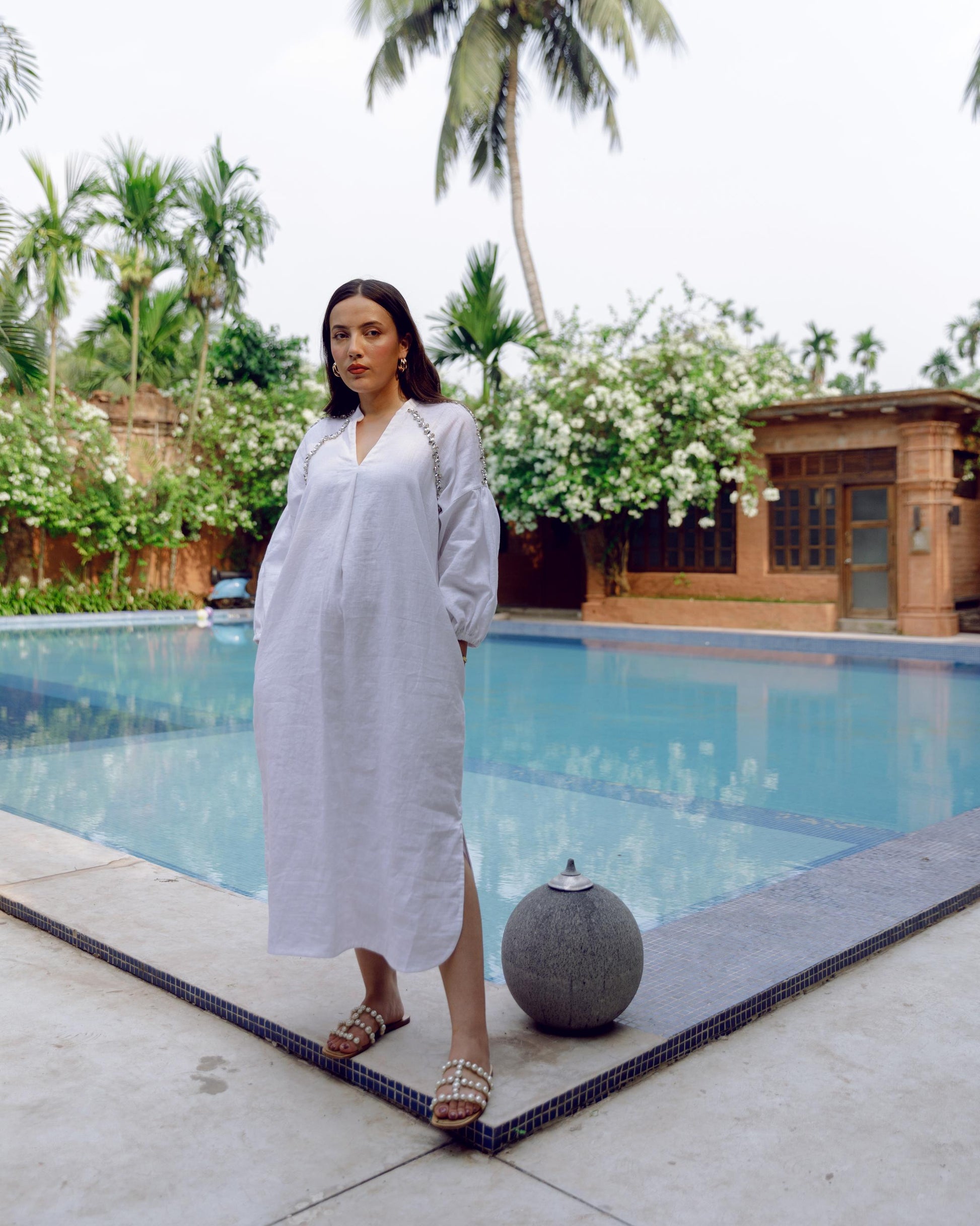 White linen straight cut midi dress with crystal embellishment. And again, it has pockets!