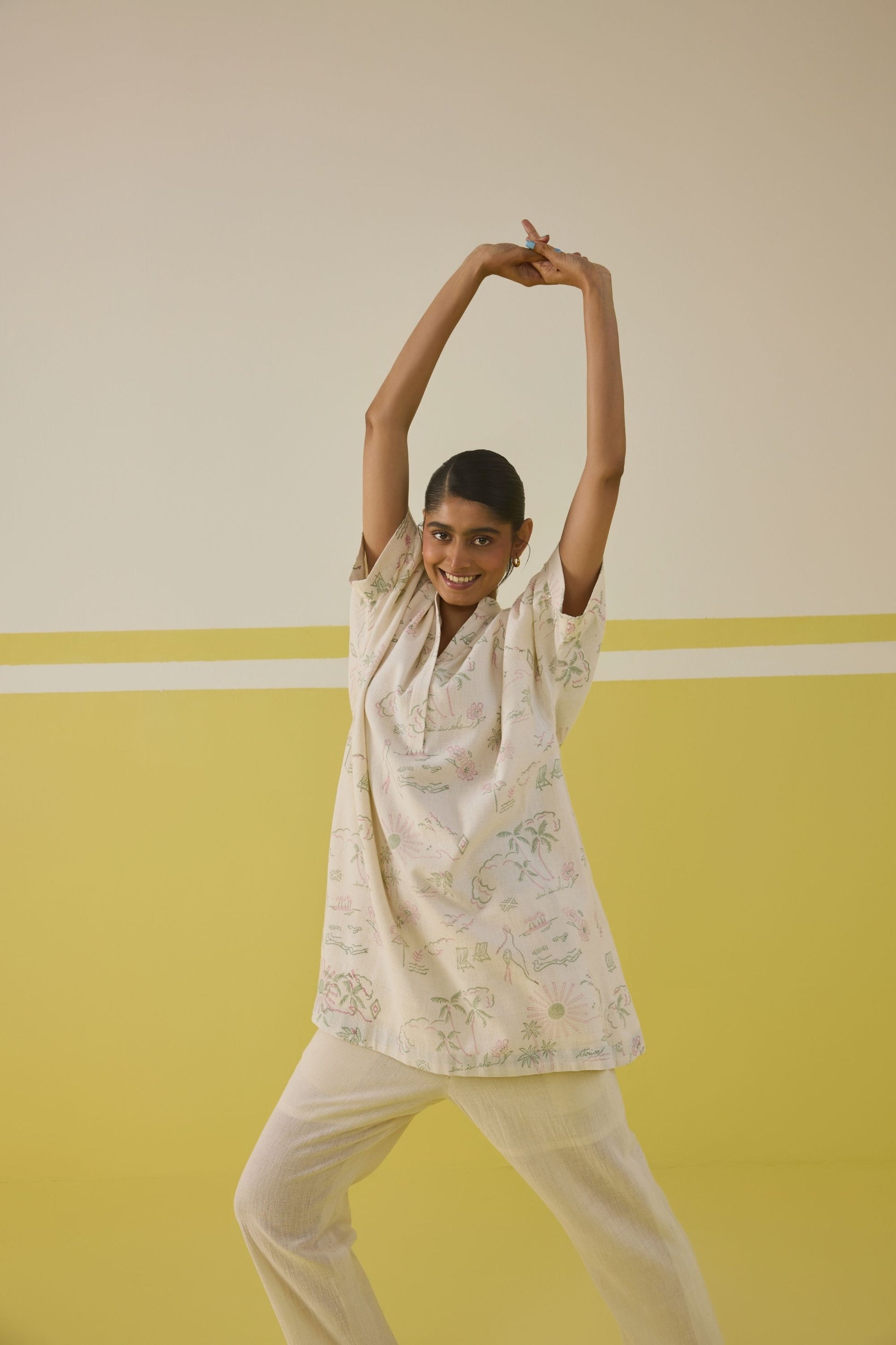 Relaxed fit, wide half sleeve, split crew neck kurta top crafted in handspun and handwoven organic cotton fabric, hand block printed with our signature summer-inspired motif using azo-free dyes.