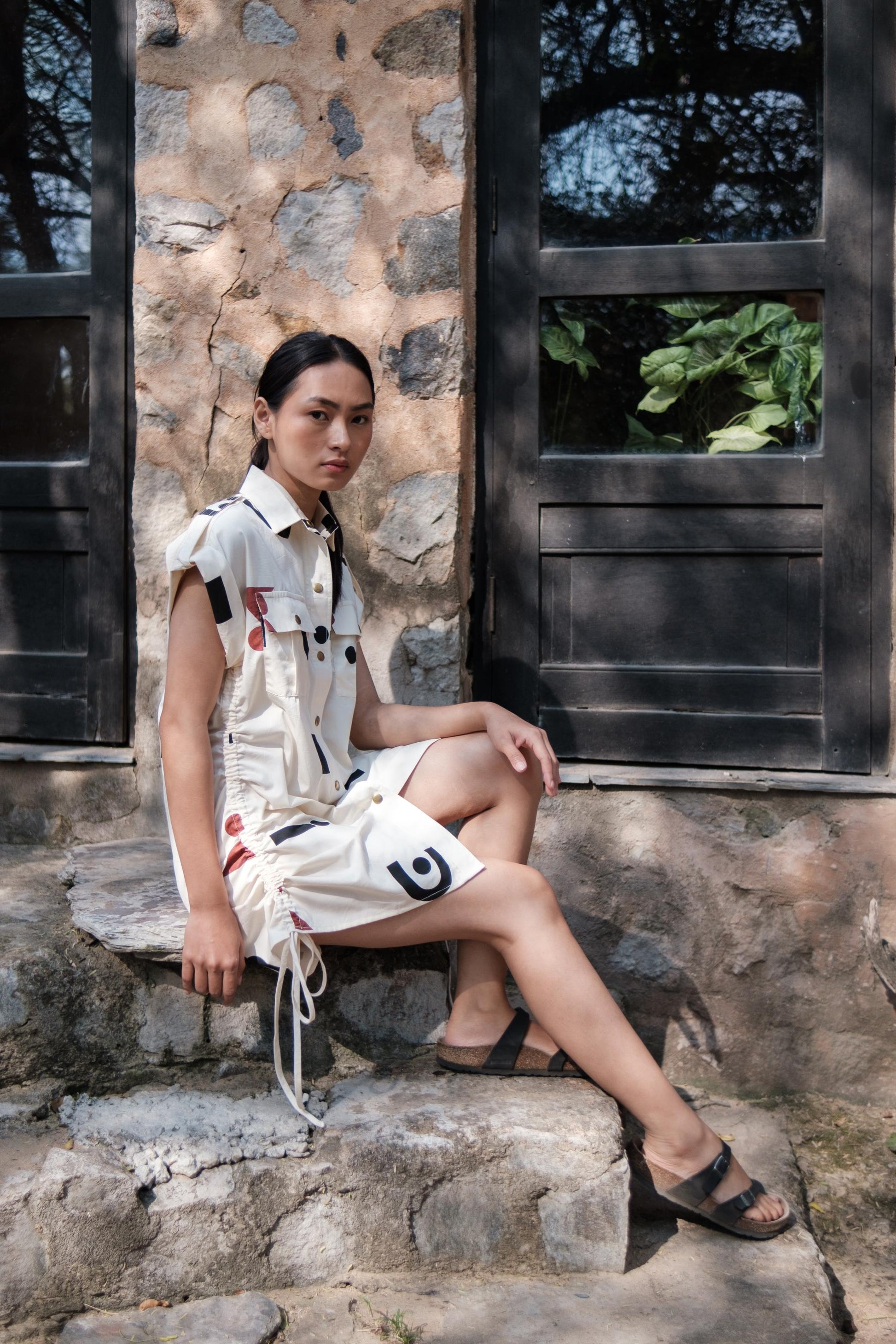 Sunrise Gather Dress Ecru Triangle Printed