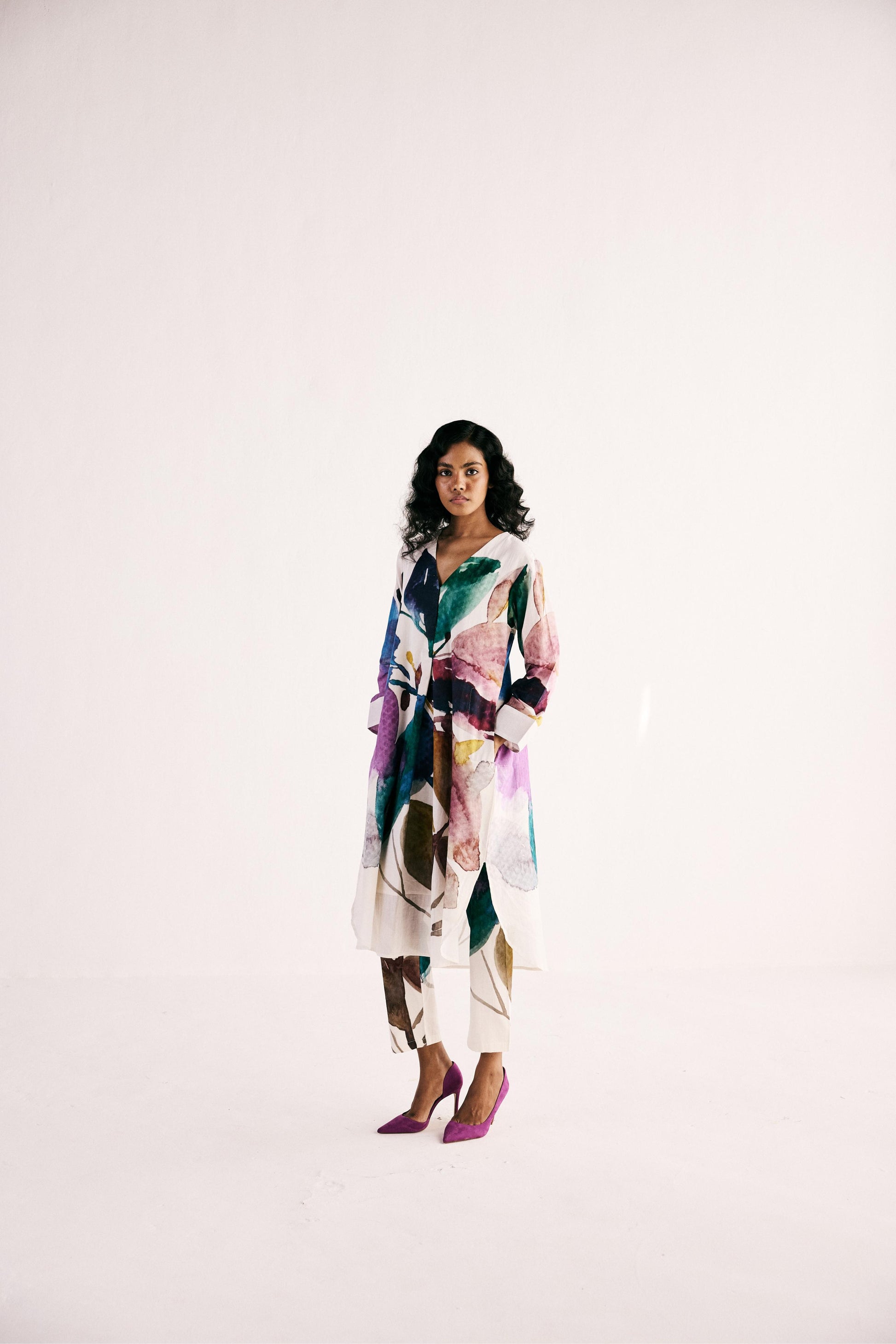 An off white vibrant floral printed kurta set with full sleeves and a v neckline crafted in soft cotton mul paired with floral printed mul pencil pants with elasticated back and front zipper opening with a button fastening.