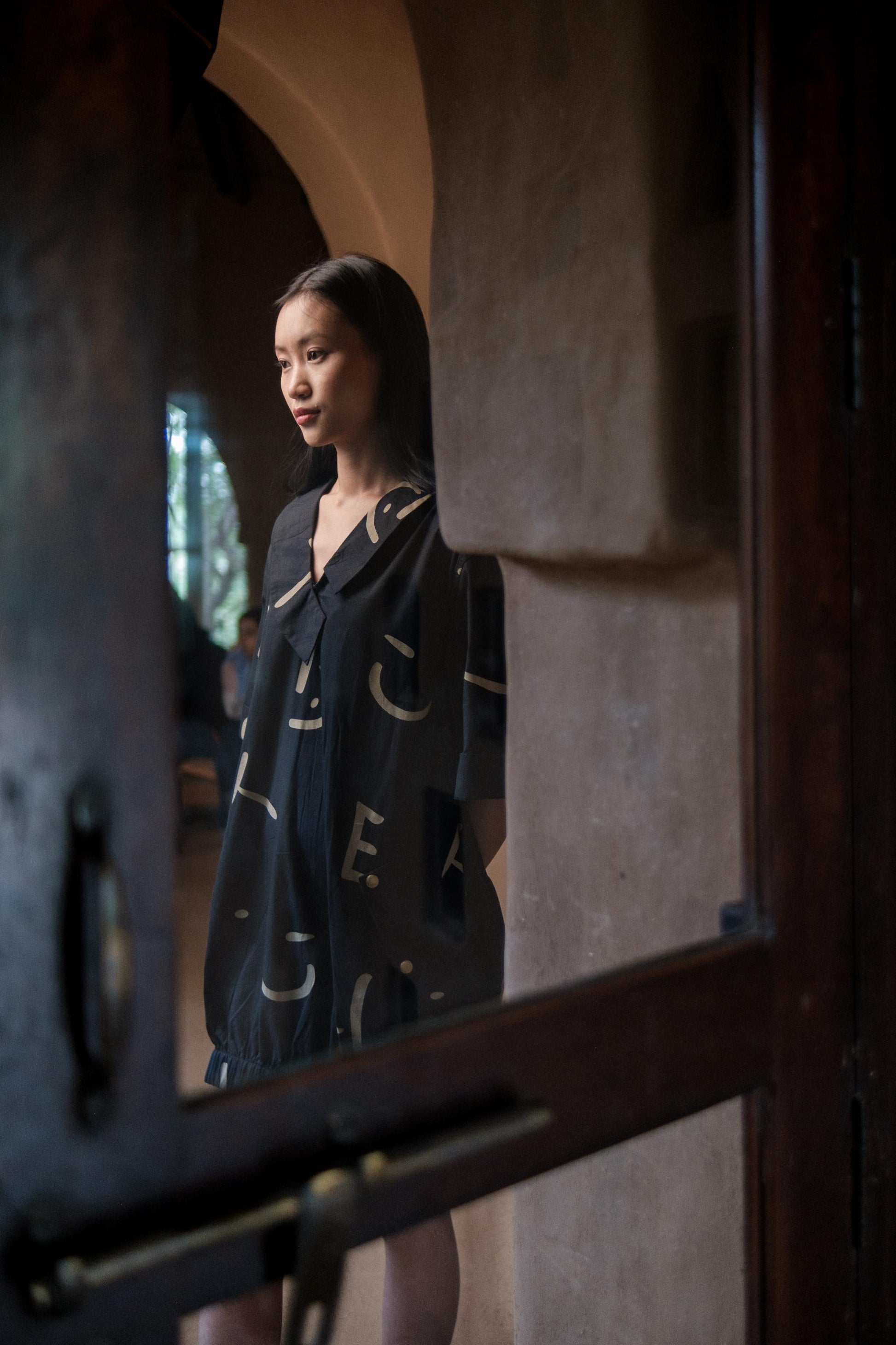 An oversized shift dress with elasticated hem detail , pockets and asymmetrical collar is the perfect defination of casual chic.