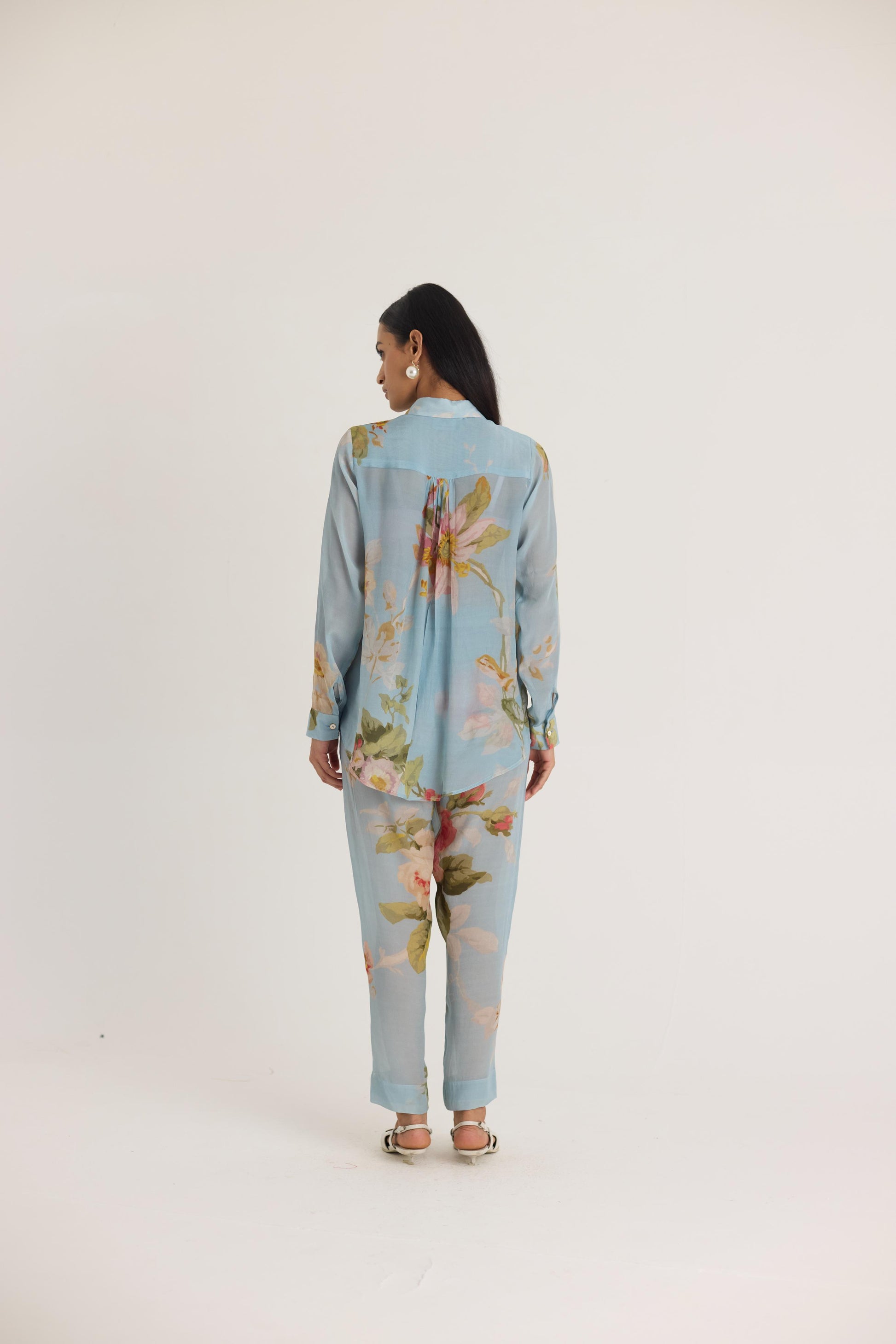 This sophisticated co-ord set features a classic button-down shirt paired with straight-leg trousers, both adorned with a striking watercolor floral print. The relaxed yet polished silhouette makes it a versatile choice for both casual and elevated styling.