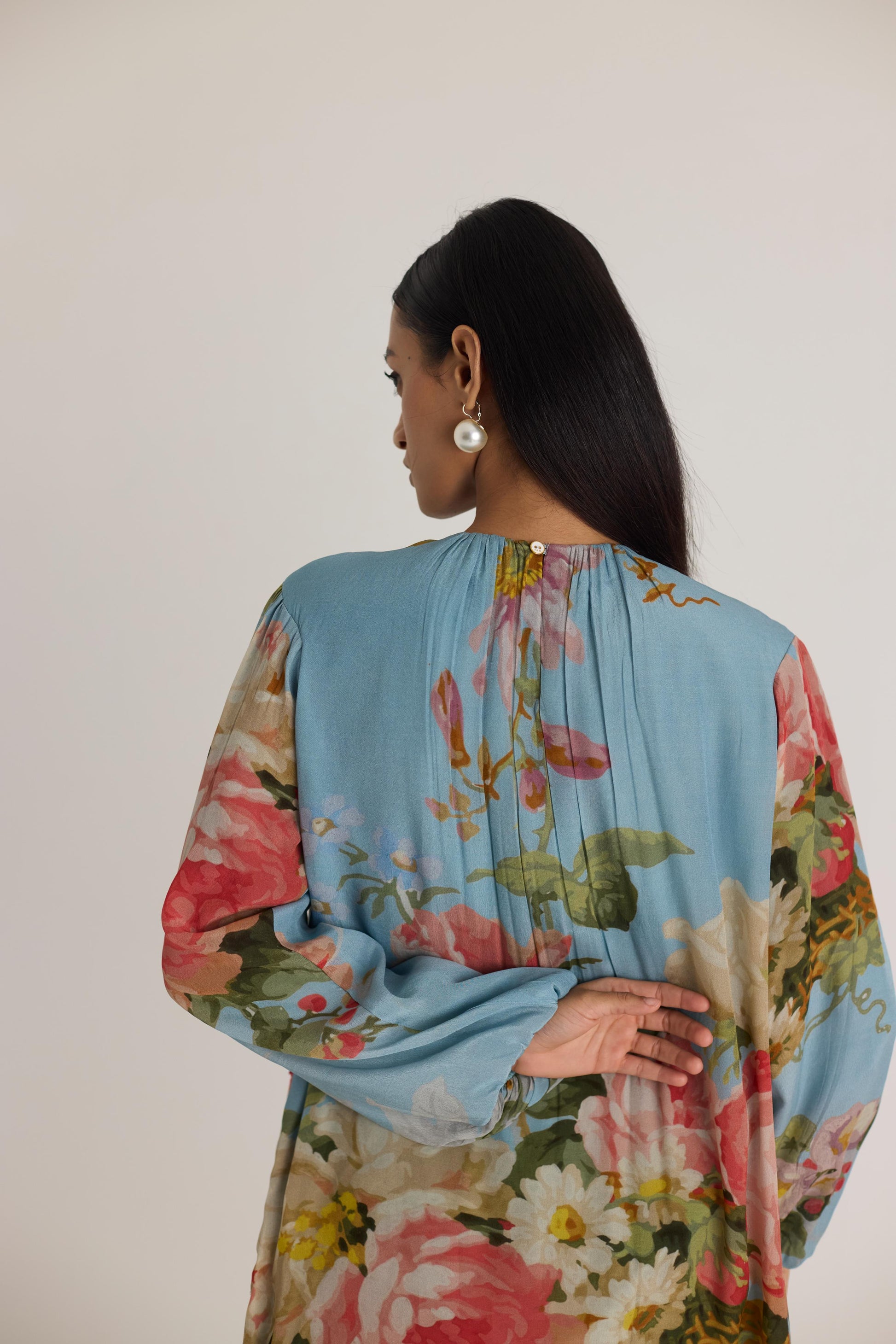 Step into effortless elegance with this Floral Breeze Mini Dress, crafted in a delicate sky blue base with blooming floral prints. adorned with oversized watercolor floral prints, evoking a sense of vintage charm and effortless grace. The print features lush blossoms in shades of blush pink, ivory, and green, giving the dress a delicate, hand-painted feel. Featuring a relaxed silhouette, billowing sleeves, and a softly gathered neckline, this dress embodies grace and comfort.