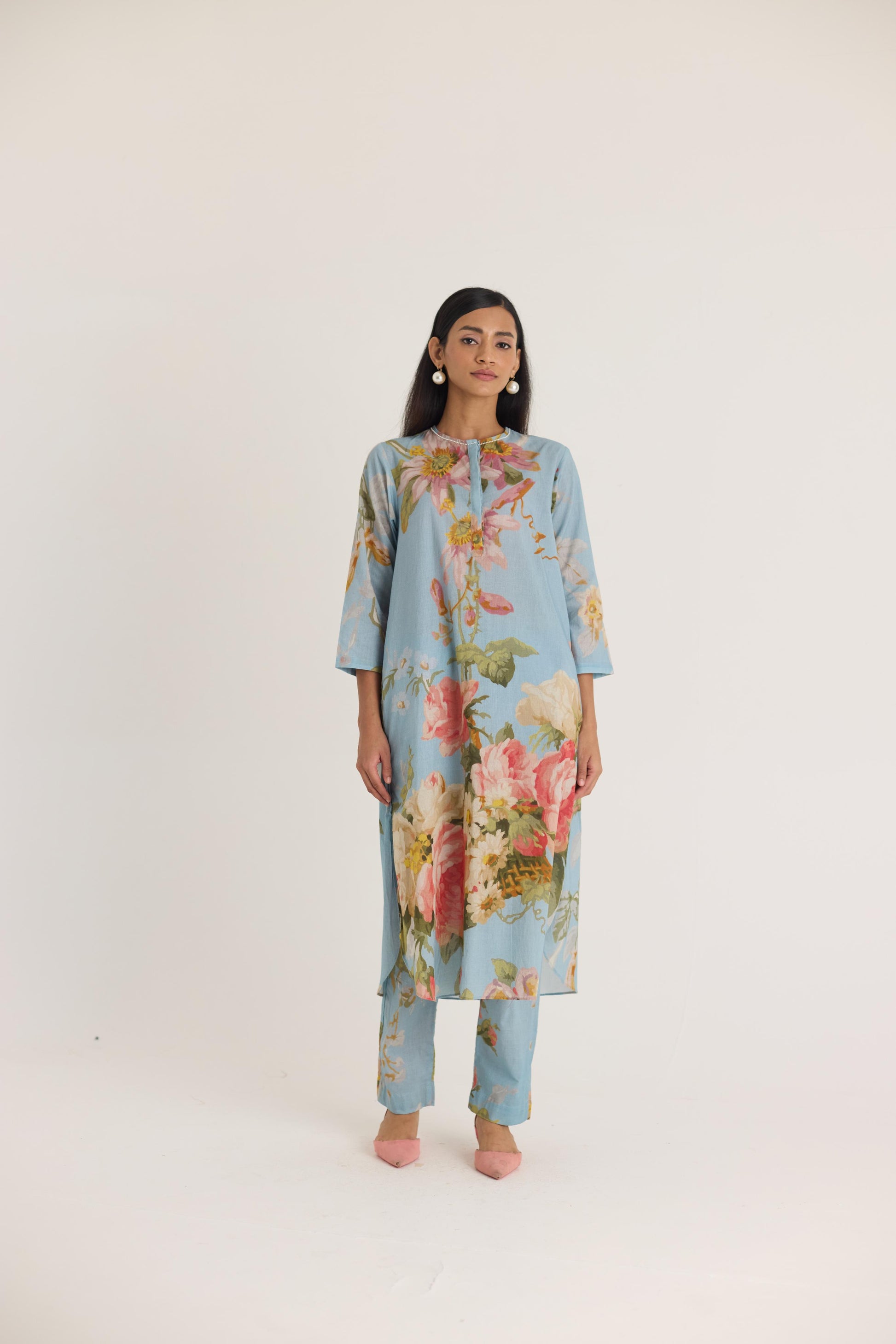 Step into effortless elegance with this beautifully crafted sky blue kurta set, adorned with delicate floral prints that exude grace and charm. Designed for the modern woman who appreciates comfort and style, this ensemble is perfect for both casual gatherings and festive occasions.