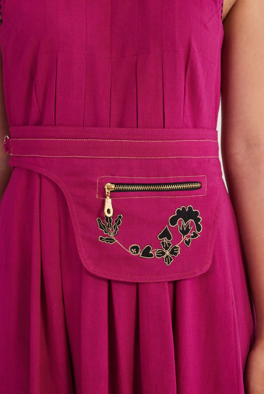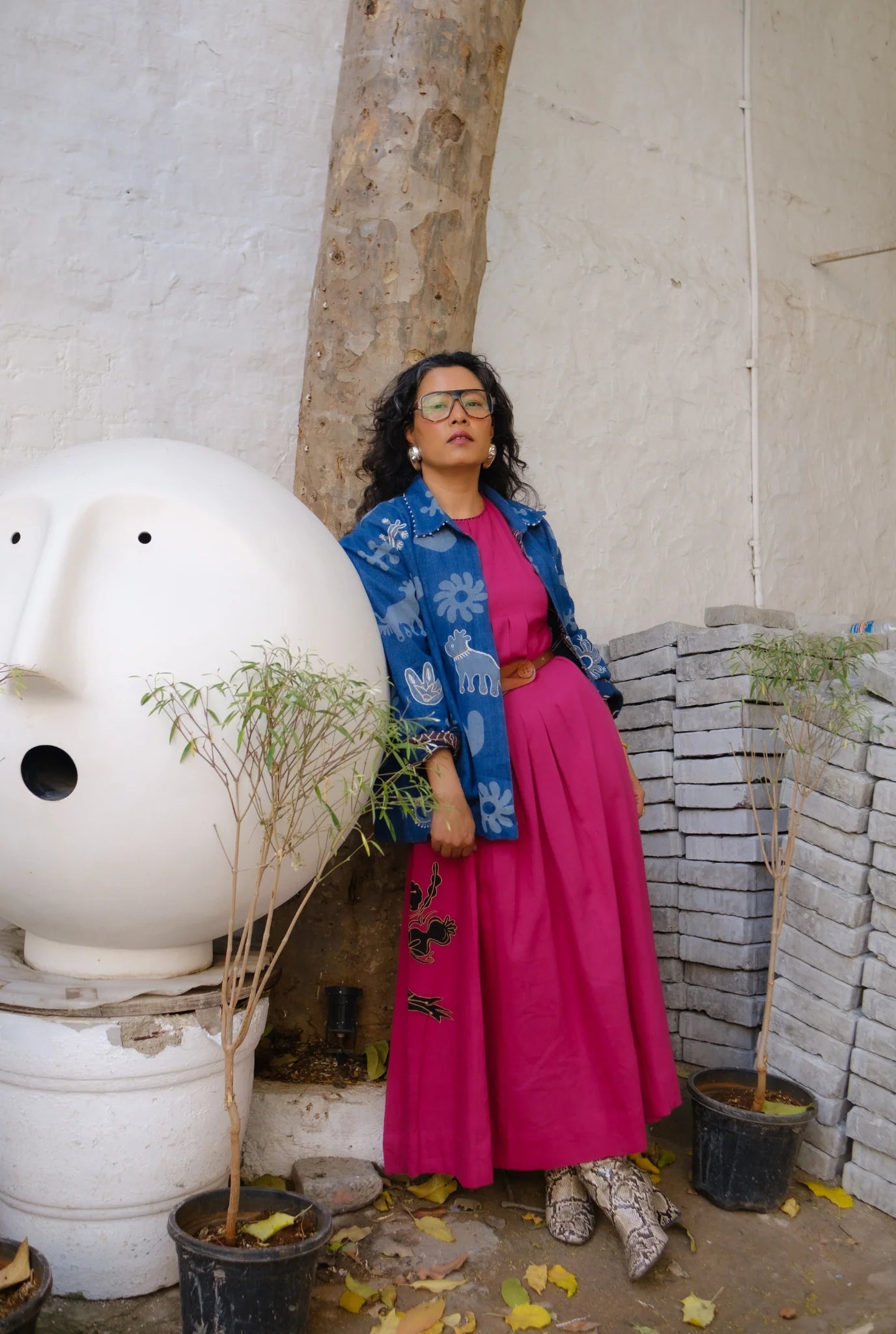 A burst of color, just in time for spring! This fit-and-flare dress is crafted from hand-dyed Kala cotton, featuring delicate appliqué on the front and hand embroidery along the neck and armholes. Easy, breezy, and full of charm.