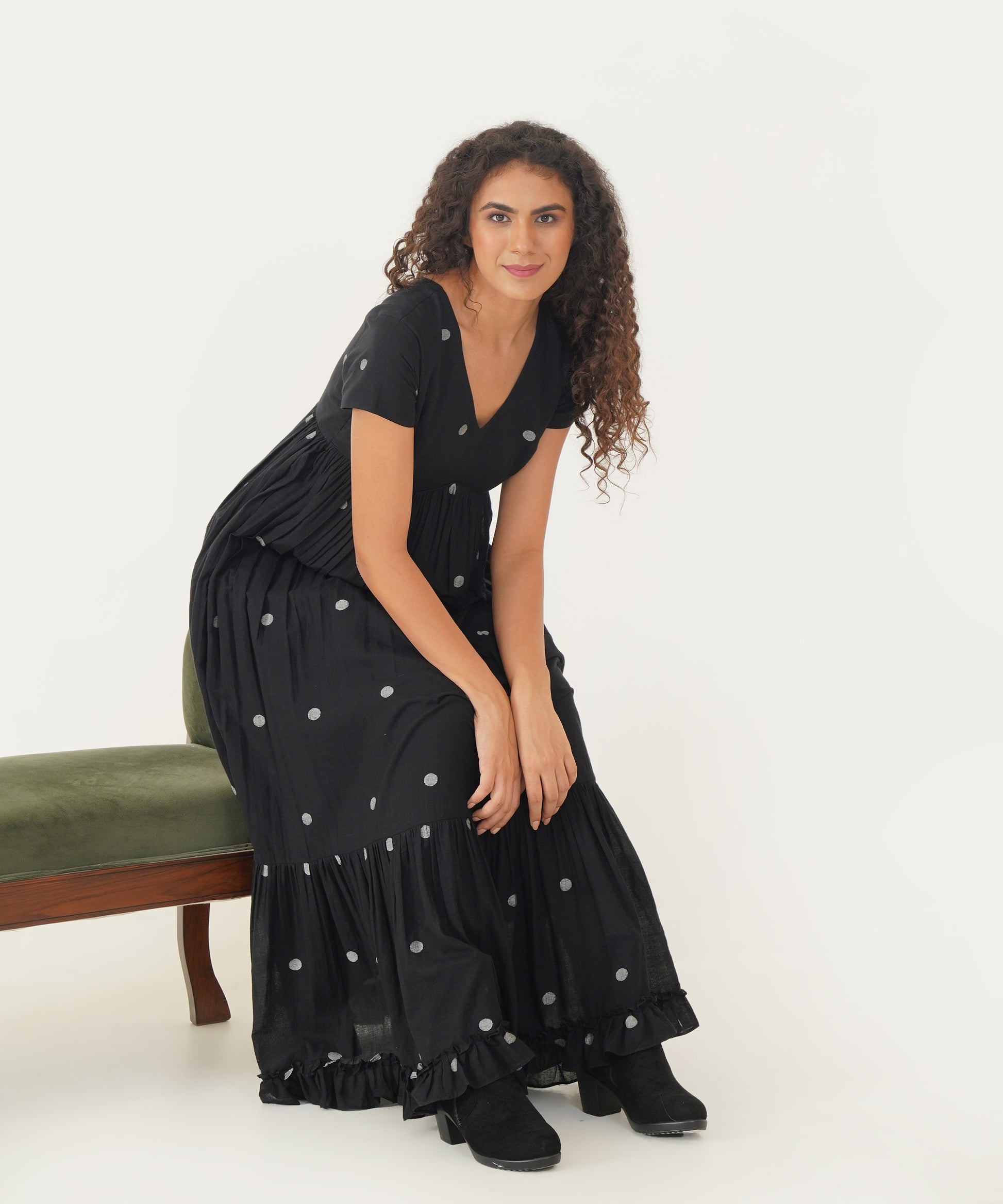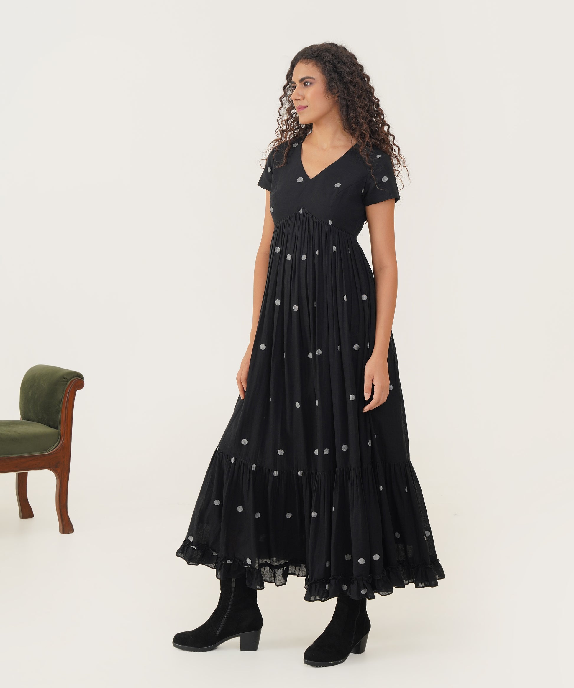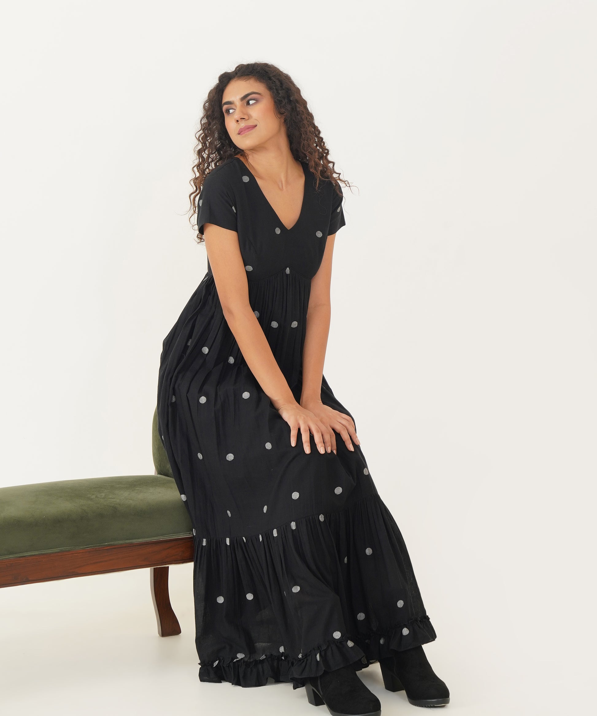 Embrace timeless elegance with our exquisite Jamdani dress. This masterpiece boasts a refined V-neckline and delicate cap sleeves, offering a classic and graceful silhouette. The gentle gathers enhance its flowy design, while the charming frill detailing at the hem adds a touch of playful sophistication. With a convenient back zipper fastening, this dress ensures a flawless fit and effortless style, perfect for making a memorable impression at any event.