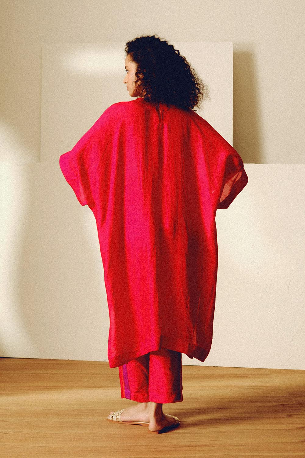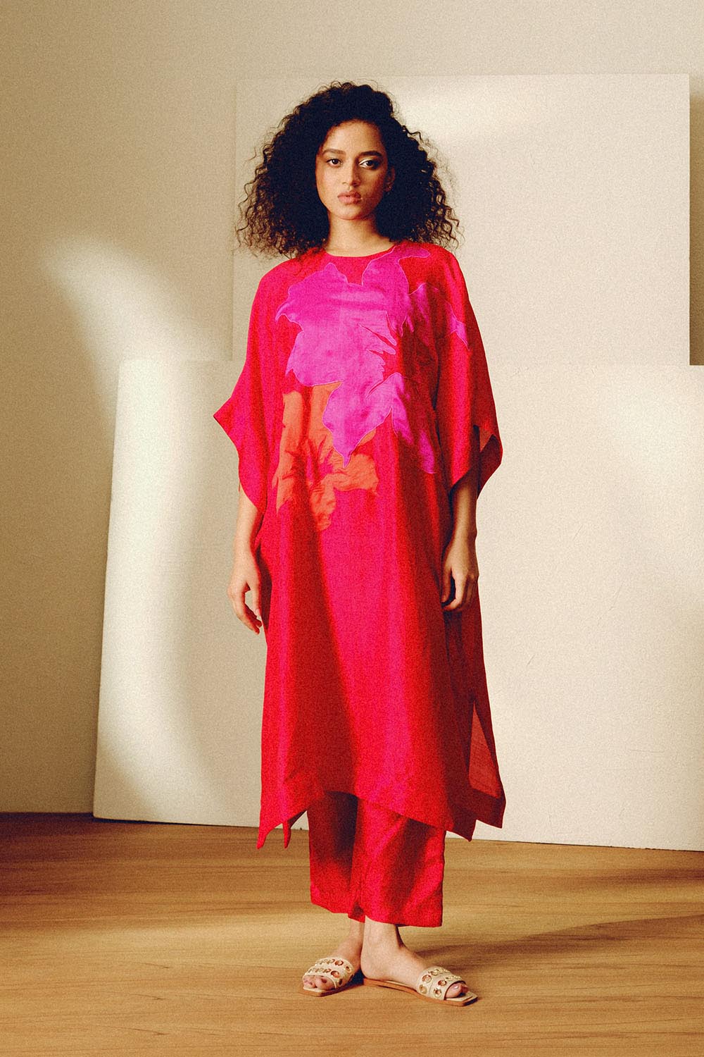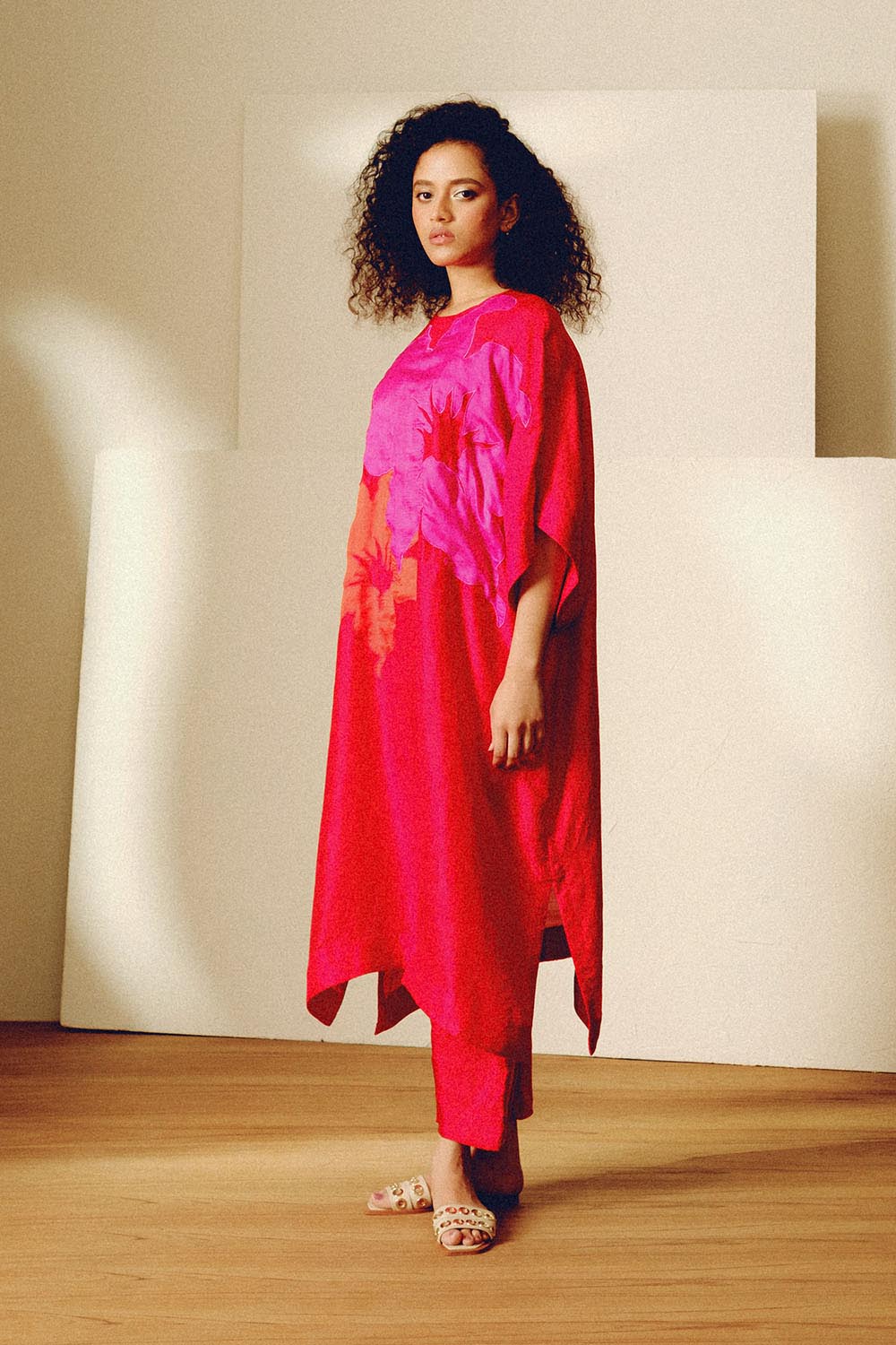 Handwoven mulberry silk free sized tunic with contrast floral applique and matching narrow pants. Tunic length- 44" Pant Length-37”